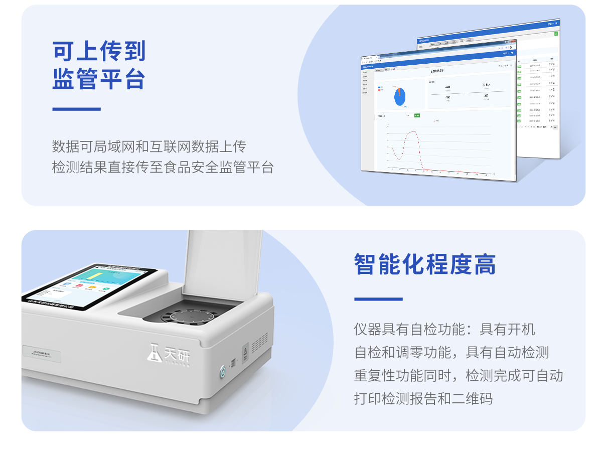 | 儀器采用臺(tái)式一體化系統(tǒng)檢測(cè)技術(shù),將分光光度模塊、新型農(nóng)殘檢測(cè)模塊、數(shù)字化管理模塊、無線通訊模塊高度集成于一體,支持檢測(cè)200種食品安全檢測(cè)項(xiàng)目,同時(shí)預(yù)留升級(jí)檢測(cè)方法。 | 儀器檢測(cè)模塊標(biāo)準(zhǔn)化、智能化,可隨意自由組合。檢測(cè)箱體內(nèi)置多個(gè)標(biāo)準(zhǔn)檢測(cè)單元,檢測(cè)模塊可以調(diào)整配置。 | 儀器采用全新安卓智能系統(tǒng),主控芯片采用 ARM Cortex-A7,RK3288/4核處理器,10.1寸高清液晶觸摸豎屏,更加**的UI交互界面,運(yùn)轉(zhuǎn)快捷;儀器配備無線通信模塊: 4G(APN)通訊模塊、Wifi模塊,藍(lán)牙傳輸,同時(shí)具有雙USB接口以及RJ45接口能以多種方式實(shí)現(xiàn)數(shù)據(jù)保存和數(shù)據(jù)傳輸功能。 | 創(chuàng)新檢測(cè)模式: | ★檢測(cè)通道:≥12通道;采用精密旋轉(zhuǎn)比色池設(shè)計(jì),使用同芯片同光源校準(zhǔn)精度,解決不同光源之間的誤差值。1-12通道間誤差0.1%。(**號(hào):ZL202022821055.2) | ★儀器具有自動(dòng)識(shí)別比色皿檢測(cè)功能,即:將樣品比色皿放入儀器后,點(diǎn)擊樣品檢測(cè),儀器自動(dòng)識(shí)別比色皿進(jìn)行通道檢測(cè)。 | 進(jìn)口高精光源: | 高精度進(jìn)口四波長冷光源,通道配置 410、520、590、630nm 波長光源,一個(gè)光源芯片驅(qū)動(dòng)一個(gè)光源,誤差極小,每臺(tái)設(shè)備單獨(dú)**校準(zhǔn)光源,**比對(duì),同時(shí)參照四種不同波段光源全方位覆蓋市面上99%的農(nóng)殘食品項(xiàng)目檢測(cè)。 | 智能化操作系統(tǒng): | 便捷操作系統(tǒng):設(shè)備檢測(cè)時(shí)可在同一檢測(cè)界面自動(dòng)對(duì)應(yīng)相關(guān)檢測(cè)通道一次性選擇1-12個(gè)樣品名稱,無須退出界面,節(jié)省操作時(shí)間。 | 數(shù)據(jù)集成系統(tǒng):設(shè)備首頁自動(dòng)統(tǒng)計(jì)檢測(cè)數(shù)據(jù)包含:周檢測(cè)數(shù)據(jù)、月檢測(cè)數(shù)據(jù),全部檢測(cè)總數(shù)量,均包含檢測(cè)總數(shù),合格數(shù),不合格數(shù),以及相關(guān)柱形分析圖,對(duì)各項(xiàng)檢測(cè)數(shù)據(jù)清晰掌握,無需電腦查詢,更加快捷直觀。 | 項(xiàng)目預(yù)設(shè)系統(tǒng):支持添加單個(gè)及多個(gè)相同或不相同的任務(wù)預(yù)設(shè),一鍵快速調(diào)取,每一個(gè)任務(wù)分別可以設(shè)置不同的樣品、批次、編號(hào)、來源、備注、抽樣信息、檢測(cè)信息、受檢信息、復(fù)核信息等更多信息。無縫鏈接平臺(tái)和APP實(shí)時(shí)查看下發(fā)任務(wù)。 | 數(shù)據(jù)監(jiān)管系統(tǒng):同步對(duì)接監(jiān)管平臺(tái),數(shù)據(jù)可局域網(wǎng)和互聯(lián)網(wǎng)數(shù)據(jù)上傳,檢測(cè)結(jié)果可選擇直接傳至食品安全監(jiān)管平臺(tái)。集成OSS輸出存儲(chǔ)服務(wù)、區(qū)分設(shè)備定向管理應(yīng)用,進(jìn)行區(qū)域食品安全監(jiān)管及大數(shù)據(jù)分析處理與數(shù)據(jù)統(tǒng)計(jì),檢測(cè)區(qū)域食品安全長短期動(dòng)態(tài),達(dá)到食品安全問題預(yù)估、預(yù)警。 | 自定義打印系統(tǒng):內(nèi)置全新打印系統(tǒng),新創(chuàng)自定義打印方式,可按需靈活設(shè)置開啟或關(guān)閉:產(chǎn)品合格證(國家農(nóng)業(yè)部標(biāo)準(zhǔn)要求),二維碼,抽樣信息、檢測(cè)信息,受檢信息、復(fù)核信息、抽樣日期、檢測(cè)日期等信息的打印。 | 系統(tǒng)遠(yuǎn)程更新功能:可定向分客戶分儀器更新系統(tǒng),按照不同客戶后期實(shí)際需求添加項(xiàng)目,無需機(jī)器返廠,即可遠(yuǎn)程實(shí)時(shí)升級(jí)全新系統(tǒng),節(jié)省時(shí)間成本及避免運(yùn)輸造成設(shè)備損壞。 | 儀器主機(jī)采用一體化防水、抗壓、防撞擊、防腐蝕箱體設(shè)計(jì),同時(shí)配備交直流供電,可連接車載電源,可選配大容量充電鋰電池,滿足現(xiàn)場野外檢測(cè)需求。 | 安全證書,放心保障:儀器具有中國計(jì)量科學(xué)研究院校準(zhǔn)證書,**認(rèn)證。 |