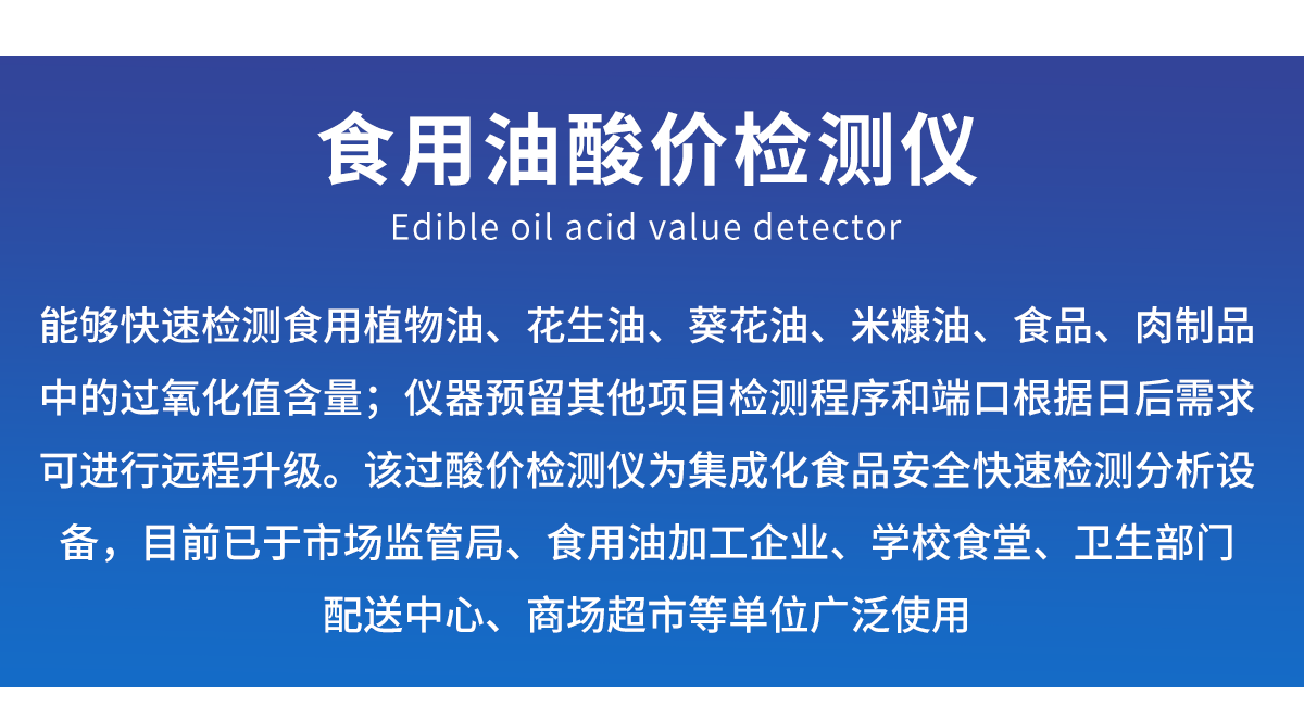 廣泛應(yīng)用于質(zhì)量監(jiān)督檢驗(yàn)、工商管理、油炸食品生產(chǎn)基地、食藥監(jiān)局、衛(wèi)生部門、肉制品食品深加工企業(yè)、商場超市、各大食品安全監(jiān)測(cè)系統(tǒng)等單位使用。