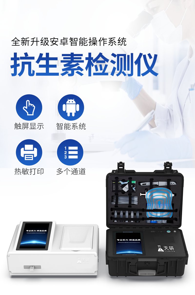 山東天研儀器有限公司生產(chǎn)的高智能食品安全檢測儀為集成化食品安全快速檢測分析設備,采用臺式一體化設計,可快速檢測200多種食品安全項目,包含非食用化學物質(zhì)、濫用食品添加劑、農(nóng)藥殘留、獸藥殘留、重金屬、病害肉、營養(yǎng)強化劑、抗生素類殘留、激素類殘留、真菌毒素類殘留、化學類殘留等項目的定性定量檢測。目前廣泛應用于市場監(jiān)管局、檢測中心、衛(wèi)生監(jiān)督部門、農(nóng)業(yè)部門、院校及各單位食堂、食品肉產(chǎn)品深加工企業(yè)、商超市場、司法部門、餐飲機構(gòu)、養(yǎng)殖場、屠宰場、檢驗檢疫部門等單位。