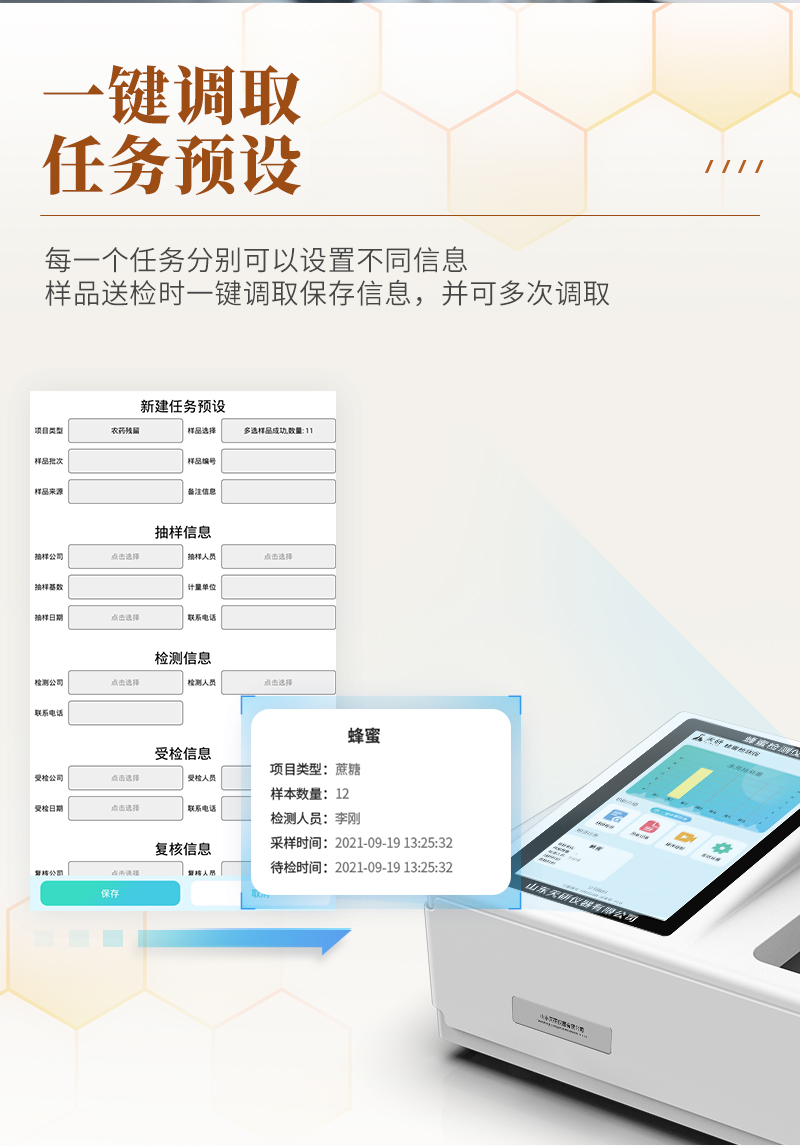 儀器采用臺式一體化系統(tǒng)檢測技術(shù),將分光光度模塊、數(shù)字化管理模塊、無線通訊模塊高度集成于一體,支持檢測200種食品安全檢測項目,同時預(yù)留升級檢測方法。儀器檢測模塊標(biāo)準(zhǔn)化、智能化,檢測項目可隨意自由組合。檢測箱體內(nèi)置多個標(biāo)準(zhǔn)檢測單元,檢測模塊可以調(diào)整配置。 顯示屏幕:儀器采用10.1英寸豎向液晶觸摸屏顯,搭配運(yùn)行安卓智能操作系統(tǒng),主控芯片采用ARM Cortex-A7,RK3288/4核處理器,主頻1.88Ghz,操作方便,性能更強(qiáng)。 檢測通道:≥12通道;采用精密旋轉(zhuǎn)比色池設(shè)計,使用同芯片同光源校準(zhǔn)精度,解決不同光源之間的誤差值,更加準(zhǔn)確**。(1-12通道間誤差0.1%,**號:ZL202022821055.2) 儀器光源:高精度進(jìn)口四波長冷光源,每個通道均配置 410、520、590、630nm 波長光源,標(biāo)配**的光路切換裝置,**光路切換功能可實現(xiàn)64波長,并且所有檢測項目可實現(xiàn)所有通道同時檢測。 設(shè)備可一鍵校準(zhǔn),自動保存校準(zhǔn)數(shù)據(jù),自動對比校驗,得到精準(zhǔn)光源,采用Android SP存儲數(shù)據(jù),光源數(shù)據(jù)永不丟失,方便每一次使用。 通訊接口:配備無線通信模塊、可選配4G(APN)通訊模塊和藍(lán)牙傳輸,同時具有雙USB接口以及RJ45網(wǎng)線接口,可以多方式實現(xiàn)數(shù)據(jù)保存及數(shù)據(jù)傳輸。存儲方式:支持U盤存儲,標(biāo)準(zhǔn)USB接口,免驅(qū)動安裝。檢測結(jié)果存儲容量20萬條以上,可生成Excel表格進(jìn)行拷貝,并具有登錄保護(hù)功能。智能化操作系統(tǒng):1)操作系統(tǒng):儀器可在同一檢測界面自動對應(yīng)相關(guān)檢測通道,一次性選擇1-12個樣品名稱,無需退出界面,節(jié)省操作時間。并可以對每個通道屬性和樣品信息單獨進(jìn)行編輯,例如送檢單位、人員,檢測人員等,打印時勾選打印顯示。2)數(shù)據(jù)集成系統(tǒng):設(shè)備首頁自動匯總分析檢測數(shù)據(jù),包含:周檢測數(shù)據(jù)、月檢測數(shù)據(jù),全部檢測總數(shù)量,均包含檢測總數(shù),合格數(shù),不合格數(shù),以及相關(guān)柱形分析圖,各項檢測數(shù)據(jù)一目了然,無需電腦查詢,更加快捷直觀。3)數(shù)據(jù)庫系統(tǒng):十幾項數(shù)據(jù)庫分類管理儀器:包含項目類型、項目數(shù)據(jù)、檢測數(shù)據(jù)、歷史記錄、國標(biāo)信息、曲線信息、采樣信息、檢測信息、受檢信息、復(fù)核信息、圖表信息、光源校準(zhǔn)信息、打印樣式信息、樣品庫信息等等,數(shù)據(jù)庫之間互相協(xié)調(diào)聯(lián)動保證數(shù)據(jù)的真實完整性。同時產(chǎn)品數(shù)據(jù)庫以及歷史檢測記錄支持一鍵檢索功能。4)限量規(guī)判系統(tǒng):具有限量查詢、添加物質(zhì)合規(guī)判定系統(tǒng)。檢測出結(jié)果后,系統(tǒng)自動調(diào)用系統(tǒng)數(shù)據(jù)庫中相關(guān)國標(biāo)進(jìn)行比對判定,客觀顯示判定結(jié)果是否合格。5)項目預(yù)設(shè)系統(tǒng):儀器具有任務(wù)預(yù)設(shè)模塊,一鍵提前預(yù)設(shè),給出方便快捷的新檢測方案,每一個任務(wù)分別可以設(shè)置不同的樣品、批次、編號、來源、備注、抽樣信息、檢測信息、受檢信息、復(fù)核信息等更多信息。樣品送檢時一鍵調(diào)取保存信息,并可多次調(diào)取,大大提高檢測效率。6)數(shù)據(jù)監(jiān)管系統(tǒng):同步對接監(jiān)管平臺,數(shù)據(jù)可局域網(wǎng)和互聯(lián)網(wǎng)數(shù)據(jù)上傳,檢測結(jié)果可選擇直接傳至食品安全監(jiān)管平臺。進(jìn)行區(qū)域食品安全監(jiān)管及大數(shù)據(jù)分析處理與數(shù)據(jù)統(tǒng)計,檢測區(qū)域食品安全長短期動態(tài),達(dá)到食品安全問題預(yù)估、預(yù)警。7)打印系統(tǒng):內(nèi)置全新打印機(jī),新創(chuàng)自定義打印方式,可按需靈活勾選控制:產(chǎn)品合格證(國家農(nóng)業(yè)部標(biāo)準(zhǔn)要求),二維碼,抽樣信息、檢測信息,受檢信息、復(fù)核信息、抽樣日期、檢測日期等信息的打印。供電模式:儀器交直流兩用,直流12V供電,可連接車載電源,可配6ah大容量充電鋰電池,電量可實時顯示,方便戶外流動測試。儀器加入遠(yuǎn)程升級功能,可定向分客戶分儀器更新,開機(jī)后自動更新,客戶無需任何操作,即可升級全新項目。做到了無需退換機(jī)器即可實現(xiàn)實時遠(yuǎn)程升級檢測儀器。設(shè)備尺寸:(長*寬*高)440*300*180mm儀器加入遠(yuǎn)程升級功能,可定向分客戶分儀器更新,開機(jī)后自動更新,客戶無需任何操作,即可升級全新項目。做到了無需退換機(jī)器即可實現(xiàn)實時遠(yuǎn)程升級檢測儀器。