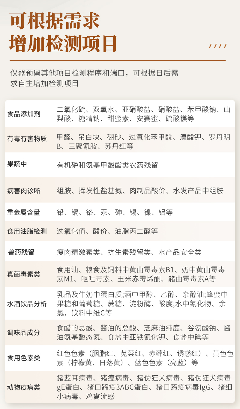 食品添加劑:二氧化硫、雙氧水、亞硝酸鹽、硝酸鹽、苯甲酸鈉、山梨酸鉀、糖精鈉、甜蜜素、木耳硫酸鎂等有毒有害物質(zhì):甲醛、吊白塊、硼砂、過氧化苯甲酰、溴酸鉀、羅丹明B、三聚氰胺、蘇丹紅、工業(yè)堿、尿素、明礬等食用油脂:過氧化值、酸價等果蔬:農(nóng)藥殘留(酶抑制率法)病害肉:組胺、揮發(fā)性鹽基氮重金屬含量:鉛、鎘、鉻、汞、砷、錫、鎳、鋁等水酒飲品分析:酒中甲醇、乙醇、乳品及牛奶中蛋白質(zhì),蜂蜜成分:果糖和葡萄糖、蔗糖、淀粉酶、酸度等調(diào)味品成分:食醋的總酸、醬油的總酸、芝麻油純度、谷氨酸鈉、醬油氨基酸態(tài)氮、食鹽中亞鐵氰化鉀、食鹽中碘等食用色素類:紅色色素(胭脂紅、莧菜紅、莧菜紅)、黃色色素(檸檬黃、日落黃)、藍(lán)色色素(亮藍(lán))等