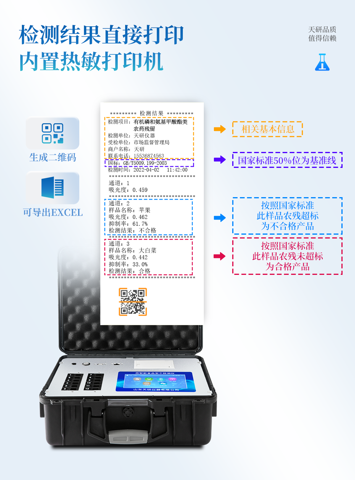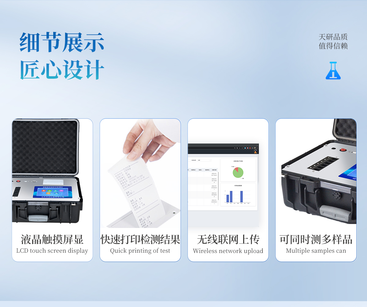 安卓智能操作系統(tǒng),采用更加**的UI交互界面,儀器具有wifi聯網上傳、4G聯網傳輸、GPRS無線遠傳、網線連接功能,快速批量上傳數據。智能化程度高,儀器具有自檢功能:具有開機自檢和調零功能,具有自動檢測重復性功能。 新一代高速熱敏打印機,檢測完成可自動打印或批量打印檢測報告和二維碼。儀器帶有監(jiān)管平臺,數據可局域網和互聯網數據上傳,檢測結果直接傳至食品安全監(jiān)管平臺。進行區(qū)域食品安全監(jiān)管及大數據分析處理與數據統(tǒng)計,檢測區(qū)域食品安全長短期動態(tài),達到食品安全問題預估、預警一體化主機,包含食品安全檢測模塊、多通道農藥殘留檢測模塊、膠體金免疫層析檢測模塊。一體化便攜式快檢設備,滿足現場及流動檢測使用需求,能夠在同一軟件下實現所有檢測項目的檢測,并可通過同一窗口直觀顯示檢測結果。膠體金模塊檢測方式:軌道式自動傳輸掃描,檢測完成后自動退出檢測卡。 CT線自動識別,無需手動調整。 內置強大的數據庫,具有多品類多種類樣品菜單功能,可靈活選擇檢測樣品,不同的檢測通道可同時檢測不同的樣品項目。也可在儀器上直接編輯錄入樣品名稱、檢測指標、送檢單位等信息并保存進樣品數據庫。產品內置操作演示視頻,是您身邊的化驗指導專家。樣品處理簡單省力,整體操作快速、安全、便捷。儀器具有自身保護功能,可設置用戶名及密碼,防止非工作人員操作等。高靈敏度,高檢測精度,高重復性精度,掃描式高精度光學傳感器。結果判定線可修改,對照值標定值可保存,斷電不丟失數據。兼容市場上所有的膠體金卡,使用耗材不受限制,極大增強用戶使用體驗。儀器具有重新校準、鎖定、恢復出廠設置功能。