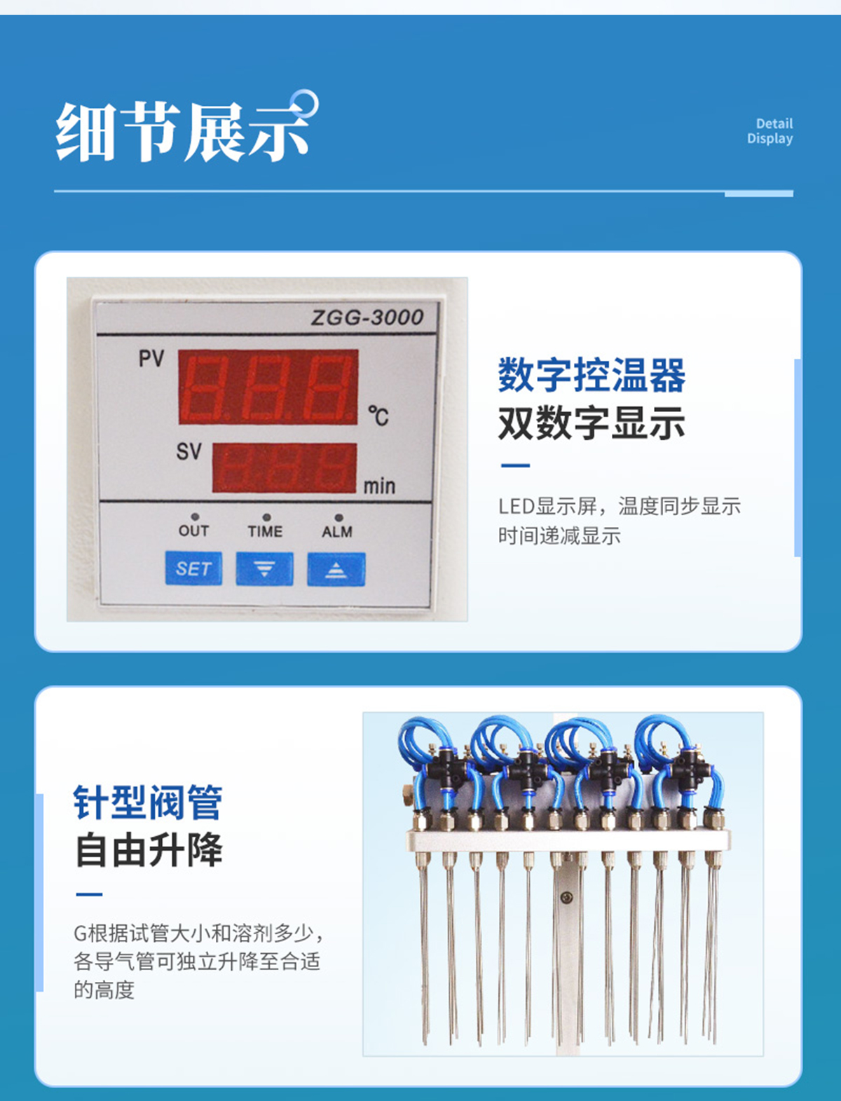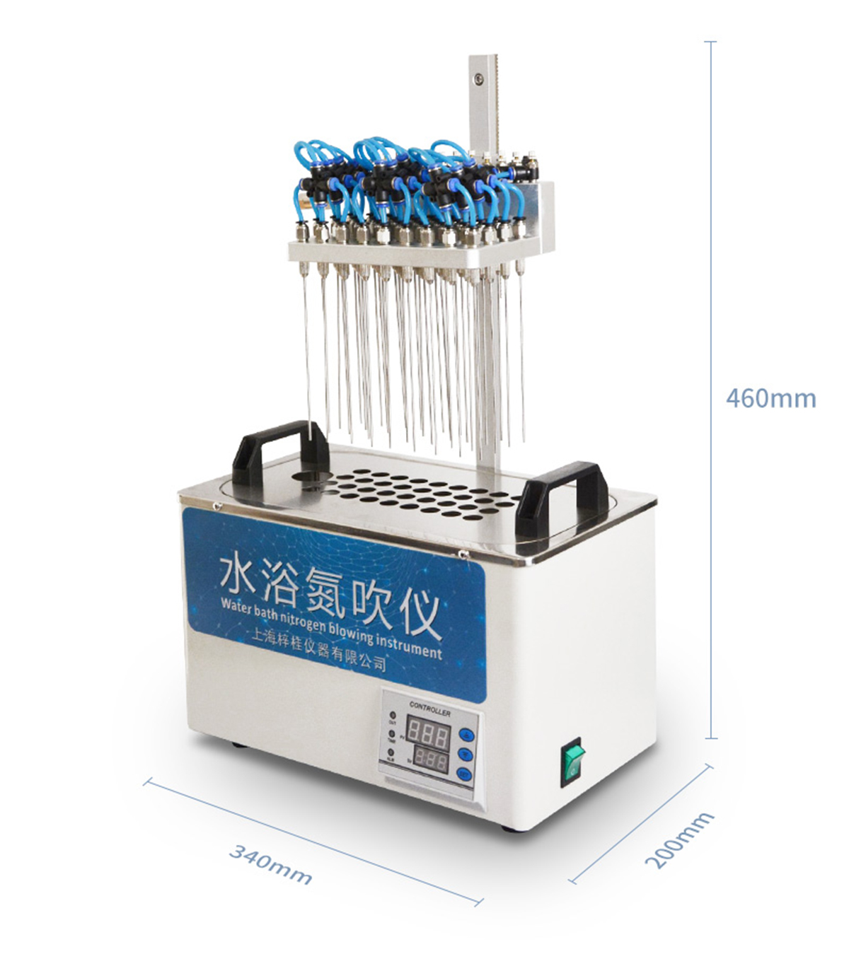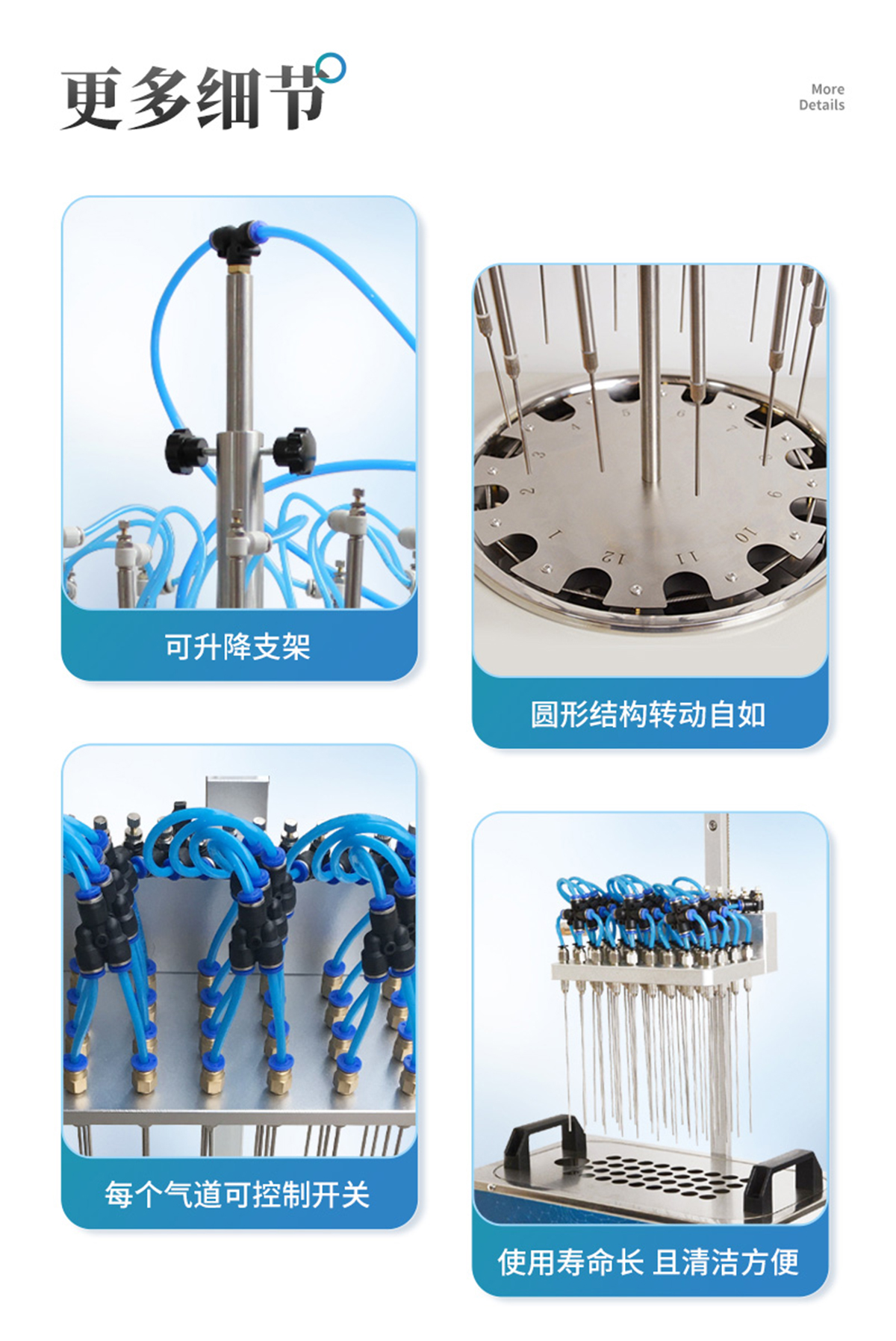 每個吹針都可以獨立控制,避免引起交叉污染。儀器氣腔高度可以自行調(diào)節(jié),配備標(biāo)準(zhǔn)氣針長度為15厘米。氮吹儀有36個氣道控制開關(guān),節(jié)約氣體,每根吹氣針的位置可獨立改變吹掃位置,使之適用不同的樣品容器及不同的樣品位置在濃縮有毒溶劑時,整個系統(tǒng)可置于通風(fēng)柜中,降低危險。內(nèi)置超溫保護裝置,自動故障檢測及報警功能,方便實用。儀器有LED顯示屏,溫度同步顯示、時間遞減顯示,可時時觀察溫度變化。具有整體溫度更均勻,加熱速度快本產(chǎn)品還可以作為普通的干式恒溫器使用使用起來更簡便,而且溫度也可以達到150℃,可以更好濃縮樣品