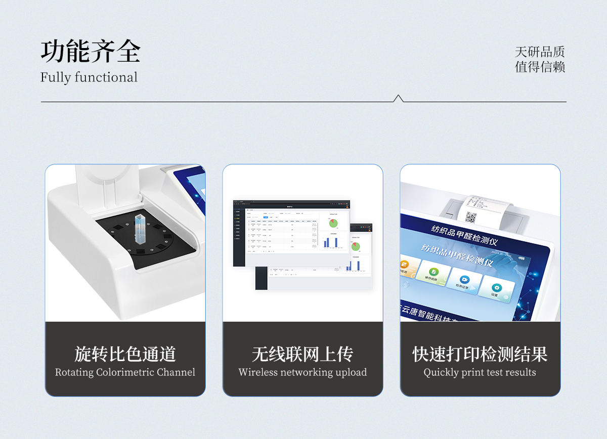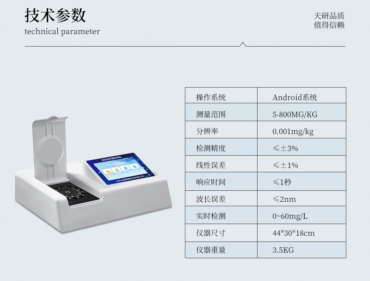 | 1、智能**且方便 | ①智能芯片:主控芯片采用ARM Cortex-A7,RK3288/4核處理器,搭配安卓智能操作系統(tǒng),集實驗操作,分析結(jié)果,打印報告等功能于一體,使用方便,性能更強。 | ②大屏顯示:采用10.1英寸液晶觸摸屏,單機即可操作,無需連接外部顯示或控制器。 | ③多樣同檢:儀器具有12個檢測通道,可同時一次性檢測11個樣品,效率更高。 | ④工作預(yù)設(shè):具有任務(wù)預(yù)設(shè)模塊,一鍵提前預(yù)設(shè)樣品所有信息內(nèi)容。來樣時可直接檢測,同時可多次調(diào)取。 | ⑤數(shù)據(jù)分析:設(shè)備首頁自動匯總分析數(shù)據(jù),并繪制柱形分析圖,各項檢測數(shù)據(jù)一目了然,快捷直觀。 | ⑥高度集成:模塊高度集合,將分光光度模塊、數(shù)字化管理模塊、無線通訊模塊集成于一體??蓪z測結(jié)果進行分析,直接上傳至數(shù)據(jù)平臺,實現(xiàn)數(shù)據(jù)共享,方便后期進行數(shù)據(jù)分析與統(tǒng)計。 | ⑦遠(yuǎn)程升級:儀器具備遠(yuǎn)程升級功能,可遠(yuǎn)程升級程序,無需返廠,并可持續(xù)性免費更新系統(tǒng)版本,降低成本及運輸損耗風(fēng)險。 | 2、檢測精準(zhǔn)且直觀 | ①**技術(shù):精密旋轉(zhuǎn)比色池,使用同芯片同光源校準(zhǔn)精度,解決不同光源之間存在波長誤差的問題,更加準(zhǔn)確**。 | ②結(jié)果直觀:儀器自動對檢測結(jié)果與國標(biāo)限量值進行對比,自動判定結(jié)果是否合格,結(jié)果更直觀。 | 3、功能強大且實用 | ①存儲功能:設(shè)備可以存儲數(shù)據(jù)100000組,可在屏幕上直觀查看歷史數(shù)據(jù),可導(dǎo)出數(shù)據(jù)。 | ②打印功能:設(shè)備自帶打印功能,可對樣品信息及檢測結(jié)果無限次隨意打印。 | ③全新方式:新創(chuàng)自定義打印方式,可按需靈活勾選控制:二維碼,抽樣信息、檢測信息,受檢信息、復(fù)核信息、抽樣日期、檢測日期等信息的打印 | ④多重編輯:樣品信息可多重編輯,可以對每個通道屬性和樣品信息單獨進行編輯,例如樣品信息、抽樣信息、檢測信息,受檢信息、復(fù)核信息、抽樣日期、檢測日期等信息等。 | ⑤雙語設(shè)計:全中文/英文操作菜單,簡單實用,適用于不同用戶的需求。 |