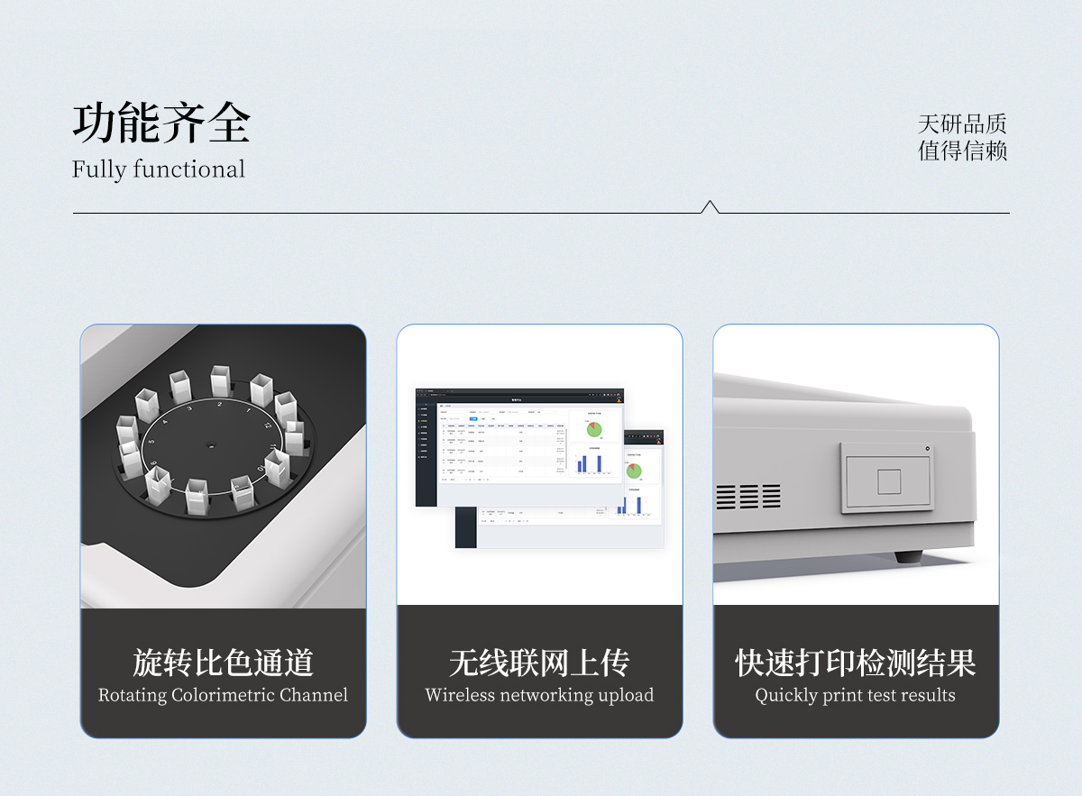 | 1、智能**且方便 | ①智能芯片:主控芯片采用ARM Cortex-A7,RK3288/4核處理器,搭配安卓智能操作系統(tǒng),集實(shí)驗(yàn)操作,分析結(jié)果,打印報(bào)告等功能于一體,使用方便,性能更強(qiáng)。 | ②大屏顯示:采用10.1英寸液晶觸摸屏,單機(jī)即可操作,無需連接外部顯示或控制器。 | ③多樣同檢:儀器具有12個(gè)檢測(cè)通道,可同時(shí)一次性檢測(cè)11個(gè)樣品,效率更高。 | ④工作預(yù)設(shè):具有任務(wù)預(yù)設(shè)模塊,一鍵提前預(yù)設(shè)樣品所有信息內(nèi)容。來樣時(shí)可直接檢測(cè),同時(shí)可多次調(diào)取。 | ⑤數(shù)據(jù)分析:設(shè)備首頁自動(dòng)匯總分析數(shù)據(jù),并繪制柱形分析圖,各項(xiàng)檢測(cè)數(shù)據(jù)一目了然,快捷直觀。 | ⑥高度集成:模塊高度集合,將分光光度模塊、數(shù)字化管理模塊、無線通訊模塊集成于一體??蓪z測(cè)結(jié)果進(jìn)行分析,直接上傳至數(shù)據(jù)平臺(tái),實(shí)現(xiàn)數(shù)據(jù)共享,方便后期進(jìn)行數(shù)據(jù)分析與統(tǒng)計(jì)。 | ⑦遠(yuǎn)程升級(jí):儀器具備遠(yuǎn)程升級(jí)功能,可遠(yuǎn)程升級(jí)程序,無需返廠,并可持續(xù)性免費(fèi)更新系統(tǒng)版本,降低成本及運(yùn)輸損耗風(fēng)險(xiǎn)。 | 2、檢測(cè)精準(zhǔn)且直觀 | ①**技術(shù):精密旋轉(zhuǎn)比色池,使用同芯片同光源校準(zhǔn)精度,解決不同光源之間存在波長誤差的問題,更加準(zhǔn)確**。 | ②結(jié)果直觀:儀器自動(dòng)對(duì)檢測(cè)結(jié)果與國標(biāo)限量值進(jìn)行對(duì)比,自動(dòng)判定結(jié)果是否合格,結(jié)果更直觀。 | 3、功能強(qiáng)大且實(shí)用 | ①存儲(chǔ)功能:設(shè)備可以存儲(chǔ)數(shù)據(jù)100000組,可在屏幕上直觀查看歷史數(shù)據(jù),可導(dǎo)出數(shù)據(jù)。 | ②打印功能:設(shè)備自帶打印功能,可對(duì)樣品信息及檢測(cè)結(jié)果無限次隨意打印。 | ③全新方式:新創(chuàng)自定義打印方式,可按需靈活勾選控制:二維碼,抽樣信息、檢測(cè)信息,受檢信息、復(fù)核信息、抽樣日期、檢測(cè)日期等信息的打印 | ④多重編輯:樣品信息可多重編輯,可以對(duì)每個(gè)通道屬性和樣品信息單獨(dú)進(jìn)行編輯,例如樣品信息、抽樣信息、檢測(cè)信息,受檢信息、復(fù)核信息、抽樣日期、檢測(cè)日期等信息等。 | ⑤雙語設(shè)計(jì):全中文/英文操作菜單,簡單實(shí)用,適用于不同用戶的需求。 |