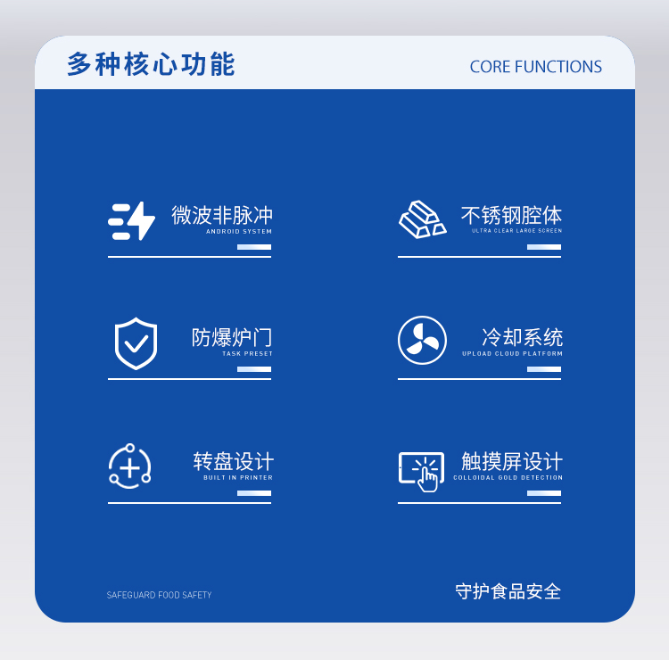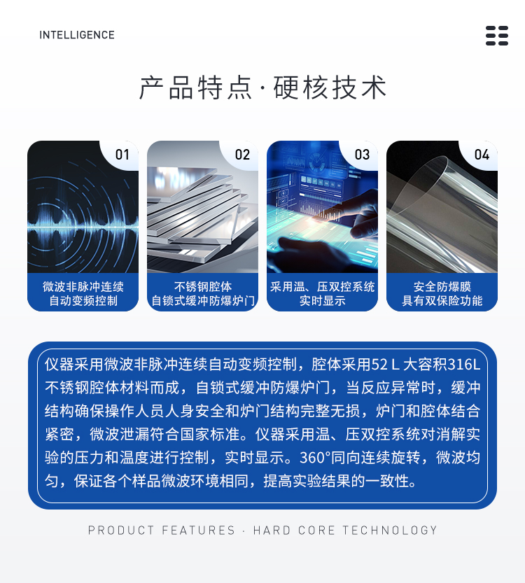 儀器采用微波非脈沖連續(xù)自動變頻控制,延長了儀器的使用壽命和電磁波的均勻性,腔體采用52L大容積316L不銹鋼腔體材料制成,自鎖式緩沖防爆爐門,當(dāng)反應(yīng)異常時,緩沖結(jié)構(gòu)確保操作人員人身安全和爐門結(jié)構(gòu)完整無損,爐門和腔體結(jié)合緊密,微波泄漏符合國家標(biāo)準(zhǔn)。儀器采用溫、壓雙控系統(tǒng)對消解實驗的壓力和溫度進行控制,實時顯示。360°同向連續(xù)旋轉(zhuǎn),微波均勻,確定各個樣品微波環(huán)境相同,提高實驗結(jié)果的一致性。當(dāng)罐內(nèi)的壓力超過設(shè)定的保護值時,微波會自動停止加熱。安全防爆膜具有雙保險功能,當(dāng)罐內(nèi)的壓力超過防爆膜所能承受的壓力時,防爆膜先行破裂,氣體瀉出,防止罐體受損和對人體的傷害。
