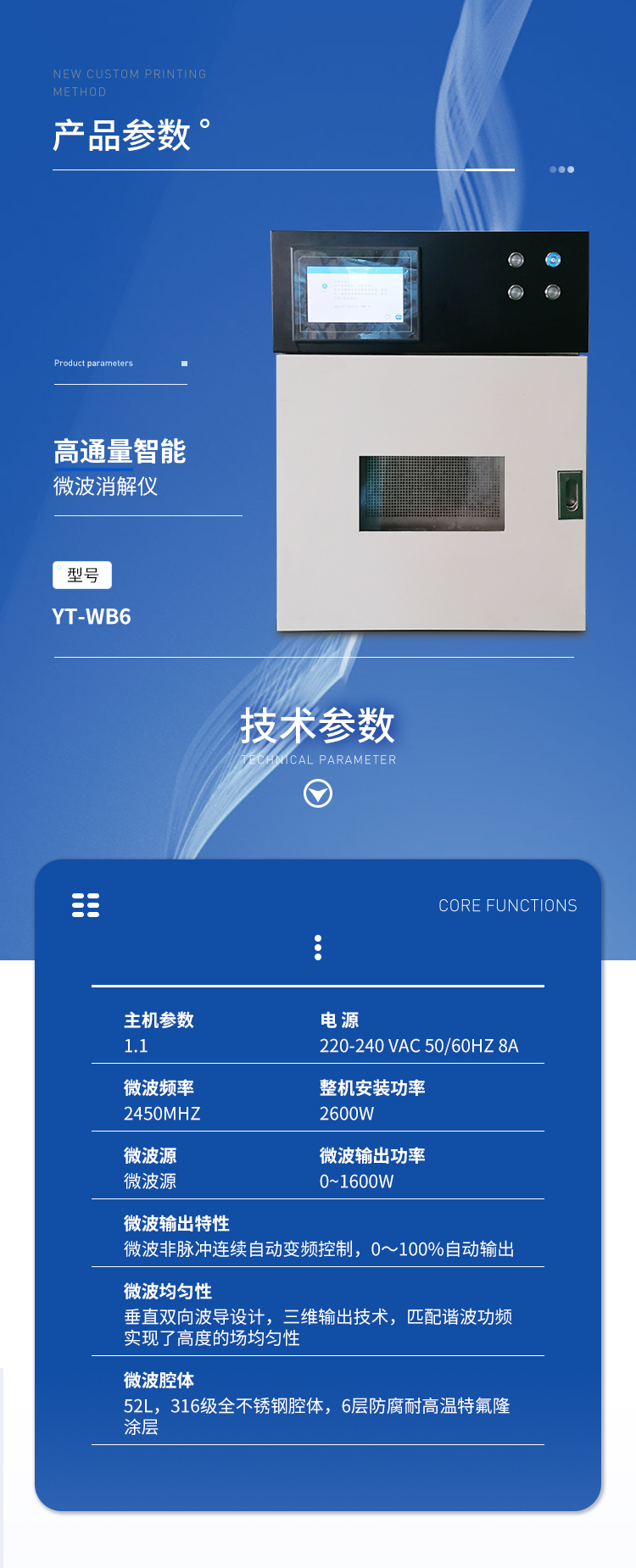 | 主機參數(shù);1.1電 源:220-240 VAC 50/60Hz 8A ; | 微波頻率:2450MHz; | 整機安裝功率:2600W; | (1)電源要求:220 VAC 50 Hz 15A; | (2)微波源: | (3)微波輸出功率 :0~1600W; | (4)微波輸出特性:微波非脈沖連續(xù)自動變頻控制,0~100%自動輸出; | (5)微波均勻性:垂直雙向波導(dǎo)設(shè)計,三維輸出技術(shù),匹配諧波功頻實現(xiàn)了高度的場均勻性; | (6)微波腔體:52L,316級全不銹鋼腔體,6層防腐耐高溫特氟隆涂層; | (7)自鎖式緩沖防爆爐門,在危險出現(xiàn)時能自動提前釋放橫向壓力沖擊,確保操作人員人身安全和爐門結(jié)構(gòu) 完整無損; | (8)排風(fēng)和冷卻系統(tǒng):爐腔配備大功率排風(fēng)系統(tǒng),各種反應(yīng)可在通風(fēng),安全和易于觀察的環(huán)境下長時間連續(xù)進行。爐腔通風(fēng)采用耐酸蝕,大風(fēng)量離心式風(fēng)機,排風(fēng)量不小于5m3/min;爐腔內(nèi)具有風(fēng)冷功能,持續(xù)為反應(yīng)罐降溫,溫度和壓力實時顯示。 | (9)轉(zhuǎn)盤設(shè)計:360°同向往返連續(xù)旋轉(zhuǎn),微波均勻,保證各個樣品微波環(huán)境相同,提高實驗結(jié)果的一致性。 | (10)控制方式:觸摸屏設(shè)計,8寸TFT-LED(800X480彩)大屏幕顯示,遠(yuǎn)距離直讀反應(yīng)進程,實時顯示密閉反應(yīng)罐溫度、壓力,并可實時顯示溫壓曲線; | (11)操作語言:中文簡體 | (12)自動保護功能:具有故障自檢系統(tǒng);當(dāng)控溫和控壓中某一系統(tǒng)失靈時,儀器會自動切斷微波發(fā)射,并且報警; |