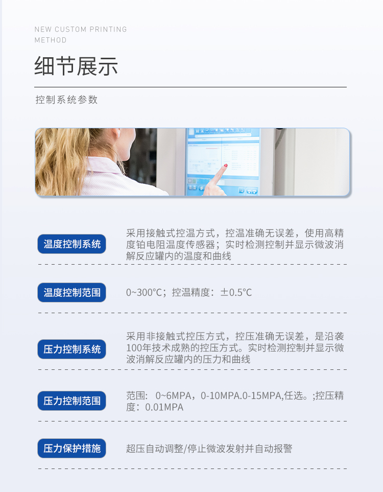 | (1)溫度控制系統(tǒng):采用接觸式控溫方式,控溫準(zhǔn)確無誤差,使用高精度鉑電阻溫度傳感器;實時檢測控制并顯示微波消解反應(yīng)罐內(nèi)的溫度和曲線; | (2)溫度控制范圍:0~300℃;控溫精度:±0.5℃; | (3)控溫能力:速率升溫功能。 | (4)壓力控制系統(tǒng):采用非接觸式控壓方式,控壓準(zhǔn)確無誤差,是沿襲100年技術(shù)成熟的控壓方式。實時檢測控制并顯示微波消解反應(yīng)罐內(nèi)的壓力和曲線; | (5)壓力控制范圍:范圍: 0~6MPa,0-10MPa.0-15MPa,任選。;控壓精度:0.01MPa; | (6)壓力保護:超壓自動調(diào)整/停止微波發(fā)射并自動報警; |