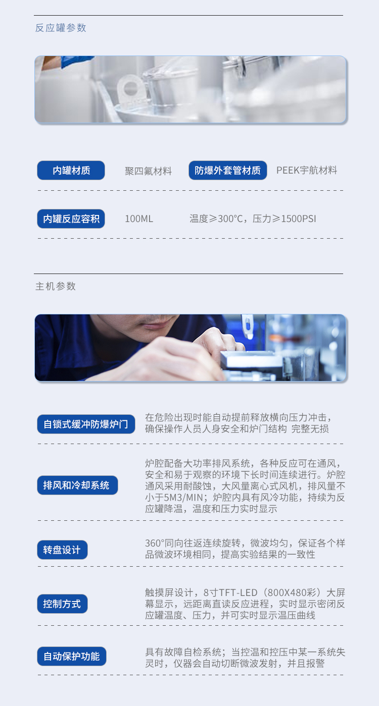 | (1)高溫度≥300℃,高壓力≥1500psi; | (2)內(nèi)罐材質(zhì):聚四氟材料; | (3)防爆外套管材質(zhì):PEEK宇航材料; | (4)內(nèi)罐反應(yīng)容積:100ml; | (5)高壓消解罐批處理量≥20個樣品/批(可不更換轉(zhuǎn)子升級為40位); | (6)防爆膜片采用陶瓷壓緊,陶瓷受熱不變形,四氟受熱變形,起不到防爆膜作用,采用陶瓷件壓緊。 | (7)消解罐工作方式為360°同向連續(xù)旋轉(zhuǎn),微波均勻,各個樣品微波環(huán)境相同,提高實驗結(jié)果的一致性 |