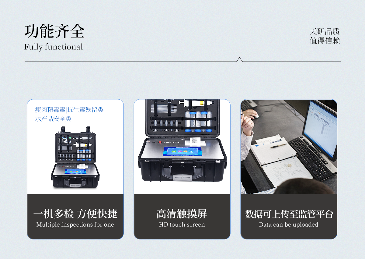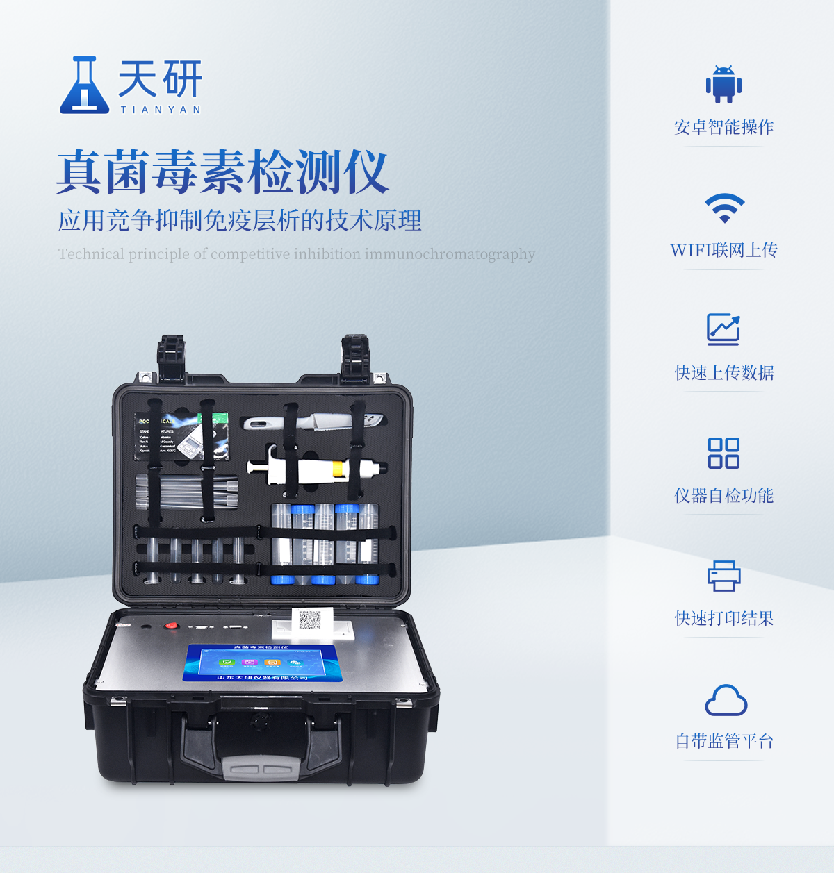 | 用途:可用于糧食谷物及其制品、飼料、植物油中真菌毒素快速定量測定; | 檢測方法:采用發(fā)光定量免疫層析技術(shù),激光激發(fā),掃描方式收集發(fā)光熒光信號。 | 定量參數(shù)設(shè)定:RFID芯片記錄檢測目標的標準曲線,根據(jù)不同樣本類型配備多參數(shù)卡; | 識別功能:試劑插卡后儀器自動識別檢測項目; | 靈敏性和特異性:不受外界的背景干擾, 檢測限為0.4-4500ug/kg;對其它毒素?zé)o非特異反應(yīng); | 穩(wěn)定性:無淬滅和光漂白現(xiàn)象; | 檢測時間快,實時顯示檢測曲線 | 無需孵育器,室溫(15-30℃)下進行測試 | 數(shù)據(jù)獲取和處理:檢測結(jié)果自動獲?。o需目測),可實時打印檢測報告;數(shù)據(jù)可儲存,可導(dǎo)出。 | 儀器可靠:有開機系統(tǒng)自檢功能;儀器配有質(zhì)控卡,確保檢測系統(tǒng)自身的準確性; | 檢測數(shù)據(jù)精準可靠:HPLC/LC-MS結(jié)果接近 | 檢測儀器獲得國家認證 | 聯(lián)網(wǎng):網(wǎng)絡(luò)接口 | 升級:可以通過U盤進行軟件升級 | 存儲空間:≥32G,**擴展至64G | 工作功率:40W | 操作系統(tǒng):windows 7 | 顯示屏:可觸摸顯示屏,屏幕尺寸≥8寸 | 定量檢測項目:包括黃曲霉毒素B1、嘔吐毒素、玉米赤霉烯酮、T-2毒素、伏馬毒素 |