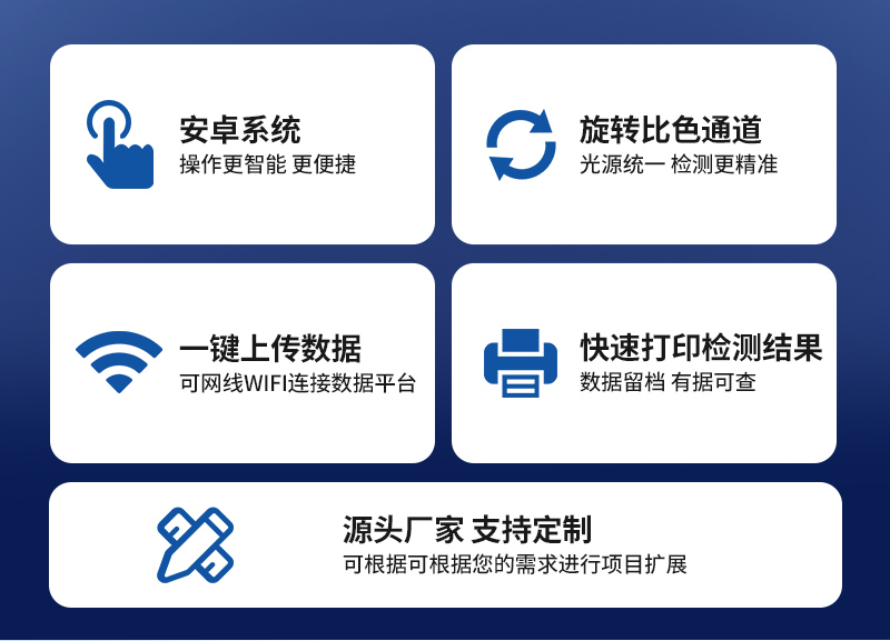 | 機(jī)器采用全新安卓智能系統(tǒng),主控芯片采用 ARM Cortex-A7,RK3288/4核處理器,主頻1.88Ghz,運(yùn)轉(zhuǎn)速度更快速,穩(wěn)定性更強(qiáng)。 | 創(chuàng)新檢測模式: *儀器采用精密旋轉(zhuǎn)比色池設(shè)計(jì),使用光源一致,可以解決各通道間由于光源誤差帶來的檢測結(jié)果誤差問題,檢測結(jié)果更加精準(zhǔn)。 *儀器具有自動識別比色皿檢測功能,即:將樣品比色皿放入儀器后,點(diǎn)擊樣品檢測,儀器自動識別比色皿進(jìn)行通道檢測。 | 供電方式:交直流兩用,直流 12V 供電,可連接車載電源,可配 6ah 大容量充電鋰電池,方便戶外流動測試。 | 顯示方式:7英寸液晶觸摸屏顯示,人性化中文操作界面,讀數(shù)直觀、簡單。 | 檢測通道:8個(gè)檢測通道,可以同時(shí)測試多個(gè)樣品,循環(huán)檢測,即放即檢,每個(gè)樣品由程序控制分別獨(dú)立工作,不會互相干擾。 | 高精光源系統(tǒng): ①①儀器光源采用進(jìn)口超高亮發(fā)光二極管,光源亮度可以自動調(diào)節(jié)與校準(zhǔn) ②智能恒流穩(wěn)壓,光強(qiáng)自動校準(zhǔn),長時(shí)間連續(xù)工作光源無溫漂現(xiàn)象。 | 智能操作分析系統(tǒng): ①儀器具有100多種蔬菜名稱菜單庫,分類管理,并可按需添加或刪除、編輯蔬菜名稱;可在同一檢測界面自動對應(yīng)相關(guān)檢測通道一次性選擇1-24個(gè)樣品名稱,無需退出界面,節(jié)省操作時(shí)間。 ②內(nèi)置新國家限量標(biāo)準(zhǔn),與所測結(jié)果進(jìn)行現(xiàn)場比對,并持續(xù)更新標(biāo)準(zhǔn)。 | 完善的配套硬件: ①采用串口5v打印機(jī),可選擇手動打印或者自動打印,三分鐘出打印結(jié)果,打印格式為檢測人姓名、吸光度差值、檢測時(shí)間、檢測機(jī)構(gòu)、樣品名稱及結(jié)果判定。 ②儀器具有無線上傳模塊,檢測結(jié)果可批量打印,批量上傳。 | 數(shù)據(jù)調(diào)用: ①儀器可存儲20萬條檢測結(jié)果, ②檢測結(jié)果為Excel表格,方便后期進(jìn)行數(shù)據(jù)分析與匯總報(bào)告 ③儀器采用USB2.0接口設(shè)計(jì),支持 U 盤存儲,方便數(shù)據(jù)的存貯和移動,并可隨時(shí)與計(jì)算機(jī)直接相連,實(shí)現(xiàn)數(shù)據(jù)查詢、瀏覽、分析、統(tǒng)計(jì)、打印等。 | 后期產(chǎn)品固件可升級。 | 安全證書,放心保障:儀器具有中國計(jì)量科學(xué)研究院校準(zhǔn)證書,**認(rèn)證,使用放心。 |