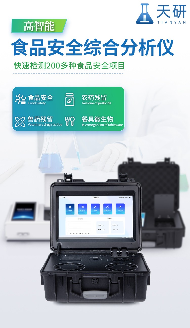 山東天研儀器有限公司生產(chǎn)的食品安全綜合分析儀,采用多功能集成、箱儀一體化設(shè)計(jì),以高強(qiáng)度安全防護(hù)箱為載體,內(nèi)部集成多個(gè)檢測(cè)功能,適用于食藥監(jiān)局、衛(wèi)生部門、高教院校、科研院所、農(nóng)業(yè)農(nóng)村局、食品深加工企業(yè)及檢驗(yàn)檢疫部門等單位。