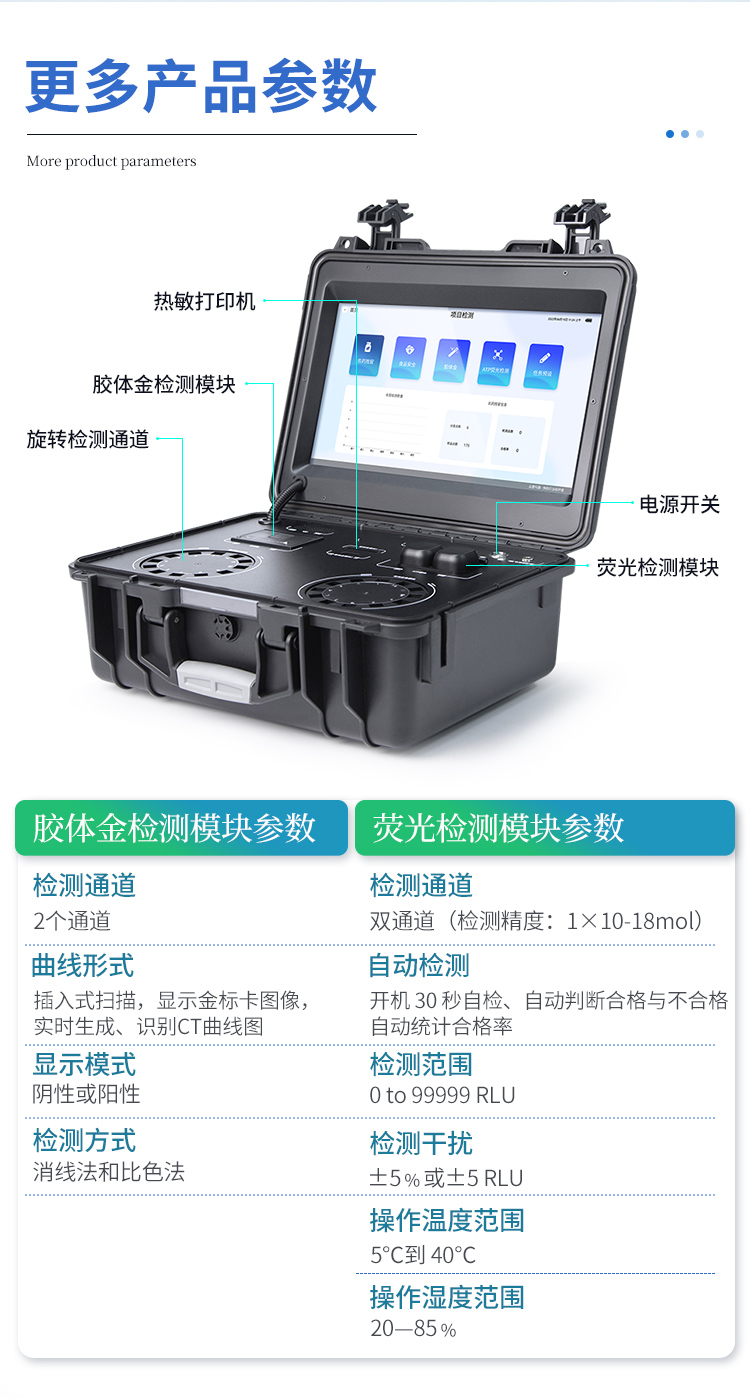 | 功能構(gòu)成:主要包括分光光度模塊、新型農(nóng)殘檢測(cè)模塊、膠體金檢測(cè)模塊、熒光檢測(cè)模塊、數(shù)字化管理模塊等,所有模塊集成一體,可快速檢測(cè)200多種食品安全項(xiàng)目,如獸藥殘留、農(nóng)藥殘留、非法添加劑、細(xì)菌數(shù)值等指標(biāo)。 | 檢測(cè)樣品種類:餐具及廚房用品、瓜果蔬菜及其制品、水產(chǎn)品及其制品、畜禽產(chǎn)品及其制品、嬰幼兒乳品及奶粉制品、蜂蜜、糧油及其制品、調(diào)味品(食醋、醬油、味精、鹽等)、酒類茶葉及其制品、食用菌、飲料、蛋類藥物殘留(雞蛋,鴨蛋等)、米豆面制品、糖果糕點(diǎn)類(小食品)、薯類及膨化食品、瓶(桶)裝飲用水、添加食用色素的食品、使用添加劑的食品、含有有毒有害物質(zhì)的相關(guān)食品。 | 顯示屏幕:儀器采用15.6英寸液晶觸摸屏顯,搭配運(yùn)行安卓智能操作系統(tǒng),主控芯片采用ARM Cortex-A7,RK3288/4核處理器,主頻1.88Ghz,操作方便,性能更強(qiáng)。 | 供電模式:儀器交直流兩用,直流12V供電,可連接車載電源,配18ah大容量充電鋰電池,電量可實(shí)時(shí)顯示,無(wú)外部電源條件下可持續(xù)工作至少 4 小時(shí)。 | 檢測(cè)通道:≥24通道;采用精密旋轉(zhuǎn)比色池設(shè)計(jì),使用同芯片同光源校準(zhǔn)精度,解決不同光源之間的誤差值,更加準(zhǔn)確**,采用高精度進(jìn)口四波長(zhǎng)冷光源,每個(gè)通道均配置 410、520、590、630nm 波長(zhǎng)光源,標(biāo)配**的光路切換裝置,**光路切換功能可實(shí)現(xiàn)64波長(zhǎng),并且所有檢測(cè)項(xiàng)目可實(shí)現(xiàn)所有通道同時(shí)檢測(cè). | 通訊接口:配備無(wú)線通信模塊、4G(APN)通訊模塊、藍(lán)牙傳輸,同時(shí)具有雙USB接口以及RJ45網(wǎng)線接口,可以多方式實(shí)現(xiàn)數(shù)據(jù)保存及數(shù)據(jù)傳輸。 | 存儲(chǔ)方式:支持U盤存儲(chǔ),兩個(gè)標(biāo)準(zhǔn)USB接口,免驅(qū)動(dòng)安裝。檢測(cè)結(jié)果存儲(chǔ)容量20萬(wàn)條以上,可生成Excel表格進(jìn)行拷貝,并具有登錄保護(hù)功能。 | 操作系統(tǒng):儀器可在同一檢測(cè)界面自動(dòng)對(duì)應(yīng)相關(guān)檢測(cè)通道,一次性選擇不少于11個(gè)樣品名稱,無(wú)需退出界面,節(jié)省操作時(shí)間。并可以對(duì)每個(gè)通道屬性和樣品信息單獨(dú)進(jìn)行編輯,例如送檢單位、人員,檢測(cè)人員等,打印時(shí)勾選打印顯示。 | 數(shù)據(jù)集成系統(tǒng):設(shè)備首頁(yè)自動(dòng)匯總分析檢測(cè)數(shù)據(jù),包含:周檢測(cè)數(shù)據(jù)、月檢測(cè)數(shù)據(jù),全部檢測(cè)總數(shù)量,包含檢測(cè)總數(shù),合格數(shù),不合格數(shù),以及相關(guān)柱形分析圖,各項(xiàng)檢測(cè)數(shù)據(jù)一目了然,無(wú)需電腦查詢,更加快捷直觀。 | 數(shù)據(jù)庫(kù)系統(tǒng):十幾項(xiàng)數(shù)據(jù)庫(kù)分類管理儀器:包含項(xiàng)目類型、項(xiàng)目數(shù)據(jù)、檢測(cè)數(shù)據(jù)、歷史記錄、國(guó)標(biāo)信息、曲線信息、采樣信息、檢測(cè)信息、受檢信息、復(fù)核信息、圖表信息、光源校準(zhǔn)信息、打印樣式信息、樣品庫(kù)信息等等,數(shù)據(jù)庫(kù)之間互相協(xié)調(diào)聯(lián)動(dòng)保證數(shù)據(jù)的真實(shí)完整性。同時(shí)產(chǎn)品數(shù)據(jù)庫(kù)以及歷史檢測(cè)記錄支持一鍵檢索功能。 | 限量規(guī)判系統(tǒng):具有限量查詢、添加物質(zhì)合規(guī)判定系統(tǒng)。檢測(cè)出結(jié)果后,系統(tǒng)自動(dòng)調(diào)用系統(tǒng)數(shù)據(jù)庫(kù)中相關(guān)國(guó)標(biāo)進(jìn)行比對(duì)判定,客觀顯示判定結(jié)果是否合格。 | 項(xiàng)目預(yù)設(shè)系統(tǒng):儀器具有任務(wù)預(yù)設(shè)模塊,一鍵提前預(yù)設(shè),給出方便快捷的新檢測(cè)方案,每一個(gè)任務(wù)分別可以設(shè)置不同的樣品、批次、編號(hào)、來(lái)源、備注、抽樣信息、檢測(cè)信息、受檢信息、復(fù)核信息等更多信息。樣品送檢時(shí)一鍵調(diào)取保存信息,并可多次調(diào)取,適用于大批量檢測(cè)業(yè)務(wù),可以大大提高檢測(cè)效率。 | 數(shù)據(jù)監(jiān)管系統(tǒng):同步對(duì)接監(jiān)管平臺(tái),數(shù)據(jù)可局域網(wǎng)和互聯(lián)網(wǎng)數(shù)據(jù)上傳,檢測(cè)結(jié)果可直接傳至食品安全監(jiān)管平臺(tái)。進(jìn)行區(qū)域食品安全監(jiān)管及大數(shù)據(jù)分析處理與數(shù)據(jù)統(tǒng)計(jì),監(jiān)測(cè)區(qū)域食品安全長(zhǎng)短期動(dòng)態(tài)及問(wèn)題預(yù)估、預(yù)警 | 全新打印系統(tǒng):內(nèi)置全新打印機(jī),新創(chuàng)自定義打印方式,可按需靈活勾選控制:產(chǎn)品合格證(國(guó)家農(nóng)業(yè)部標(biāo)準(zhǔn)要求),二維碼,抽樣信息、檢測(cè)信息,受檢信息、復(fù)核信息、抽樣日期、檢測(cè)日期等信息的打印。 | A4紙版本報(bào)告打印功能:設(shè)備擁有兩種結(jié)果展示方式,可以自動(dòng)生成A4打印模板和小票打印模板兩種樣式,可通過(guò)WiFi及網(wǎng)線等方式連接外置打印機(jī)可進(jìn)行打印。 | 膠體金檢測(cè)模塊:采用單通道CMOS成像處理技術(shù)及膠體金免疫層析技術(shù),可讀取膠體金卡數(shù)據(jù),自動(dòng)采集、處理分析,將檢測(cè)結(jié)果顯示,并可根據(jù)參考限值