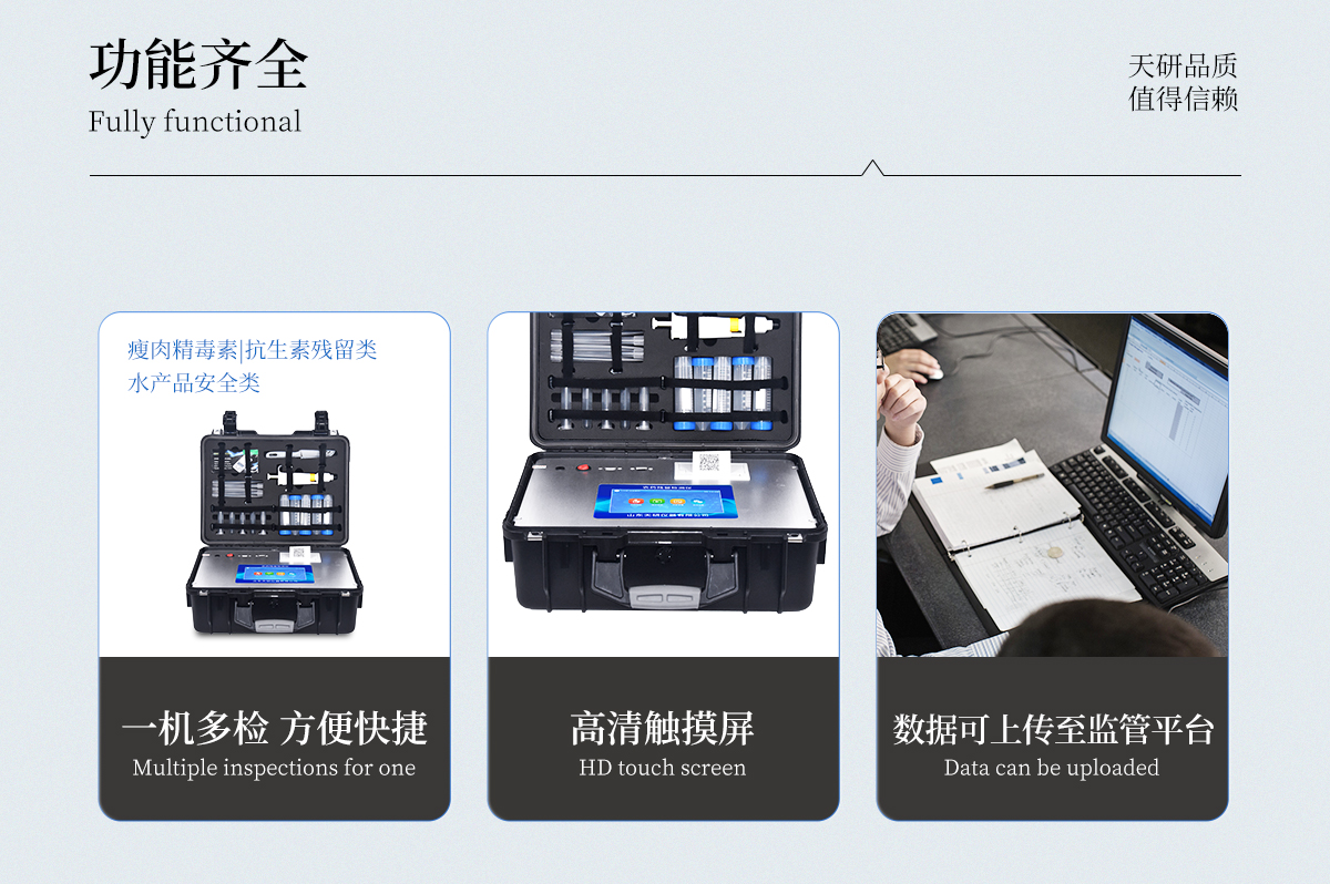 | 安卓智能操作系統(tǒng),采用更加**和人性化操作,儀器具有網(wǎng)線連接、wifi聯(lián)網(wǎng)上傳、4G無線遠傳功能,快速上傳數(shù)據(jù)。 | 智能化程度高,儀器具有自檢功能:具有開機自檢和調(diào)零功能,具有自動檢測重復性功能。 | 新一代高速熱敏打印機,檢測完成可自動打印檢測報告和二維碼。 | 儀器帶有監(jiān)管平臺。數(shù)據(jù)可局域網(wǎng)和互聯(lián)網(wǎng)數(shù)據(jù)上傳,檢測結果直接傳至食品安全監(jiān)管平臺。進行區(qū)域食品安全監(jiān)管及大數(shù)據(jù)分析處理與數(shù)據(jù)統(tǒng)計,檢測區(qū)域食品安全長短期動態(tài),達到食品安全問題預估、預警。 | 一體化便攜式快檢設備,滿足現(xiàn)場及流動檢測使用需求,能夠在同一軟件下實現(xiàn)所有檢測項目的檢測,并可通過同一窗口直觀顯示檢測結果。 | 膠體金模塊檢測方式:軌道式自動傳輸掃描,檢測完成后自動退出檢測卡。 | CT線自動識別,無需手動調(diào)整。 | 儀器具有品類多種類樣品菜單庫,可靈活選擇檢測樣品,不同的檢測通道可同時檢測不同的樣品項目。 | 樣品處理簡單省力,整體操作快速、安全、便捷。 | 儀器具有自身保護功能,可設置用戶名及密碼,防止非工作人員操作等。 | 高靈敏度,高檢測精度,高重復性精度,掃描式高精度光學傳感器。 | 內(nèi)置強大的數(shù)據(jù)庫,可在儀器上直接選擇樣品名稱、檢測指標、送檢單位等信息,也可在儀器上直接編輯錄入樣品名稱、檢測指標、送檢單位等信息并保存進樣品數(shù)據(jù)庫。 | 儀器具有重新校準、鎖定、恢復出廠設置功能。 | 支持U盤存儲。 結果判定線可修改,對照值標定值可保存,斷電不丟失數(shù)據(jù)。 | 兼容市場上所有的膠體金卡,使用耗材不受限制,極大增強用戶使用體驗。 |