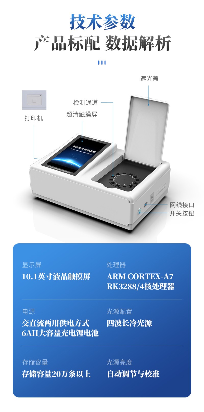 儀器采用臺(tái)式一體化系統(tǒng)檢測(cè)技術(shù),將分光光度模塊、新型農(nóng)殘檢測(cè)模塊、數(shù)字化管理模塊、無(wú)線通訊模塊高度集成于一體,支持檢測(cè)200種食品安全檢測(cè)項(xiàng)目,同時(shí)預(yù)留升級(jí)檢測(cè)方法。儀器檢測(cè)模塊標(biāo)準(zhǔn)化、智能化,可隨意自由組合。檢測(cè)箱體內(nèi)置多個(gè)標(biāo)準(zhǔn)檢測(cè)單元,檢測(cè)模塊可以調(diào)整配置。儀器采用全新安卓智能系統(tǒng),主控芯片采用 ARM Cortex-A7,RK3288/4核處理器,10.1寸高清液晶觸摸豎屏,更加**的UI交互界面,運(yùn)轉(zhuǎn)快捷;儀器配備無(wú)線通信模塊: 4G(APN)通訊模塊、Wifi模塊,藍(lán)牙傳輸,同時(shí)具有雙USB接口以及RJ45接口能以多種方式實(shí)現(xiàn)數(shù)據(jù)保存和數(shù)據(jù)傳輸功能。創(chuàng)新檢測(cè)模式:★檢測(cè)通道:≥12通道;采用精密旋轉(zhuǎn)比色池設(shè)計(jì),使用同芯片同光源校準(zhǔn)精度,解決不同光源之間的誤差值。1-12通道間誤差0.1%。(**號(hào):ZL202022821055.2)★儀器具有自動(dòng)識(shí)別比色皿檢測(cè)功能,即:將樣品比色皿放入儀器后,點(diǎn)擊樣品檢測(cè),儀器自動(dòng)識(shí)別比色皿進(jìn)行通道檢測(cè)。進(jìn)口高精光源:高精度進(jìn)口四波長(zhǎng)冷光源,通道配置 410、520、590、630nm 波長(zhǎng)光源,一個(gè)光源芯片驅(qū)動(dòng)一個(gè)光源,誤差極小,每臺(tái)設(shè)備單獨(dú)**校準(zhǔn)光源,**比對(duì),同時(shí)參照四種不同波段光源全方位覆蓋市面上99%的農(nóng)殘食品項(xiàng)目檢測(cè)。智能化操作系統(tǒng):便捷操作系統(tǒng):設(shè)備檢測(cè)時(shí)可在同一檢測(cè)界面自動(dòng)對(duì)應(yīng)相關(guān)檢測(cè)通道一次性選擇1-12個(gè)樣品名稱,無(wú)須退出界面,節(jié)省操作時(shí)間。數(shù)據(jù)集成系統(tǒng):設(shè)備首頁(yè)自動(dòng)統(tǒng)計(jì)檢測(cè)數(shù)據(jù)包含:周檢測(cè)數(shù)據(jù)、月檢測(cè)數(shù)據(jù),全部檢測(cè)總數(shù)量,均包含檢測(cè)總數(shù),合格數(shù),不合格數(shù),以及相關(guān)柱形分析圖,對(duì)各項(xiàng)檢測(cè)數(shù)據(jù)清晰掌握,無(wú)需電腦查詢,更加快捷直觀。項(xiàng)目預(yù)設(shè)系統(tǒng):支持添加單個(gè)及多個(gè)相同或不相同的任務(wù)預(yù)設(shè),一鍵快速調(diào)取,每一個(gè)任務(wù)分別可以設(shè)置不同的樣品、批次、編號(hào)、來(lái)源、備注、抽樣信息、檢測(cè)信息、受檢信息、復(fù)核信息等更多信息。無(wú)縫鏈接平臺(tái)和APP實(shí)時(shí)查看下發(fā)任務(wù)。數(shù)據(jù)監(jiān)管系統(tǒng):同步對(duì)接監(jiān)管平臺(tái),數(shù)據(jù)可局域網(wǎng)和互聯(lián)網(wǎng)數(shù)據(jù)上傳,檢測(cè)結(jié)果可選擇直接傳至食品安全監(jiān)管平臺(tái)。集成OSS輸出存儲(chǔ)服務(wù)、區(qū)分設(shè)備定向管理應(yīng)用,進(jìn)行區(qū)域食品安全監(jiān)管及大數(shù)據(jù)分析處理與數(shù)據(jù)統(tǒng)計(jì),檢測(cè)區(qū)域食品安全長(zhǎng)短期動(dòng)態(tài),達(dá)到食品安全問題預(yù)估、預(yù)警。自定義打印系統(tǒng):內(nèi)置全新打印系統(tǒng),新創(chuàng)自定義打印方式,可按需靈活設(shè)置開啟或關(guān)閉:產(chǎn)品合格證(國(guó)家農(nóng)業(yè)部標(biāo)準(zhǔn)要求),二維碼,抽樣信息、檢測(cè)信息,受檢信息、復(fù)核信息、抽樣日期、檢測(cè)日期等信息的打印。系統(tǒng)遠(yuǎn)程更新功能:可定向分客戶分儀器更新系統(tǒng),按照不同客戶后期實(shí)際需求添加項(xiàng)目,無(wú)需機(jī)器返廠,即可遠(yuǎn)程實(shí)時(shí)升級(jí)全新系統(tǒng),節(jié)省時(shí)間成本及避免運(yùn)輸造成設(shè)備損壞。儀器主機(jī)采用一體化防水、抗壓、防撞擊、防腐蝕箱體設(shè)計(jì),同時(shí)配備交直流供電,可連接車載電源,可選配大容量充電鋰電池,滿足現(xiàn)場(chǎng)野外檢測(cè)需求。安全證書,放心保障:儀器具有中國(guó)計(jì)量科學(xué)研究院校準(zhǔn)證書,**認(rèn)證。