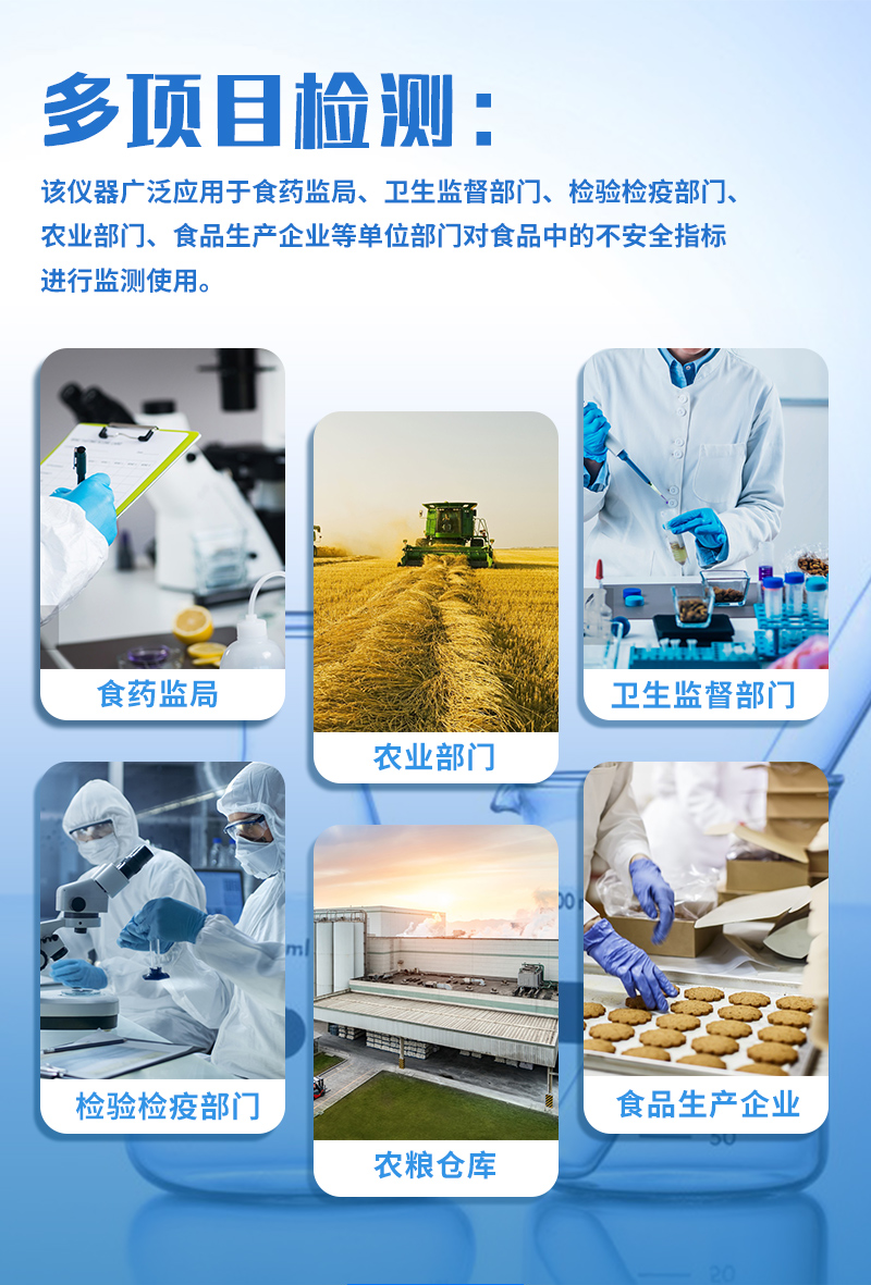 金標度數(shù)儀快速定量檢測獸藥殘留、抗生素類殘留、激素類殘留、毒素類殘留,化學類殘留等幾十種項目并可根據(jù)用戶需要擴充新的檢測項目如農藥殘留、食品添加劑、色素、可現(xiàn)場快速檢測農藥殘留、鹽酸克倫特羅、沙丁胺醇、萊克多巴胺、四環(huán)素類、硝基呋喃類、磺胺類、沙星類、氯霉素、孔雀石綠磺胺類、豬藍耳病毒、豬瘟病毒、黃曲霉毒素B1、豬偽狂犬病毒、豬偽狂犬病毒gE蛋白、豬口蹄疫3ABC蛋白、豬口蹄疫病毒IgG、豬細小病毒、雞禽流感等定性和定量快速檢測等、并且可以連接食品安全監(jiān)控系統(tǒng)。