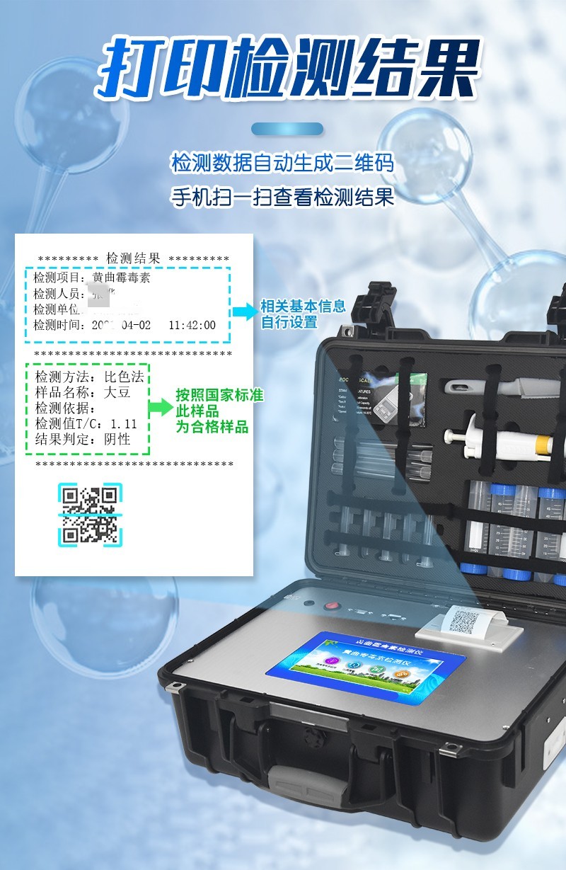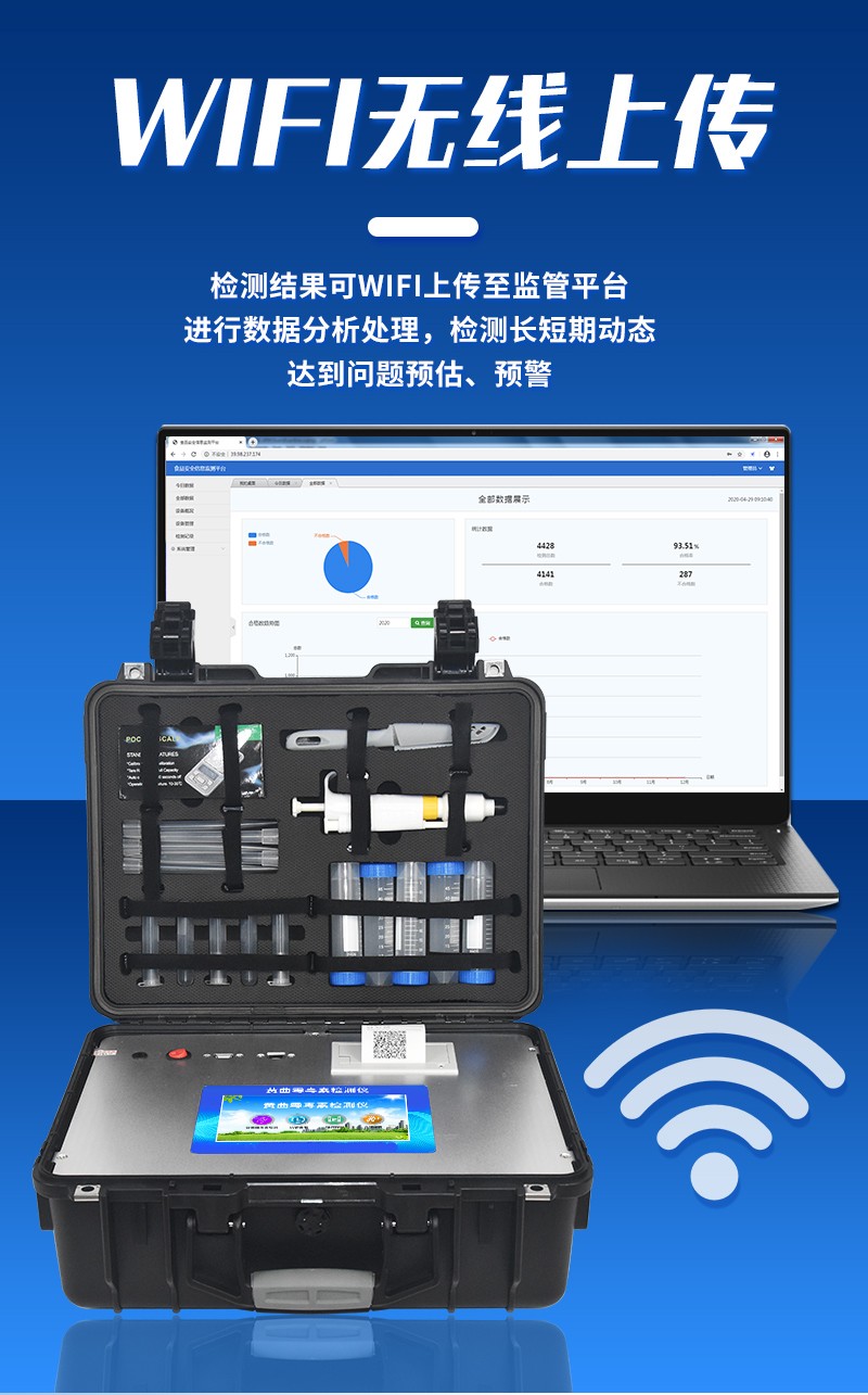 | 工作模式:安卓5.1系統(tǒng)模式 | 軟件支持:安卓軟件平臺 | ☆檢測項目:可檢測農藥殘留、食品添加劑、色素、可現(xiàn)場快速檢測農藥殘留、鹽酸克倫特羅、沙丁胺醇、萊克多巴胺、四環(huán)素類、硝基呋喃類、磺胺類、沙星類、氯霉素、孔雀石綠磺胺類,并且可以連接食品安全監(jiān)控系統(tǒng)。 | 測量原理:光電池測量反射衰減信號強度; | 測量速度:≤5s; | 儲存功能:儲存至少20000個結果數(shù)據(jù),支持自定義查詢; | 藍牙模塊:藍牙4.2 | 檢測精度:CV值小于1%(標準卡),批間差小于3%(標準卡); | 檢測輸出:支持色度檢測,CT比值檢測,T線檢測等多種擬合方式; | 內置熱敏打印機 | ☆數(shù)據(jù)輸出:內置WIFI,支持無線數(shù)據(jù)上傳,標準RS232串口,網(wǎng)絡接口和USB2.0接口; | ☆內置食品安全信息系統(tǒng),一鍵數(shù)據(jù)上傳。 | 儀器外形尺寸:300*250*79mm | ☆操作系統(tǒng)配置:7吋液晶屏、4核處理器、1600萬像素 | 凈重:2.0kg。 |