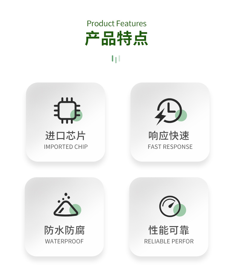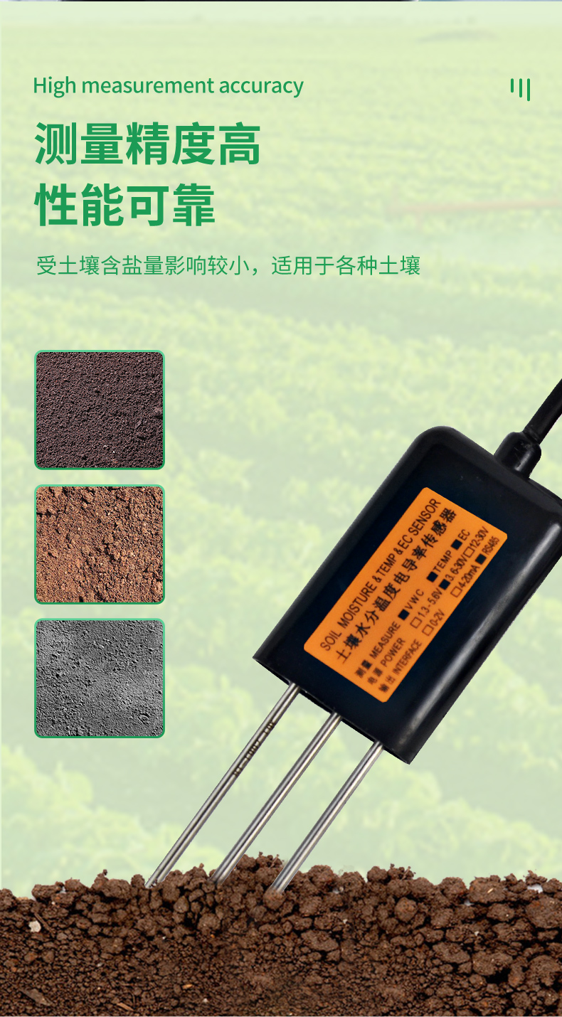 (1)土壤含水率、電導率以及溫度三參數(shù)合一。(2)也可用于水肥一體溶液、以及其他營養(yǎng)液與基質的電導率。(3)電極采用特殊處理的合金材料,可承受較強的外力沖擊,不易損壞。(4)完全密封,耐酸堿腐蝕,可埋入土壤或直接投入水中進行長期動態(tài)檢測。(5)精度高,響應快,互換性好,探針插入式設計保證測量**,性能可靠。(6)完善的保護電路與多種信號輸出接口可選。