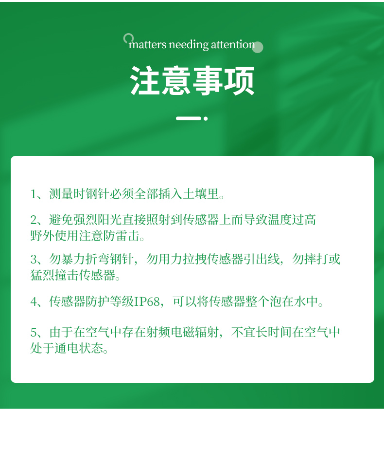 信號輸出類型:電壓輸出0-2V(輸出阻抗約0歐)電流輸出4-20mA(負載電阻<500ohm)RS485接口Modbus協(xié)議供電電壓:3.6-30V/DC直流12-30V/DC直流3.6-30V/DC直流靜態(tài)功耗:6mA@24V DC直流50mA@24V DC直流(兩電流輸出通道均為20mA)6mA@24V DC直流土壤水分量程:可選量程:0-50%,0-100%分辨率:0-50%內(nèi)0.03%,50-100%內(nèi)1%精度:0-50%內(nèi)2%,50-100%內(nèi)3%電導率量程:可選量程:0-5000us/cm,10000us/cm,20000us/cm分辨率:0-10000us/cm內(nèi)10us/cm, 100000-20000us/cm內(nèi)50us/cm精度0-10000us/cm范圍內(nèi)為±3%; 10000-20000us/cm范圍內(nèi)為±5%電導率溫度補償:內(nèi)置溫度補償傳感器,補償范圍0-50℃溫度測量量程:量程:-40~80℃,分辨率:0.1℃,精度:±0.5℃測量原理與測量方式:土壤水分FDR方法,土壤電導率交流電橋法土壤原位插入或浸沒入培養(yǎng)液、水肥一體營養(yǎng)液中直接測試防護等級:IP68浸沒水中可長期使用運行環(huán)境:-40~85℃探針材料:防腐特制電極密封材料:黑色阻燃環(huán)氧樹脂安裝方式:全部埋入或探針全部插入被測介質默認線纜長度:2米,線纜長度可按要求定制連接方式:預裝冷壓端子外形尺寸:45*15*145mm電極長度:70mm
