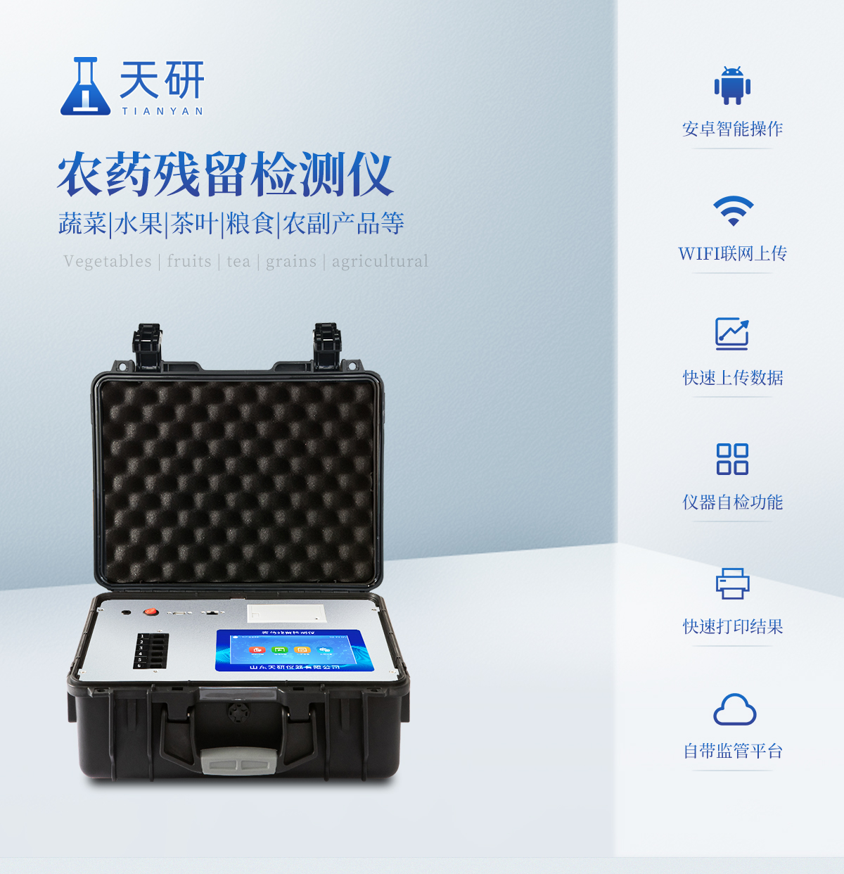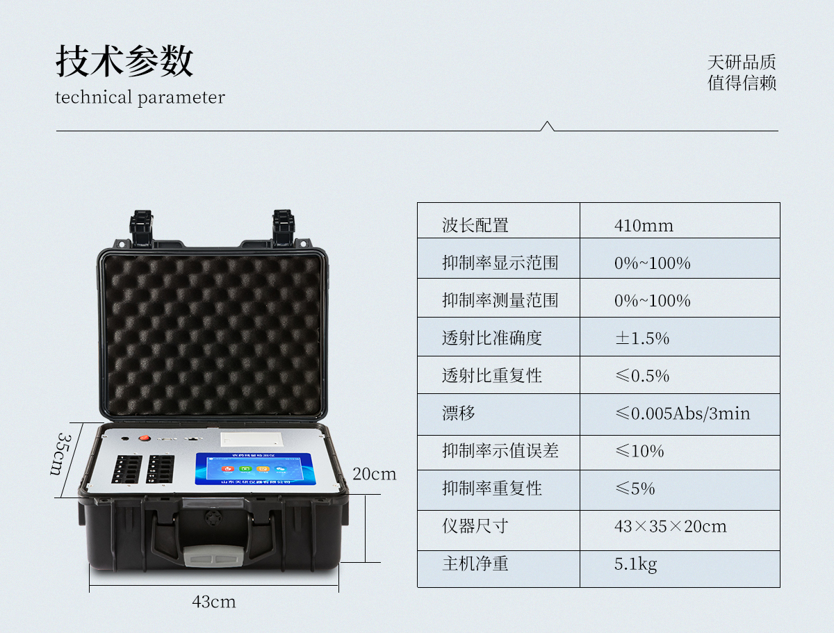 機箱采用工業(yè)級ABS工程塑料箱,方便攜帶,穩(wěn)固耐用,便于流動測試。 智能操作系統(tǒng),采用更加人性化操作,主控采用多核處理器,主頻1.88Ghz,運轉(zhuǎn)速度更快速,穩(wěn)定性更強。自動判斷樣品是否合格,檢測結(jié)果更加直觀。 儀器具有100多種蔬菜名稱菜單庫,分類管理,并可按需添加或刪除蔬菜名,編輯蔬菜名稱,可直接打印出蔬菜名稱。檢測通道:12個檢測通道,可以同時測試多個樣品,循環(huán)檢測,即放即檢,每個樣品由程序控制分別獨立工作,不會互相干擾。 儀器具有wifi聯(lián)網(wǎng)功能,可將數(shù)據(jù)快速上傳電腦,進行數(shù)據(jù)管理與統(tǒng)計,4G信號GPRS遠傳功能,可插手機卡實現(xiàn)數(shù)據(jù)遠傳平臺,。顯示方式:7英寸高靈敏真彩觸摸屏顯示,人性化中文操作界面,讀數(shù)直觀、簡單。 打印機采用串口5v打印,可選擇手動打印或者自動打印,三分鐘出打印結(jié)果,打印格式為檢測人姓名、吸光度差值、檢測時間、檢測機構(gòu)、樣品名稱及結(jié)果判定。光源采用進口超高亮發(fā)光二極管,具有低功耗、高精度、穩(wěn)定性強、光源可控可以關(guān)掉不使用的光源,響應(yīng)速度快等優(yōu)點。 智能恒流穩(wěn)壓,光強自動校準(zhǔn),長時間連續(xù)工作光源無溫漂現(xiàn)象。采用USB2.0接口設(shè)計,方便數(shù)據(jù)的存貯和移動,并可隨時與計算機直接相連,并且可用計算機控制儀器。實現(xiàn)數(shù)據(jù)查詢、瀏覽、分析、統(tǒng)計、打印等。 智能化程度高,儀器具有自檢功能:具有開機自檢和調(diào)零功能,具有自動檢測重復(fù)性功能儀器具有自身保護功能,可設(shè)置用戶名及密碼,防止非工作人員操作等。 采用DC12v直流供電,安全系統(tǒng)更高,并且配備6A鋰電池充電器。儀器具有重新校準(zhǔn)、鎖定、恢復(fù)出廠設(shè)置功能。