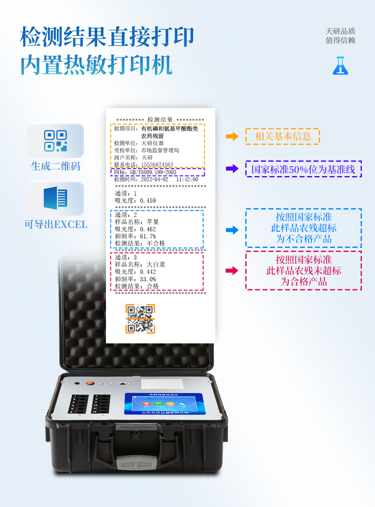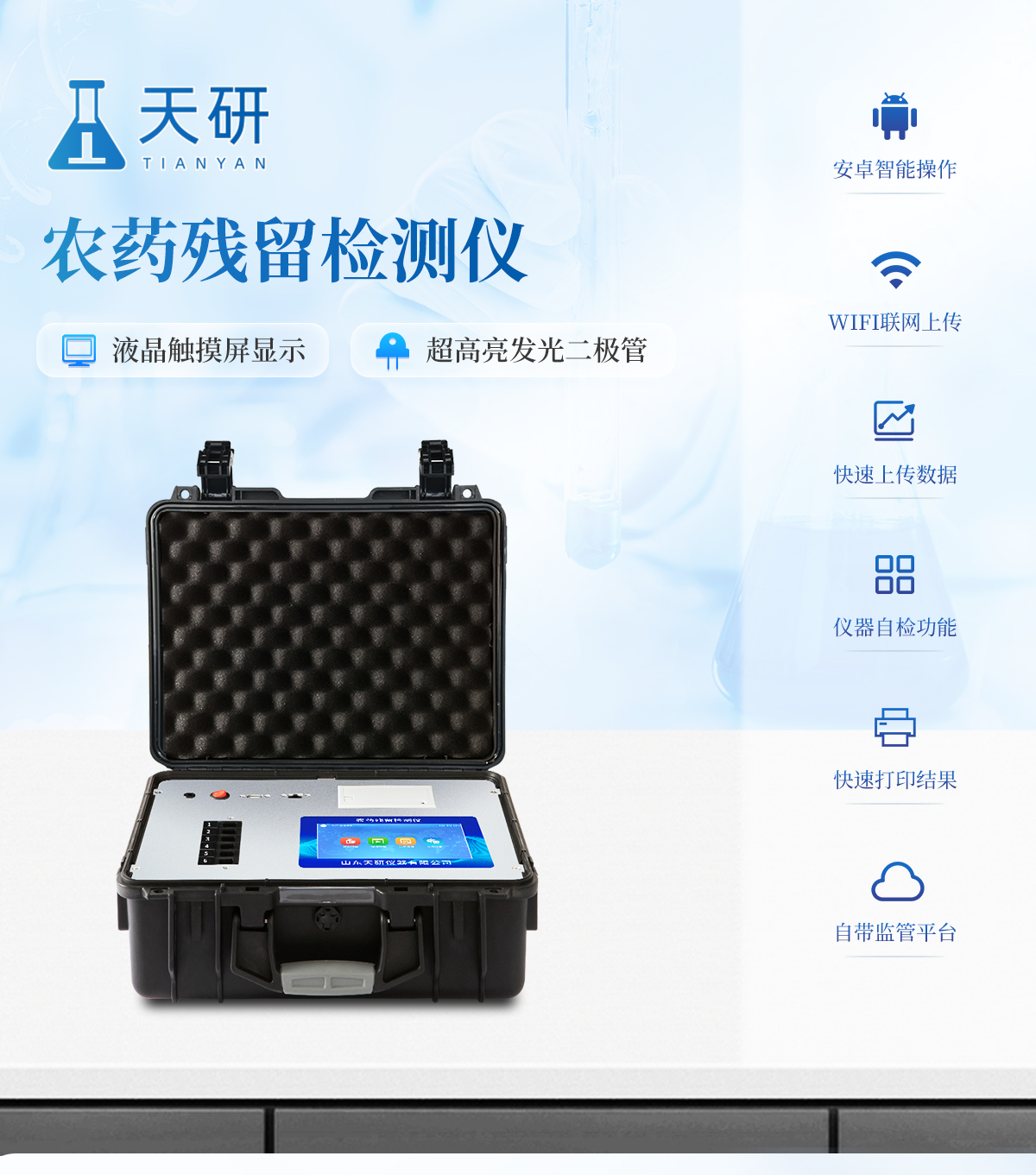 機箱采用工業(yè)級ABS工程塑料箱,方便攜帶,穩(wěn)固耐用,便于流動測試。 智能操作系統(tǒng),采用更加人性化操作,主控采用多核處理器,主頻1.88Ghz,運轉(zhuǎn)速度更快速,穩(wěn)定性更強。自動判斷樣品是否合格,檢測結(jié)果更加直觀。 儀器具有100多種蔬菜名稱菜單庫,分類管理,并可按需添加或刪除蔬菜名,編輯蔬菜名稱,可直接打印出蔬菜名稱。檢測通道:18個檢測通道,可以同時測試多個樣品,循環(huán)檢測,即放即檢,每個樣品由程序控制分別獨立工作,不會互相干擾。 儀器具有wifi聯(lián)網(wǎng)功能,可將數(shù)據(jù)快速上傳電腦,進行數(shù)據(jù)管理與統(tǒng)計,4G信號GPRS遠傳功能,可插手機卡實現(xiàn)數(shù)據(jù)遠傳平臺,。顯示方式:7英寸高靈敏真彩觸摸屏顯示,人性化中文操作界面,讀數(shù)直觀、簡單。 打印機采用串口5v打印,可選擇手動打印或者自動打印,三分鐘出打印結(jié)果,打印格式為檢測人姓名、吸光度差值、檢測時間、檢測機構(gòu)、樣品名稱及結(jié)果判定。光源采用進口超高亮發(fā)光二極管,具有低功耗、高精度、穩(wěn)定性強、光源可控可以關(guān)掉不使用的光源,響應(yīng)速度快等優(yōu)點。 智能恒流穩(wěn)壓,光強自動校準,長時間連續(xù)工作光源無溫漂現(xiàn)象。采用USB2.0接口設(shè)計,方便數(shù)據(jù)的存貯和移動,并可隨時與計算機直接相連,并且可用計算機控制儀器。實現(xiàn)數(shù)據(jù)查詢、瀏覽、分析、統(tǒng)計、打印等。 智能化程度高,儀器具有自檢功能:具有開機自檢和調(diào)零功能,具有自動檢測重復(fù)性功能儀器具有自身保護功能,可設(shè)置用戶名及密碼,防止非工作人員操作等。 采用DC12v直流供電,安全系統(tǒng)更高,并且配備6A鋰電池充電器。儀器具有重新校準、鎖定、恢復(fù)出廠設(shè)置功能。