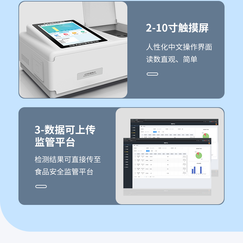 儀器采用臺(tái)式一體化系統(tǒng)檢測(cè)技術(shù),將分光光度模塊、新型農(nóng)殘檢測(cè)模塊、數(shù)字化管理模塊、無(wú)線通訊模塊高度集成于一體,支持檢測(cè)200種食品安全檢測(cè)項(xiàng)目,同時(shí)預(yù)留升級(jí)檢測(cè)方法。儀器檢測(cè)模塊標(biāo)準(zhǔn)化、智能化,可隨意自由組合。檢測(cè)箱體內(nèi)置多個(gè)標(biāo)準(zhǔn)檢測(cè)單元,檢測(cè)模塊可以調(diào)整配置。儀器采用全新安卓智能系統(tǒng),主控芯片采用 ARM Cortex-A7,RK3288/4核處理器,10.1寸高清液晶觸摸豎屏,更加**的UI交互界面,運(yùn)轉(zhuǎn)快捷;儀器配備無(wú)線通信模塊: 4G(APN)通訊模塊、Wifi模塊,藍(lán)牙傳輸,同時(shí)具有雙USB接口以及RJ45接口能以多種方式實(shí)現(xiàn)數(shù)據(jù)保存和數(shù)據(jù)傳輸功能。創(chuàng)新檢測(cè)模式:★檢測(cè)通道:≥12通道;采用精密旋轉(zhuǎn)比色池設(shè)計(jì),使用同芯片同光源校準(zhǔn)精度,解決不同光源之間的誤差值。1-12通道間誤差0.1%。(**號(hào):ZL202022821055.2)★儀器具有自動(dòng)識(shí)別比色皿檢測(cè)功能,即:將樣品比色皿放入儀器后,點(diǎn)擊樣品檢測(cè),儀器自動(dòng)識(shí)別比色皿進(jìn)行通道檢測(cè)。進(jìn)口高精光源:高精度進(jìn)口四波長(zhǎng)冷光源,通道配置 410、520、590、630nm 波長(zhǎng)光源,一個(gè)光源芯片驅(qū)動(dòng)一個(gè)光源,誤差極小,每臺(tái)設(shè)備單獨(dú)**校準(zhǔn)光源,**比對(duì),同時(shí)參照四種不同波段光源全方位覆蓋市面上99%的農(nóng)殘食品項(xiàng)目檢測(cè)。智能化操作系統(tǒng):便捷操作系統(tǒng):設(shè)備檢測(cè)時(shí)可在同一檢測(cè)界面自動(dòng)對(duì)應(yīng)相關(guān)檢測(cè)通道一次性選擇1-12個(gè)樣品名稱,無(wú)須退出界面,節(jié)省操作時(shí)間。數(shù)據(jù)集成系統(tǒng):設(shè)備首頁(yè)自動(dòng)統(tǒng)計(jì)檢測(cè)數(shù)據(jù)包含:周檢測(cè)數(shù)據(jù)、月檢測(cè)數(shù)據(jù),全部檢測(cè)總數(shù)量,均包含檢測(cè)總數(shù),合格數(shù),不合格數(shù),以及相關(guān)柱形分析圖,對(duì)各項(xiàng)檢測(cè)數(shù)據(jù)清晰掌握,無(wú)需電腦查詢,更加快捷直觀。項(xiàng)目預(yù)設(shè)系統(tǒng):支持添加單個(gè)及多個(gè)相同或不相同的任務(wù)預(yù)設(shè),一鍵快速調(diào)取,每一個(gè)任務(wù)分別可以設(shè)置不同的樣品、批次、編號(hào)、來(lái)源、備注、抽樣信息、檢測(cè)信息、受檢信息、復(fù)核信息等更多信息。無(wú)縫鏈接平臺(tái)和APP實(shí)時(shí)查看下發(fā)任務(wù)。數(shù)據(jù)監(jiān)管系統(tǒng):同步對(duì)接監(jiān)管平臺(tái),數(shù)據(jù)可局域網(wǎng)和互聯(lián)網(wǎng)數(shù)據(jù)上傳,檢測(cè)結(jié)果可選擇直接傳至食品安全監(jiān)管平臺(tái)。集成OSS輸出存儲(chǔ)服務(wù)、區(qū)分設(shè)備定向管理應(yīng)用,進(jìn)行區(qū)域食品安全監(jiān)管及大數(shù)據(jù)分析處理與數(shù)據(jù)統(tǒng)計(jì),檢測(cè)區(qū)域食品安全長(zhǎng)短期動(dòng)態(tài),達(dá)到食品安全問(wèn)題預(yù)估、預(yù)警。自定義打印系統(tǒng):內(nèi)置全新打印系統(tǒng),新創(chuàng)自定義打印方式,可按需靈活設(shè)置開(kāi)啟或關(guān)閉:產(chǎn)品合格證(國(guó)家農(nóng)業(yè)部標(biāo)準(zhǔn)要求),二維碼,抽樣信息、檢測(cè)信息,受檢信息、復(fù)核信息、抽樣日期、檢測(cè)日期等信息的打印。系統(tǒng)遠(yuǎn)程更新功能:可定向分客戶分儀器更新系統(tǒng),按照不同客戶后期實(shí)際需求添加項(xiàng)目,無(wú)需機(jī)器返廠,即可遠(yuǎn)程實(shí)時(shí)升級(jí)全新系統(tǒng),節(jié)省時(shí)間成本及避免運(yùn)輸造成設(shè)備損壞。儀器主機(jī)采用一體化防水、抗壓、防撞擊、防腐蝕箱體設(shè)計(jì),同時(shí)配備交直流供電,可連接車載電源,可選配大容量充電鋰電池,滿足現(xiàn)場(chǎng)野外檢測(cè)需求。安全證書,放心保障:儀器具有中國(guó)計(jì)量科學(xué)研究院校準(zhǔn)證書,**認(rèn)證。