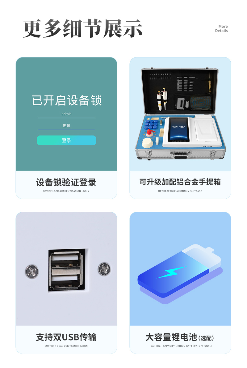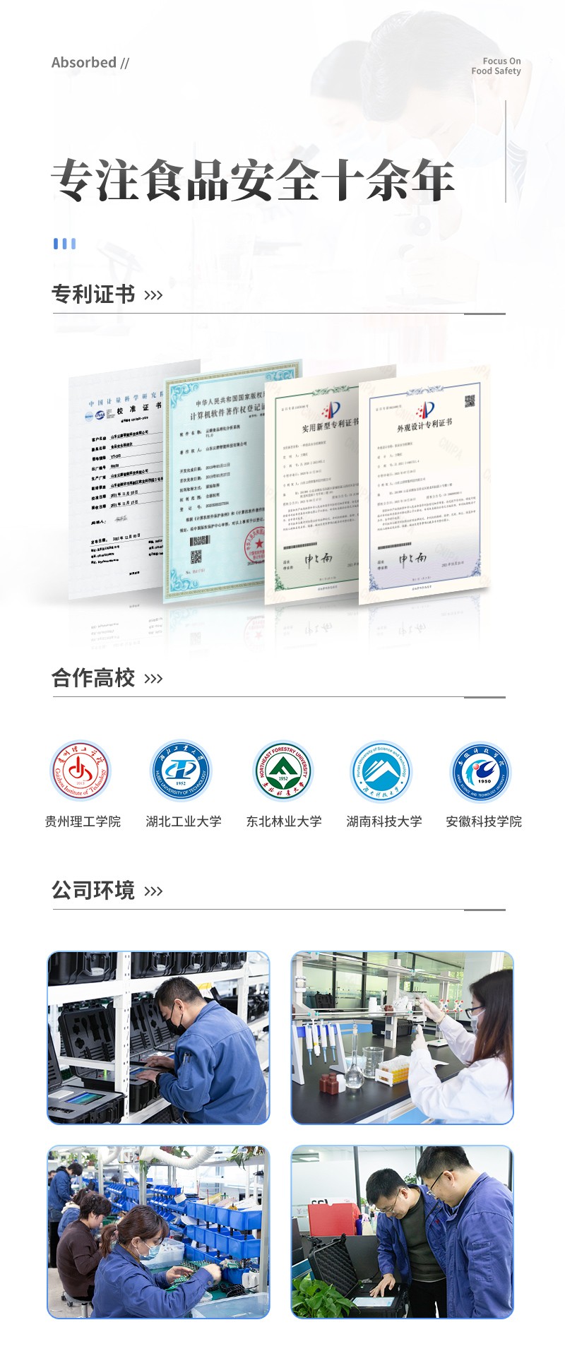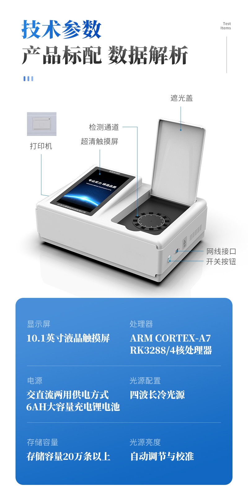 | 儀器采用臺式一體化系統(tǒng)檢測技術(shù),將分光光度模塊、新型農(nóng)殘檢測模塊、數(shù)字化管理模塊、無線通訊模塊高度集成于一體,支持檢測200種食品安全檢測項目,同時預(yù)留升級檢測方法。 | 儀器檢測模塊標準化、智能化,可隨意自由組合。檢測箱體內(nèi)置多個標準檢測單元,檢測模塊可以調(diào)整配置。 | 儀器采用全新安卓智能系統(tǒng),主控芯片采用 ARM Cortex-A7,RK3288/4核處理器,10.1寸高清液晶觸摸豎屏,更加**的UI交互界面,運轉(zhuǎn)快捷;儀器配備無線通信模塊: 4G(APN)通訊模塊、Wifi模塊,藍牙傳輸,同時具有雙USB接口以及RJ45接口能以多種方式實現(xiàn)數(shù)據(jù)保存和數(shù)據(jù)傳輸功能。 | 創(chuàng)新檢測模式: | ★檢測通道:≥12通道;采用精密旋轉(zhuǎn)比色池設(shè)計,使用同芯片同光源校準精度,解決不同光源之間的誤差值。1-12通道間誤差0.1%。(**號:ZL202022821055.2) | ★儀器具有自動識別比色皿檢測功能,即:將樣品比色皿放入儀器后,點擊樣品檢測,儀器自動識別比色皿進行通道檢測。 | 進口高精光源: | 高精度進口四波長冷光源,通道配置 410、520、590、630nm 波長光源,一個光源芯片驅(qū)動一個光源,誤差極小,每臺設(shè)備單獨**校準光源,**比對,同時參照四種不同波段光源全方位覆蓋市面上99%的農(nóng)殘食品項目檢測。 | 智能化操作系統(tǒng): | 便捷操作系統(tǒng):設(shè)備檢測時可在同一檢測界面自動對應(yīng)相關(guān)檢測通道一次性選擇1-12個樣品名稱,無須退出界面,節(jié)省操作時間。 | 數(shù)據(jù)集成系統(tǒng):設(shè)備首頁自動統(tǒng)計檢測數(shù)據(jù)包含:周檢測數(shù)據(jù)、月檢測數(shù)據(jù),全部檢測總數(shù)量,均包含檢測總數(shù),合格數(shù),不合格數(shù),以及相關(guān)柱形分析圖,對各項檢測數(shù)據(jù)清晰掌握,無需電腦查詢,更加快捷直觀。 | 項目預(yù)設(shè)系統(tǒng):支持添加單個及多個相同或不相同的任務(wù)預(yù)設(shè),一鍵快速調(diào)取,每一個任務(wù)分別可以設(shè)置不同的樣品、批次、編號、來源、備注、抽樣信息、檢測信息、受檢信息、復(fù)核信息等更多信息。無縫鏈接平臺和APP實時查看下發(fā)任務(wù)。 | 數(shù)據(jù)監(jiān)管系統(tǒng):同步對接監(jiān)管平臺,數(shù)據(jù)可局域網(wǎng)和互聯(lián)網(wǎng)數(shù)據(jù)上傳,檢測結(jié)果可選擇直接傳至食品安全監(jiān)管平臺。集成OSS輸出存儲服務(wù)、區(qū)分設(shè)備定向管理應(yīng)用,進行區(qū)域食品安全監(jiān)管及大數(shù)據(jù)分析處理與數(shù)據(jù)統(tǒng)計,檢測區(qū)域食品安全長短期動態(tài),達到食品安全問題預(yù)估、預(yù)警。 | 自定義打印系統(tǒng):內(nèi)置全新打印系統(tǒng),新創(chuàng)自定義打印方式,可按需靈活設(shè)置開啟或關(guān)閉:產(chǎn)品合格證(國家農(nóng)業(yè)部標準要求),二維碼,抽樣信息、檢測信息,受檢信息、復(fù)核信息、抽樣日期、檢測日期等信息的打印。 | 系統(tǒng)遠程更新功能:可定向分客戶分儀器更新系統(tǒng),按照不同客戶后期實際需求添加項目,無需機器返廠,即可遠程實時升級全新系統(tǒng),節(jié)省時間成本及避免運輸造成設(shè)備損壞。 | 儀器主機采用一體化防水、抗壓、防撞擊、防腐蝕箱體設(shè)計,同時配備交直流供電,可連接車載電源,可選配大容量充電鋰電池,滿足現(xiàn)場野外檢測需求。 | 安全證書,放心保障:儀器具有中國計量科學(xué)研究院校準證書,**認證。 |