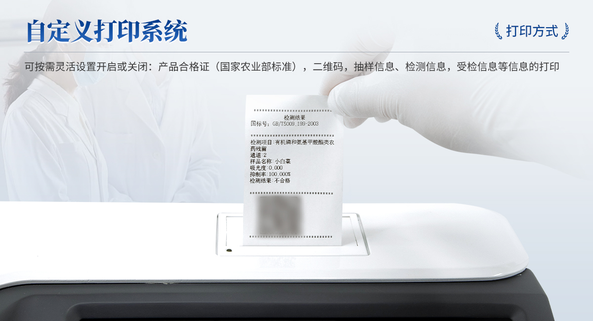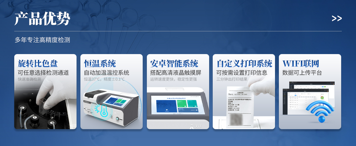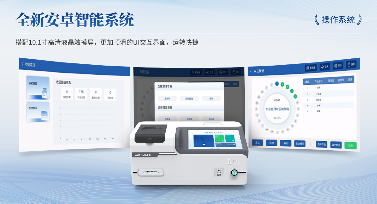 1. 試劑位置:3個(gè)2. 檢測(cè)形式:旋轉(zhuǎn)24通道比色盤(pán),可任意選擇檢測(cè)通道,自動(dòng)對(duì)應(yīng)選擇通道。3. 系統(tǒng)配置:10.1寸高清液晶觸摸屏,采用ARM Cortex?-A7,RK3288/4核處理器,運(yùn)行內(nèi)存1GB。Android7.1.1 系統(tǒng)分辨率1280×800。4.恒溫系統(tǒng):具有自動(dòng)加溫溫控系統(tǒng),精準(zhǔn)恒溫37℃,精度±0.1℃。5.添加系統(tǒng):儀器按照試劑要求自動(dòng)、按時(shí)、按量加入試劑,并且自動(dòng)對(duì)未正常放置的樣本或異常的樣本進(jìn)行檢查并提示。 6.清洗功能:儀器具備回流及自動(dòng)清洗管路功能,避免試劑污染。7.混勻功能:設(shè)備具備自動(dòng)混勻功能。8.光源校準(zhǔn):設(shè)備可自動(dòng)校準(zhǔn),確保檢測(cè)準(zhǔn)確度。9.實(shí)時(shí)監(jiān)控:儀器測(cè)試過(guò)程中屏幕顯示運(yùn)行狀態(tài),可實(shí)時(shí)查看。10.數(shù)據(jù)存儲(chǔ):內(nèi)部存儲(chǔ)16GB,可存儲(chǔ)500萬(wàn)條數(shù)據(jù)。11.樣品多選功能:設(shè)備具備樣品一鍵多選功能,選擇樣品自動(dòng)匹配檢測(cè)通道。12.項(xiàng)目預(yù)設(shè):可提前設(shè)置單個(gè)及多個(gè)相同或不相同的檢測(cè)任務(wù),可單次或者多次調(diào)取,減少檢測(cè)時(shí)間。13.自定義打印系統(tǒng):內(nèi)置自定義打印系統(tǒng),可按需靈活設(shè)置開(kāi)啟或關(guān)閉:產(chǎn)品合格證(國(guó)家農(nóng)業(yè)部標(biāo)準(zhǔn)),二維碼,抽樣信息、檢測(cè)信息,受檢信息等信息的打印。14.A4版本報(bào)告打印功能:設(shè)備可自動(dòng)生成A4版報(bào)告,A4報(bào)告帶二維碼,可掃描二維碼生成電子版,并可識(shí)別真?zhèn)巍?/td>15.傳輸方式:儀器配備無(wú)線通信模塊: 4G(APN)通訊模塊、Wifi模塊,藍(lán)牙傳輸模塊,同時(shí)具有USB接口以及RJ45接口能以多種方式實(shí)現(xiàn)數(shù)據(jù)保存和數(shù)據(jù)傳輸功能,設(shè)備數(shù)據(jù)可以同步上傳至平臺(tái)。16.數(shù)據(jù)監(jiān)管系統(tǒng):設(shè)備自帶監(jiān)管平臺(tái),并可同步對(duì)接監(jiān)管平臺(tái),數(shù)據(jù)可局域網(wǎng)和互聯(lián)網(wǎng)數(shù)據(jù)上傳,檢測(cè)結(jié)果可直接傳至食品安全監(jiān)管平臺(tái)。達(dá)到食品安全問(wèn)題預(yù)估、預(yù)警。17.系統(tǒng)遠(yuǎn)程更新功能:無(wú)需設(shè)備返廠,即可遠(yuǎn)程實(shí)時(shí)升級(jí)全新系統(tǒng),節(jié)省時(shí)間成本及避免運(yùn)輸造成設(shè)備損。