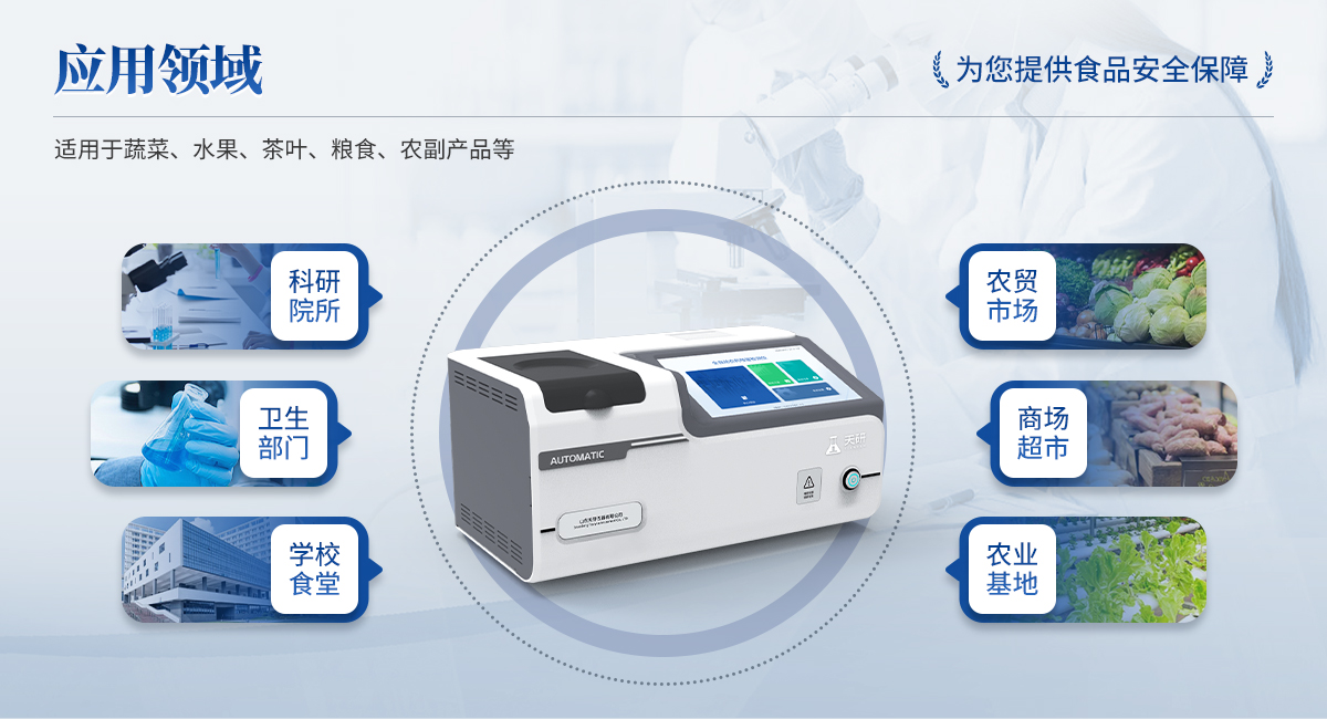 全自動(dòng)農(nóng)藥殘留檢測(cè)儀是依據(jù)國(guó)家標(biāo)準(zhǔn)方法(GB/T5009.199-2003),采用酶抑制率比色法對(duì)水果、蔬菜等農(nóng)產(chǎn)品中有機(jī)磷和氨基甲酸酯類農(nóng)藥含量進(jìn)行快速準(zhǔn)確的檢測(cè)。該設(shè)備廣泛應(yīng)用于蔬菜批發(fā)市場(chǎng)、超市、商場(chǎng)、食藥監(jiān)等部門(mén)的蔬菜和水果中的農(nóng)藥殘留檢測(cè)。