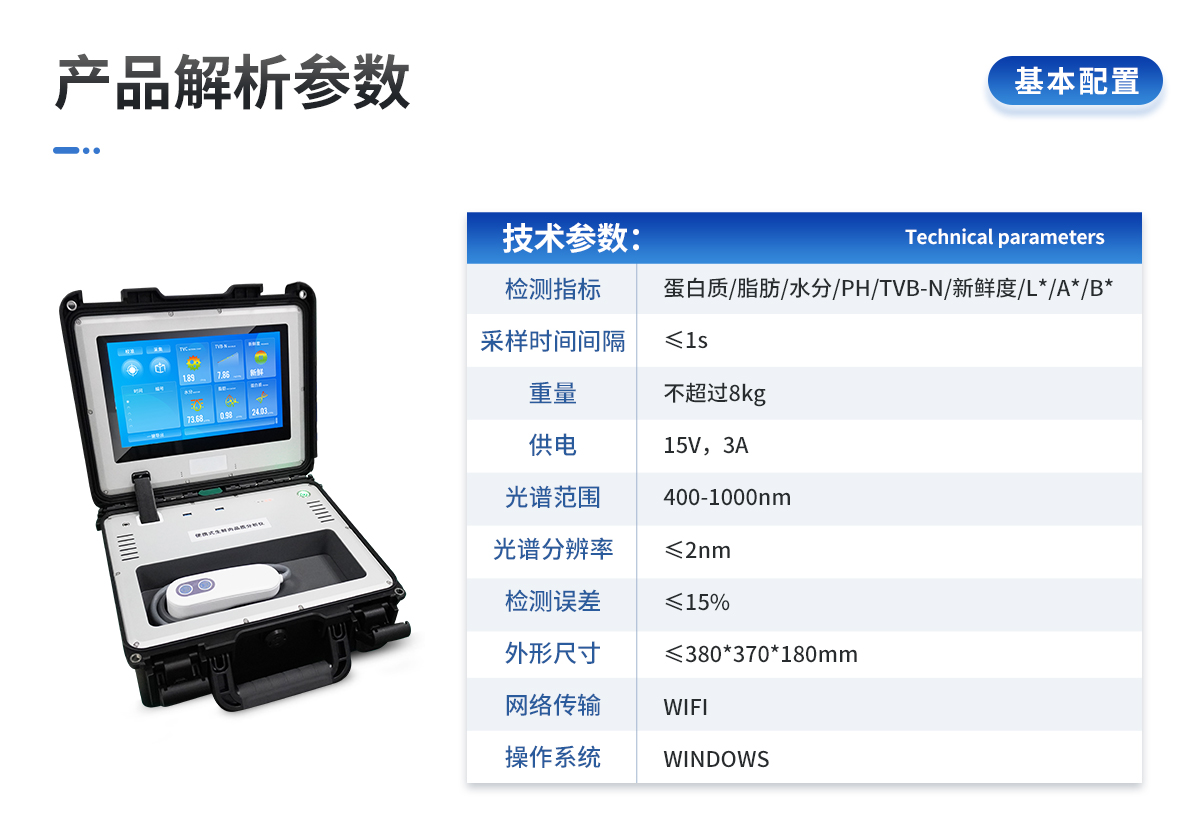 | 1. ※檢測(cè)指標(biāo):蛋白質(zhì)、脂肪、水分、PH、TVB-N、新鮮度、L*、A*、B* | 2. 采樣時(shí)間間隔:≤1s | 3. 重量:不超過(guò)8kg | 4. 供電:15V,3A | 5. 觸摸液晶顯示屏操作,屏幕尺寸不小于11寸 | 6. ※光譜范圍:400-1000nm | 7. ※光譜分辨率:≤2nm | 8. 檢測(cè)誤差:≤15% | 9. ※提供模型自動(dòng)優(yōu)化平臺(tái),用戶可通過(guò)設(shè)備建立和優(yōu)化算法模型 | 10. 外形尺寸:≤380*370*180mm | 11. 網(wǎng)絡(luò)傳輸:WIFI | 12. 操作系統(tǒng):WINDOWS | 13. 采用便攜式手提箱設(shè)計(jì),外殼為ABS防沖擊材料,適合在現(xiàn)場(chǎng)快速檢測(cè) |