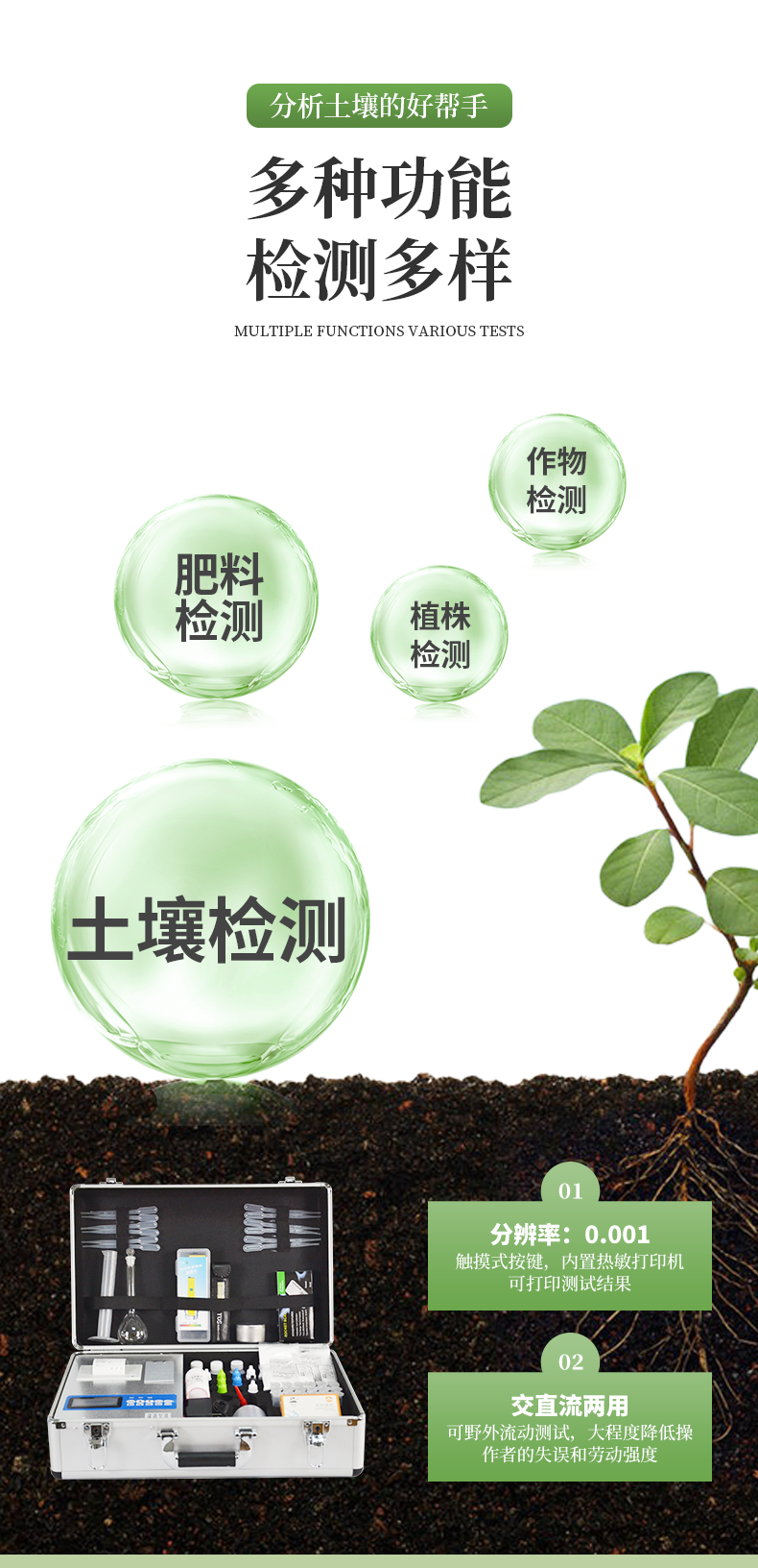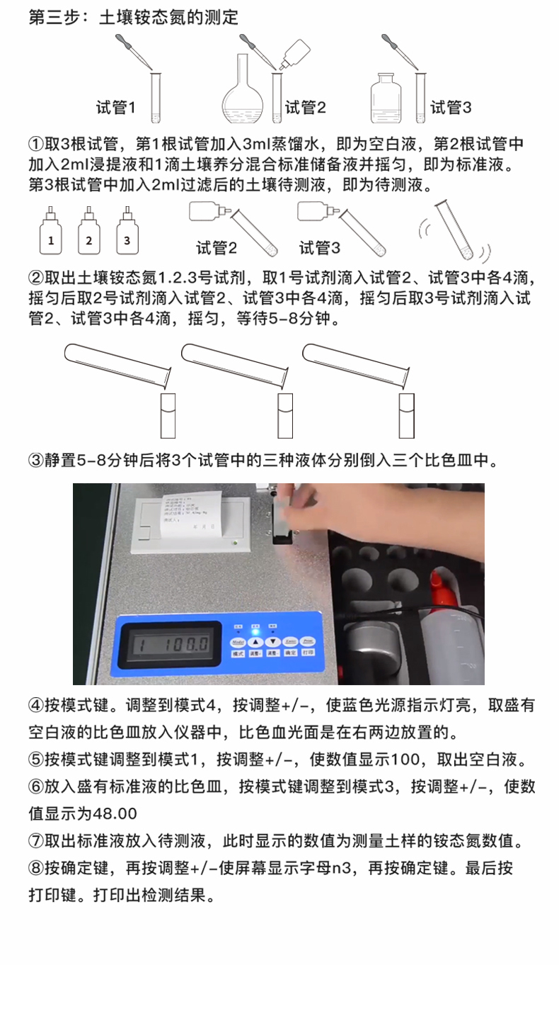 《機(jī)箱/藥劑一體式鋁合金機(jī)箱》設(shè)計(jì),便于攜帶、堅(jiān)固耐用,配套成品藥劑。微電腦控制,數(shù)字化線路、程序化設(shè)計(jì),液晶顯示,交直流兩用,可野外流動(dòng)測(cè)試,大程度降低操作者的失誤和勞動(dòng)強(qiáng)度。分辨率:0.001,觸摸式按鍵,內(nèi)置熱敏打印機(jī),可打印測(cè)試結(jié)果。全項(xiàng)目土壤肥料養(yǎng)分速測(cè)儀可檢測(cè)土壤及化肥、有機(jī)肥(含葉面肥、水溶肥、噴施肥等)、植株中的速效氮、速效磷、有效鉀、全氮、全磷、全鉀、有機(jī)質(zhì)、酸堿度,鈣、鎂、硫、鐵、錳、硼、鋅、銅、氯、硅等各種中微量元素。采用高亮LED光源,濾光式處理,保證光源波長(zhǎng)穩(wěn)定, 硅半導(dǎo)體作為信號(hào)接收系統(tǒng), 壽命長(zhǎng)達(dá)10萬(wàn)小時(shí)級(jí)別。光源穩(wěn)定,重現(xiàn)性好,準(zhǔn)確度高。比色槽部分采用單通道設(shè)計(jì),無(wú)機(jī)械位移及磨損,光路測(cè)試定位**,保證測(cè)定結(jié)果精度。配套專(zhuān)家施肥系統(tǒng)數(shù)據(jù),可對(duì)百余種全國(guó)農(nóng)業(yè)、果樹(shù)、 經(jīng)濟(jì)作物的目標(biāo)產(chǎn)量科學(xué)計(jì)算推薦施肥量。采用高精度濾光片技術(shù)自主**分析方法(**號(hào):ZL 2018 2 1777724.7),保證檢測(cè)結(jié)果優(yōu)于國(guó)標(biāo)要求。
