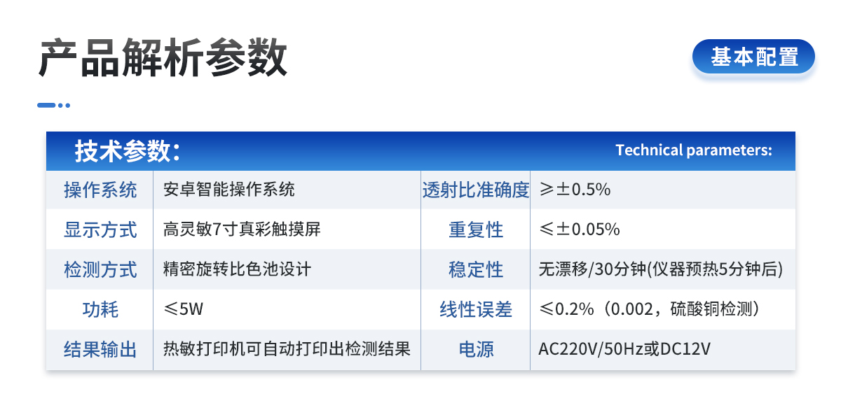 1.電源:交流 220±22V   直流 12V+5V(儀器內(nèi)置鋰電池也可用車載電源)2.功率: ≤5W3.量程及分辨率:0.001-99994.重復(fù)性誤差: ≤0.02%(0.0002,重鉻酸鉀溶液)5.儀器穩(wěn)定性:一個(gè)小時(shí)內(nèi)顯示數(shù)字無漂移(透光度測(cè)量);兩個(gè)小時(shí)內(nèi)數(shù)字漂移不超過0.3%(0.003,透光度測(cè)量)、0.001(吸光度測(cè)量)。6.線性誤差: ≤0.1%(0.001,硫酸銅檢測(cè))7.靈敏度:紅光≥4.5 ×10-5  藍(lán)光≥3.17×10-3  綠光≥2.35×10-3  橙光≥2.13×10-38.波長(zhǎng)范圍 :紅光:680±2nm; 藍(lán)光:420±2nm; 綠光:510±2nm;橙光:590±4nm9.顯示屏分辨率:1024*60010.抗震等級(jí):IP6511、儀器尺寸:48×34.5×22cm12、主機(jī)凈重:5.2kg