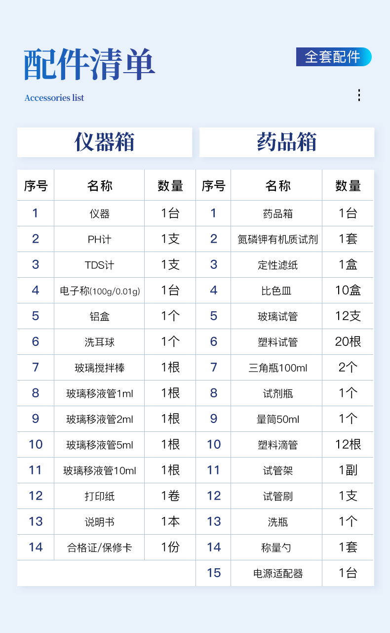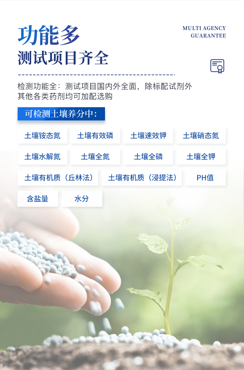 | 配套齊全:該儀器無需用戶自配附件,相當(dāng)于一個(gè)小型實(shí)驗(yàn)室。適于農(nóng)業(yè)服務(wù)部門或農(nóng)資經(jīng)銷商、合作社、肥料廠商、大種植戶測(cè)土施肥。 | 檢測(cè)功能全:測(cè)試項(xiàng)目國(guó)內(nèi)外全面,除標(biāo)配試劑外,其他各類藥劑均可加配選購。 | 操作簡(jiǎn)便、速度快捷,配套整套附件及成品藥劑開瓶即用,無須配置。 |
