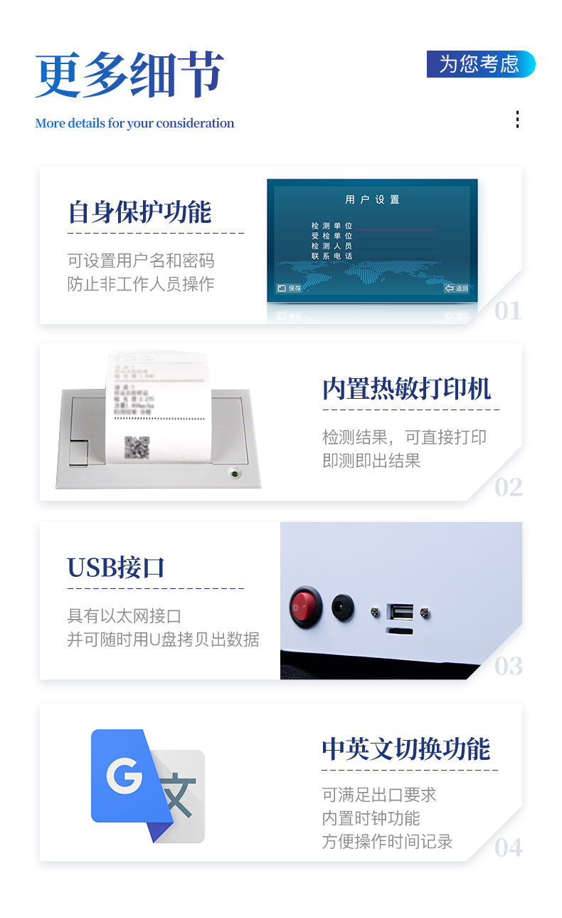 | 1、本儀器集各功能于一身,無需用戶自配附件,可靈活流動(dòng)檢測(cè)。 | 2、安卓智能操作系統(tǒng),主控芯片采用ARM Cortex-A7,RK3288/4核處理器,主頻1.88Ghz,運(yùn)轉(zhuǎn)速度更快速,穩(wěn)定性更強(qiáng)。 | 3、12個(gè)檢測(cè)通道(固態(tài)化設(shè)計(jì)),一次性可快速檢測(cè)6個(gè)樣品,極大提升檢測(cè)效率,降低檢測(cè)成本。 | 4、檢測(cè)過程中內(nèi)置校準(zhǔn)功能,智能恒流穩(wěn)壓,光強(qiáng)自動(dòng)校準(zhǔn),確保檢測(cè)準(zhǔn)確度。 | 5、內(nèi)置作物專家施肥系統(tǒng),可對(duì)百余種全國(guó)農(nóng)業(yè)經(jīng)濟(jì)作物、果樹等的目標(biāo)產(chǎn)量計(jì)算推薦施肥量,依據(jù)施肥配方科學(xué)指導(dǎo)農(nóng)業(yè)生產(chǎn)。測(cè)土配方施肥結(jié)果可打印,打印內(nèi)容包含:作物種類、肥料種類、目標(biāo)產(chǎn)量、需求總量、建議施肥方案。 | 6、儀器標(biāo)配wifi無線上傳、4G聯(lián)網(wǎng)傳輸、GPRS無線遠(yuǎn)傳功能,快速上傳數(shù)據(jù)。 | 7、儀器內(nèi)置大容量?jī)?nèi)存,支持查看全部歷史檢測(cè)記錄,以及傳輸所有檢測(cè)數(shù)據(jù)。 | 8、配有智慧云農(nóng)業(yè)平臺(tái),儀器連入無線網(wǎng)絡(luò)后,可將檢測(cè)數(shù)據(jù)可選擇性或批量無線上傳,方便用戶進(jìn)行長(zhǎng)期數(shù)據(jù)管理和可視化分析。 | 9、儀器同時(shí)具有USB接口、以太網(wǎng)接口,并可隨時(shí)用U盤拷貝出數(shù)據(jù)。 | 10、可用手機(jī)隨時(shí)登錄云平臺(tái)在線移動(dòng)查看歷史數(shù)據(jù) | 11、內(nèi)置植物營(yíng)養(yǎng)診斷標(biāo)準(zhǔn)圖譜,根據(jù)各農(nóng)作物營(yíng)養(yǎng)缺失的圖片,進(jìn)行葉面對(duì)比,診斷豐缺。 | 12、4波長(zhǎng)專業(yè)測(cè)試?yán)涔庠矗t、藍(lán)、綠、橙),光源波長(zhǎng)穩(wěn)定,長(zhǎng)時(shí)間連續(xù)工作光源無溫漂現(xiàn)象,壽命長(zhǎng)達(dá)10萬小時(shí)級(jí)別,重現(xiàn)性好,準(zhǔn)確度高。 | 13、比色池部分采用標(biāo)準(zhǔn)1cm比色皿,無機(jī)械位移及磨損,光路測(cè)試定位**,有效屏蔽外光干擾,保證檢測(cè)結(jié)果優(yōu)于國(guó)標(biāo)要求。 | 14、儀器系統(tǒng)內(nèi)帶有樣品前處理操作視頻,各種樣品檢測(cè)方法點(diǎn)擊視頻模塊即可觀看,檢測(cè)人員無需自學(xué)說明書,指導(dǎo)教學(xué)方便快速,方便新手快速操作。 | 15、內(nèi)置新一代高速熱敏打印機(jī)(無需色帶),打印內(nèi)容包含:檢測(cè)單位、檢測(cè)人員、檢測(cè)項(xiàng)目、通道號(hào)、吸光度、養(yǎng)分含量(mg/kg)、檢測(cè)時(shí)間、以及二維碼等信息 | 16、高靈敏7寸真彩觸摸屏,采用更加**和人性化操作,高清晰高交互顯示,大程度降低傳統(tǒng)儀器的繁瑣操作和失誤。 | 17、內(nèi)置時(shí)鐘功能,方便操作時(shí)間記錄,長(zhǎng)期歷史追溯。 | 18、可設(shè)置多賬戶賬號(hào)密碼登錄,**UI交互界面,不同的用戶可自由添加編輯檢測(cè)信息,保存后可長(zhǎng)期使用。 | 19、GPS功能:可在野外作業(yè)時(shí)記錄經(jīng)緯度地點(diǎn),滿足特殊用戶需求。 | 20、內(nèi)置低電壓提示功能,可在檢測(cè)時(shí)明確電量,避免測(cè)試數(shù)據(jù)偏移,同時(shí)具有斷電保護(hù)功能,斷電自動(dòng)保存數(shù)據(jù),防止數(shù)據(jù)丟失。 | 21、交直流兩用供電方式,內(nèi)置大容量充電鋰電池,滿電狀態(tài)下可連續(xù)工作10余小時(shí),同時(shí)可外接車載電源蓄電。 | 22、儀器具有中英文切換功能,可滿足出口要求。 |