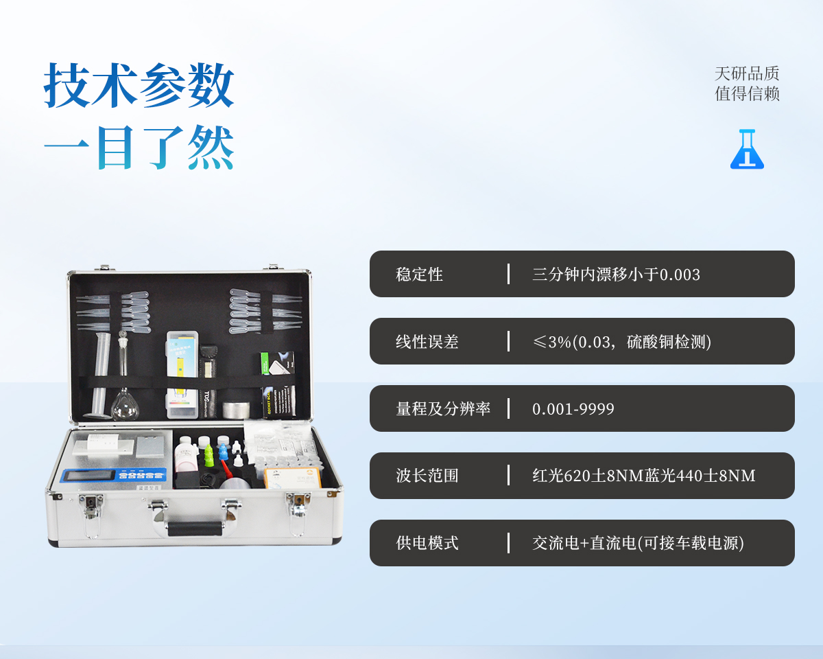 功能全:測(cè)試項(xiàng)目國(guó)內(nèi)外全面(各類藥劑均可選購(gòu))。配套齊全,該儀器集藥、器、儀為一體,攜帶方便,相當(dāng)于一個(gè)小型實(shí)驗(yàn)室,用戶只需提供蒸餾水即可在要求時(shí)間內(nèi)完成全部操作。適于農(nóng)業(yè)服務(wù)部門或農(nóng)資經(jīng)銷商鑒別肥料真假、肥料廠商肥料生產(chǎn)中控、農(nóng)資質(zhì)檢部門進(jìn)行農(nóng)資打假,規(guī)范農(nóng)資市場(chǎng)。性能可靠:工作穩(wěn)定性優(yōu)于國(guó)家標(biāo)準(zhǔn)JJG179-90指標(biāo)的10倍以上,重復(fù)性達(dá)到光柵型分光光度計(jì)指標(biāo)水平。