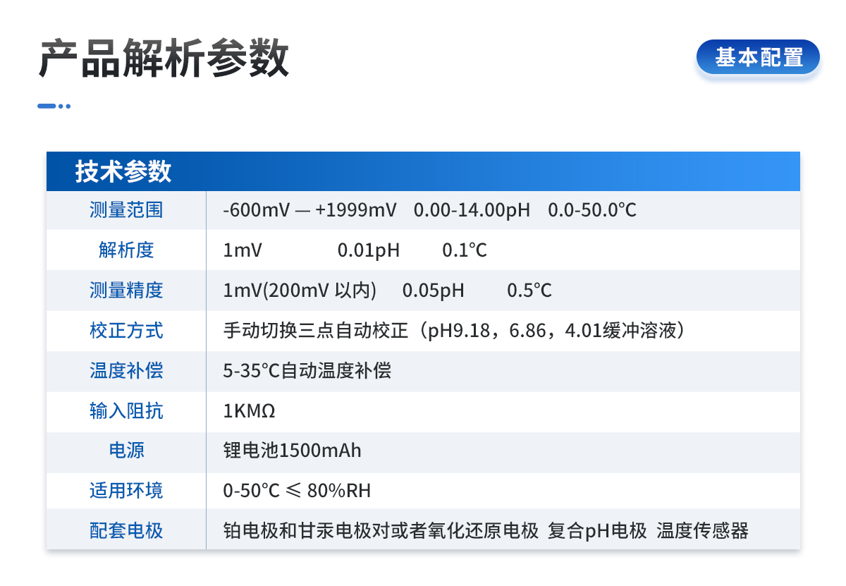 測(cè)量范圍:-600mV — +1999mV    0.00-14.00pH    0.0-50.0℃解 析 度:1mV                  0.01pH          0.1℃測(cè)量精度:1mV(200mV 以內(nèi))      0.05pH          0.5℃校正方式:手動(dòng)切換三點(diǎn)自動(dòng)校正(pH9.18,6.86,4.01緩沖溶液)溫度補(bǔ)償:5-35℃自動(dòng)溫度補(bǔ)償輸入阻抗:1KMΩ電    源:鋰電池1500mAh適用環(huán)境:0-50℃ ≤ 80%RH配套電極:鉑電極和甘汞電極對(duì)或者氧化還原電極  復(fù)合pH電極  溫度傳感器電  源:4×12V AA電池,連續(xù)工作時(shí)間大于20小時(shí)測(cè)量時(shí)間:30-45min儀器尺寸:200×85×40重  量:500g