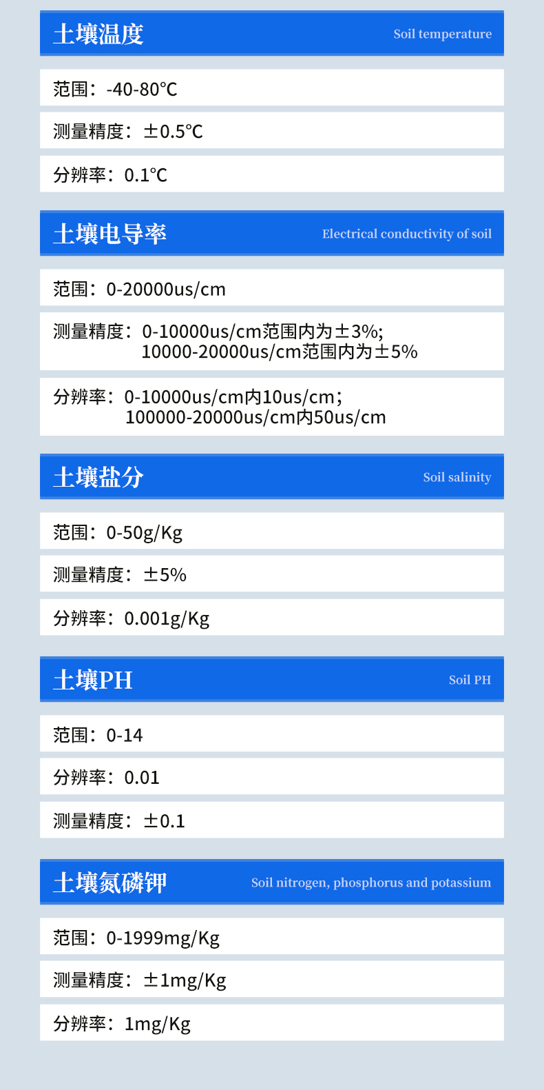 土壤水分:土壤容積含水量(%);范圍:0-100%;測(cè)量精度:0-50%范圍內(nèi),±2% ;50-100%范圍內(nèi),±3%;分辨率:0.1%;互換精度:<3%>土壤溫度:范圍:-40-80℃                測(cè)量精度:±0.5℃                分辨率:0.1℃                土壤電導(dǎo)率:                范圍:0-20000us/cm                測(cè)量精度:0-10000us/cm范圍內(nèi)為±3%;10000-20000us/cm范圍內(nèi)為±5%                分辨率:0-10000us/cm內(nèi)10us/cm;100000-20000us/cm內(nèi)50us/cm土壤鹽分:范圍:0-50g/Kg                測(cè)量精度:±5%                分辨率:0.001g/Kg土壤PH:范圍:0-14                分辨率:0.01                測(cè)量精度:±0.1土壤氮磷鉀:范圍:0-1999mg/Kg                測(cè)量精度:±1mg/Kg                分辨率:1mg/Kg                儀器尺寸:204*100*36(mm)(長(zhǎng)*寬*高)                重量:0.3kg                軟件:上位機(jī)軟件免費(fèi)贈(zèng)送                包裝尺寸:450*190*350mm                包裝重量:3.6kg