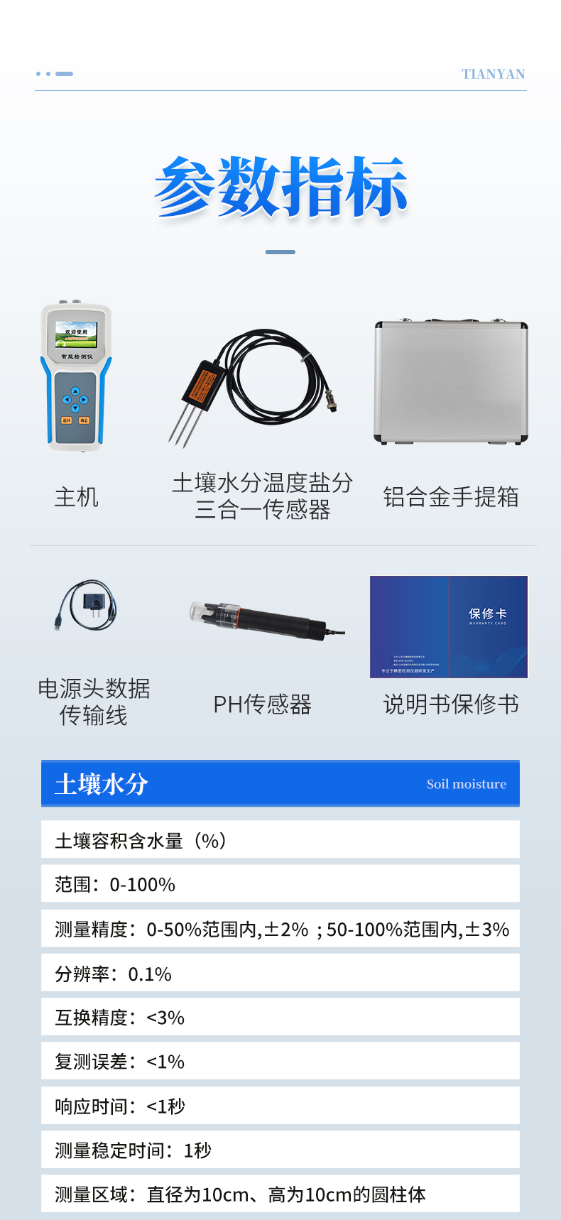 | 土壤水分:土壤容積含水量(%) 范圍:0-100% 測(cè)量精度:0-50%范圍內(nèi),±2% ;50-100%范圍內(nèi),±3% 分辨率:0.1% 互換精度:<3%> | 土壤電導(dǎo)率:范圍:0-20000us/cm 測(cè)量精度:0-10000us/cm范圍內(nèi)為±3%;10000-20000us/cm范圍內(nèi)為±5% 分辨率:0-10000us/cm內(nèi)10us/cm;100000-20000us/cm內(nèi)50us/cm | 土壤溫度:范圍:-40-80℃ 測(cè)量精度:±0.5℃ 分辨率:0.1℃ | 土壤鹽分:范圍:0-50g/Kg 測(cè)量精度:±5% 分辨率:0.001g/Kg | 土壤PH:范圍:0-14 分辨率:0.01 測(cè)量精度:±0.1 | 土壤氮磷鉀:范圍:0-1999mg/Kg 測(cè)量精度:±1mg/Kg 分辨率:1mg/Kg 儀器尺寸:204*100*36(mm)(長(zhǎng)*寬*高) 重量:0.3kg 軟件:上位機(jī)軟件免費(fèi)贈(zèng)送 包裝尺寸:450*190*350mm 包裝重量:3.6kg |