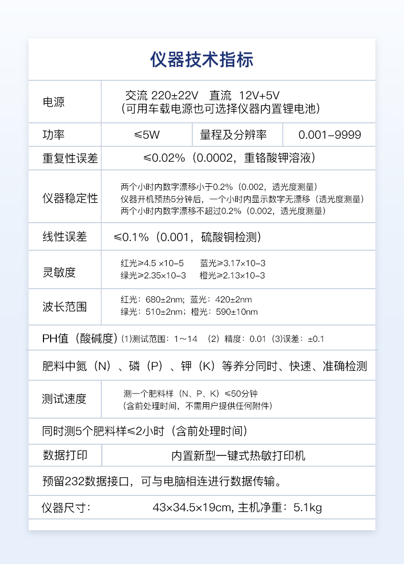1.電源:交流 220±22V 直流 12V+5V(可用車載電源也可選擇儀器內(nèi)置鋰電池)2.功率: ≤5W3.量程及分辨率:0.001-99994.重復(fù)性誤差: ≤0.02%(0.0002,重鉻酸鉀溶液)5.儀器穩(wěn)定性:兩個(gè)小時(shí)內(nèi)數(shù)字漂移小于0.2%(0.002,透光度測(cè)量)。儀器開(kāi)機(jī)預(yù)熱5分鐘后,一個(gè)小時(shí)內(nèi)顯示數(shù)字無(wú)漂移(透光度測(cè)量),兩個(gè)小時(shí)內(nèi)數(shù)字漂移不超過(guò)0.2%(0.002,透光度測(cè)量)。6.線性誤差: ≤0.1%(0.001,硫酸銅檢測(cè))7.靈敏度:紅光≥4.5 ×10-5 藍(lán)光≥3.17×10-3 綠光≥2.35×10-3 橙光≥2.13×10-38.波長(zhǎng)范圍 :紅光:680±2nm; 藍(lán)光:420±2nm;綠光:510±2nm;橙光:590±10nm9.PH值(酸堿度): (1)測(cè)試范圍:1~14 (2)精度:0.01 (3)誤差:±0.110.肥料中氮(N)、磷(P)、鉀(K)等養(yǎng)分同時(shí)、快速、準(zhǔn)確檢測(cè)11.測(cè)試速度:測(cè)一個(gè)肥料樣(N、P、K)≤50分鐘(含前處理時(shí)間,不需用戶提供任何附件)12.同時(shí)測(cè)5個(gè)肥料樣≤2小時(shí)(含前處理時(shí)間)13.數(shù)據(jù)打?。簝?nèi)置新型一鍵式熱敏打印機(jī)14.預(yù)留232數(shù)據(jù)接口,可與電腦相連進(jìn)行數(shù)據(jù)傳輸。15.儀器尺寸:43×34.5×19cm, 主機(jī)凈重:5.1kg16.儀器包裝尺寸:510*390*375mm,包裝重量:11.5kg