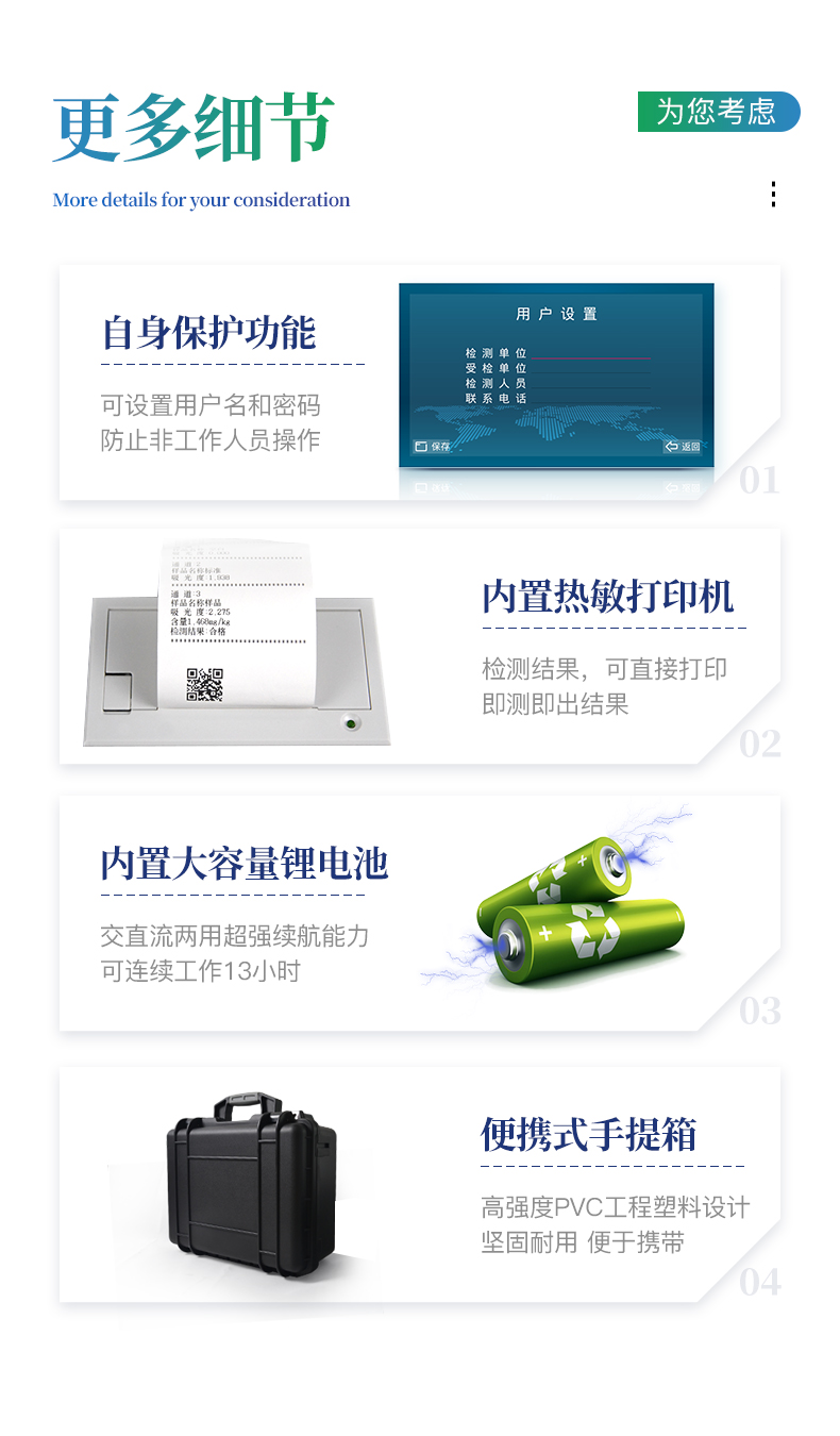 1、可檢測(cè)化肥、有機(jī)肥(含葉面肥、水溶肥、噴施肥等)、植株中的速效氮、速效磷、有效鉀、全氮、全磷、全鉀、有機(jī)質(zhì)、酸堿度,鈣、鎂、硫、鐵、錳、硼、鋅、銅、氯、硅、鉬等各種中微量元素以及鉛、鉻、鎘、汞、砷、鎳、鋁、氟、鈦、硒等各種重金屬含量。2、安卓智能操作系統(tǒng),采用更加**和人性化操作,儀器標(biāo)配wifi聯(lián)網(wǎng)上傳、4G聯(lián)網(wǎng)傳輸、GPRS無(wú)線遠(yuǎn)傳,快速上傳數(shù)據(jù)。3、內(nèi)置作物專家施肥系統(tǒng),可對(duì)百余種全國(guó)農(nóng)業(yè)、果樹(shù)、經(jīng)濟(jì)作物的目標(biāo)產(chǎn)量計(jì)算推薦施肥量,依據(jù)施肥配方科學(xué)指導(dǎo)農(nóng)業(yè)生產(chǎn)。4、采用精密旋轉(zhuǎn)比色池設(shè)計(jì),光源一致性更加**保證檢測(cè)精度。一次性可快速檢測(cè)12個(gè)樣品,極大提升檢測(cè)效率,降低檢測(cè)成本。5、內(nèi)置植物營(yíng)養(yǎng)診斷標(biāo)準(zhǔn)圖譜,根據(jù)各農(nóng)作物營(yíng)養(yǎng)缺失的圖片,進(jìn)行葉面對(duì)比,診斷豐缺。6、采用高精度濾光片技術(shù)自主**分析方法(**號(hào):ZL 2018 2 1777724.7),比色槽部分采用標(biāo)準(zhǔn)1cm比色皿,無(wú)機(jī)械位移及磨損,光路測(cè)試定位**,保證檢測(cè)結(jié)果優(yōu)于國(guó)標(biāo)要求。7、儀器配有數(shù)據(jù)接收平臺(tái),無(wú)需數(shù)據(jù)線,數(shù)據(jù)可直接局域網(wǎng)和互聯(lián)網(wǎng)無(wú)線上傳,方便進(jìn)行數(shù)據(jù)管理和數(shù)據(jù)長(zhǎng)期分析。8、儀器內(nèi)置新一代高速熱敏打印機(jī),檢測(cè)完成可自動(dòng)打印檢測(cè)報(bào)告和二維碼。9、高靈敏7寸電容觸摸屏,高清晰高交互顯示,大程度降低傳統(tǒng)儀器的繁瑣操作和失誤。10、每個(gè)通道均配置四波長(zhǎng)冷光源,所有光源實(shí)現(xiàn)恒流穩(wěn)壓,保證波長(zhǎng)穩(wěn)定。 硅半導(dǎo)體作為信號(hào)接收系統(tǒng),壽命長(zhǎng)達(dá)10萬(wàn)小時(shí)級(jí)別。重現(xiàn)性好,準(zhǔn)確度高。11、高強(qiáng)度PVC工程塑料手提箱設(shè)計(jì),堅(jiān)固耐用,便于攜帶,供電方式為交直流兩用,可野外流動(dòng)測(cè)試配套成品藥劑。