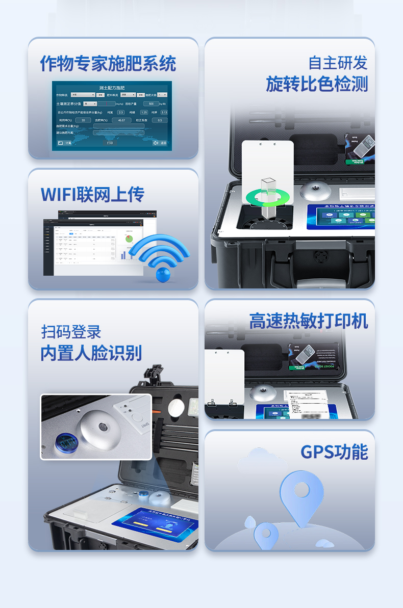 1、安卓智能操作系統(tǒng)Android 7.1版本,主控芯片采用ARM Cortex-A7,RK3288/4核處理器,主頻1.88Ghz,運轉(zhuǎn)速度更快速,穩(wěn)定性更強。2、可檢測各種土壤、肥料、作物、食品、水質(zhì)、環(huán)境等共200多個測試項目,一機多用,功能齊全。3、測試速度更快!無需空白對照和標準校準,省卻以往繁瑣的操作步驟,一鍵式操作,直接讀取數(shù)據(jù),**率,低消耗。4、采用精密旋轉(zhuǎn)比色池設計(**號:ZL 2018 2 1777724.7),光源一致性更加**,保證檢測精度。5、12個旋轉(zhuǎn)檢測通道,一次性可快速檢測12個樣品,極大提升檢測效率,降低檢測成本。6、采用高精度濾光片技術(shù)自主**分析方法(**號:ZL 2020 2 1763837.9),**認證。7、具有自身保護功能,內(nèi)置人臉識別攝像頭可掃臉登錄,也可設置用戶名和密碼,防止非工作人員操作查看實驗數(shù)據(jù)。8、檢測過程中內(nèi)置校準功能,智能恒流穩(wěn)壓,光強自動校準,確保檢測準確度,取得中國計量科學研究院的《校準證書》。9、儀器標配wifi無線上傳、4G聯(lián)網(wǎng)傳輸、GPRS無線遠傳,快速上傳數(shù)據(jù)。10、配有智慧云農(nóng)業(yè)平臺,儀器連入無線網(wǎng)絡后,可將檢測數(shù)據(jù)可選擇性或批量無線上傳,方便用戶進行數(shù)據(jù)管理和長期分析。11、儀器配同時具有USB接口、以太網(wǎng)接口,內(nèi)置大容量內(nèi)存,并可隨時用U盤拷貝數(shù)據(jù)。12、可用手機隨時登錄云平臺在線移動查看歷史數(shù)據(jù)13、內(nèi)置作物專家施肥系統(tǒng),可對百余種全國農(nóng)業(yè)經(jīng)濟作物、果樹等的目標產(chǎn)量計算推薦施肥量,依據(jù)施肥配方科學指導農(nóng)業(yè)生產(chǎn)。測土配方施肥結(jié)果可打印,打印內(nèi)容包含:作物種類、肥料種類、目標產(chǎn)量、需求總量、建議施肥方案。14、內(nèi)置植物營養(yǎng)診斷標準圖譜,根據(jù)各農(nóng)作物營養(yǎng)缺失的圖片,進行葉面對比,診斷豐缺。15、4波長專業(yè)測試冷光源(紅、藍、綠、橙),光源波長穩(wěn)定,長時間連續(xù)工作光源無溫漂現(xiàn)象,壽命長達10萬小時級別,重現(xiàn)性好,準確度高。16、比色池部分采用標準1cm比色皿,無機械位移及磨損,光路測試定位**,有效屏蔽外光干擾,保證檢測結(jié)果優(yōu)于國標要求。17、儀器系統(tǒng)內(nèi)帶有樣品前處理操作視頻,各種樣品檢測方法點擊視頻模塊即可觀看,檢測人員無需自學說明書,指導教學方便快速,方便新手快速操作。18、內(nèi)置新一代高速熱敏打印機(無需色帶),打印內(nèi)容包含:檢測單位、檢測人員、檢測項目、通道號、吸光度、養(yǎng)分含量(mg/kg)、檢測時間、以及二維碼等信息19、高靈敏7寸真彩觸摸屏,采用更加**和人性化操作,高清晰高交互顯示,大程度降低傳統(tǒng)儀器的繁瑣操作和失誤,并取得多項《軟件著作權(quán)》。20、內(nèi)置時鐘功能,方便操作時間記錄,長期歷史追溯。21、可設置多賬戶賬號密碼登錄,**UI交互界面,不同的用戶可自由添加編輯檢測信息,保存后可長期使用。22、GPS功能:可在野外作業(yè)時記錄經(jīng)緯度地點,滿足特殊用戶需求。23、內(nèi)置低電壓提示功能,可在檢測時明確電量,避免測試數(shù)據(jù)偏移,同時具有斷電保護功能,斷電自動保存數(shù)據(jù),防止數(shù)據(jù)丟失。24、交直流兩用供電方式,內(nèi)置大容量充電鋰電池,滿電狀態(tài)下可連續(xù)工作10余小時,同時可外接車載電源蓄電。25、儀器具有中英文切換功能,可滿足出口要求。26、高強度PVC工程塑料手提箱設計,堅固耐用,便于攜帶。