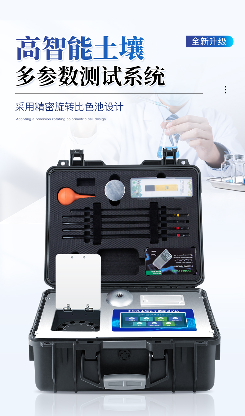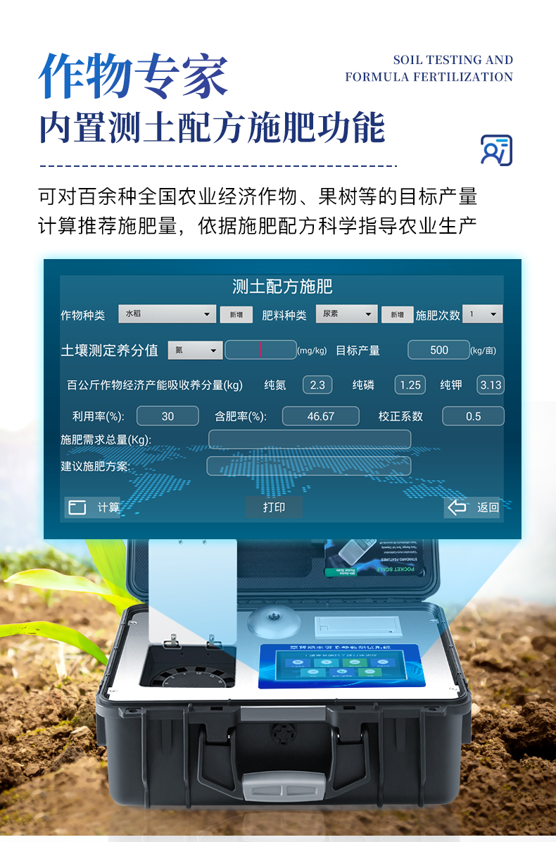 配套齊全:該儀器集藥、器、儀為一體,攜帶方便,相當于一個小型移動實驗室,無需用戶自配附件,亦可靈活野外流動測試。適于農(nóng)業(yè)服務部門或農(nóng)資經(jīng)銷商、高教院校、科研院所、合作社、肥料廠商、大種植戶測土施肥和鑒別肥料真假及環(huán)保檢測應用。檢測功能全:測試項目國內(nèi)外全面,除標配試劑外,其他各類藥劑均可加配選購。速度快捷:無需空白對照和標準校準,操作簡便、直接測試,配套成品藥劑開瓶即用,無須配置。
