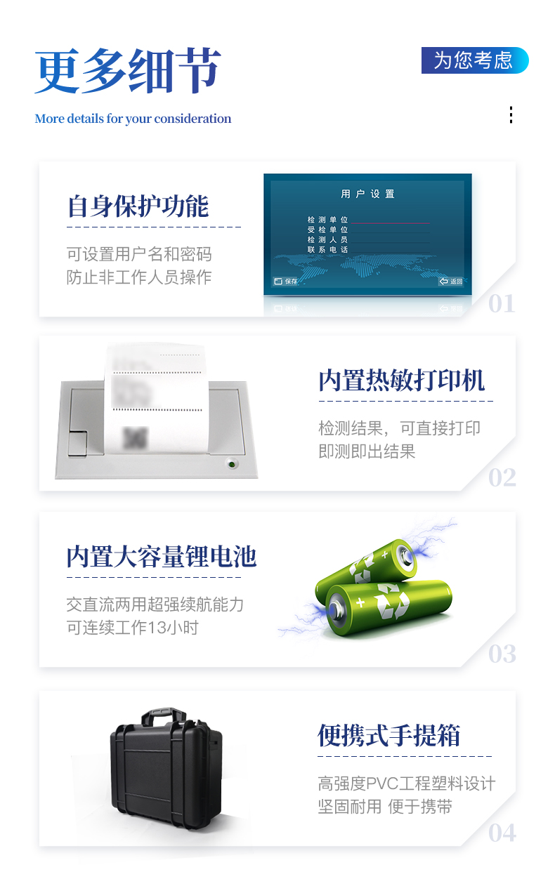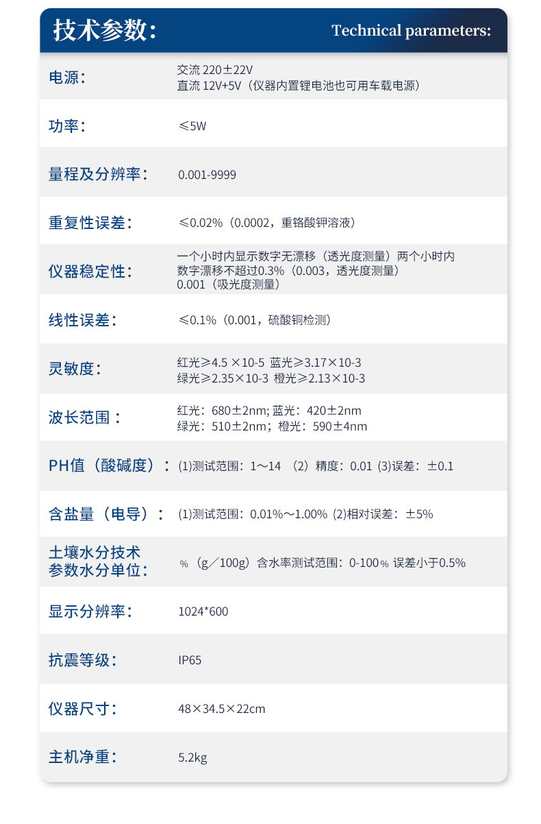 1、電源:交流 220±22V 直流 12V+5V(儀器內(nèi)置鋰電池也可用車載電源)2、功率: ≤5W3、量程及分辨率:0.001-99994、重復性誤差: ≤0.02%(0.0002,重鉻酸鉀溶液)5、儀器穩(wěn)定性:一個小時內(nèi)顯示數(shù)字無漂移(透光度測量);兩個小時內(nèi)數(shù)字漂移不超過0.3%(0.003,透光度測量)、0.001(吸光度測量)。6、線性誤差: ≤0.1%(0.001,硫酸銅檢測)7、靈敏度:紅光≥4.5 ×10-5 藍光≥3.17×10-3 綠光≥2.35×10-3 橙光≥2.13×10-38、波長范圍 :紅光:680±2nm; 藍光:420±2nm; 綠光:510±2nm;橙光:590±4nm9、PH值(酸堿度): (1)測試范圍:1~14 (2)精度:0.01 (3)誤差:±0.110、含鹽量(電導):(1)測試范圍:0.01%~1.00% (2)相對誤差:±5%11、土壤水分技術(shù)參數(shù)水分單位:﹪(g/100g);含水率測試范圍:0-100﹪;誤差小于0.5%12、顯示屏分辨率:1024*60013、抗震等級:IP6514、抗震等級:IP6515、主機凈重:5.2kg16、包裝尺寸:510*390*375mm17、包裝重量:12kg