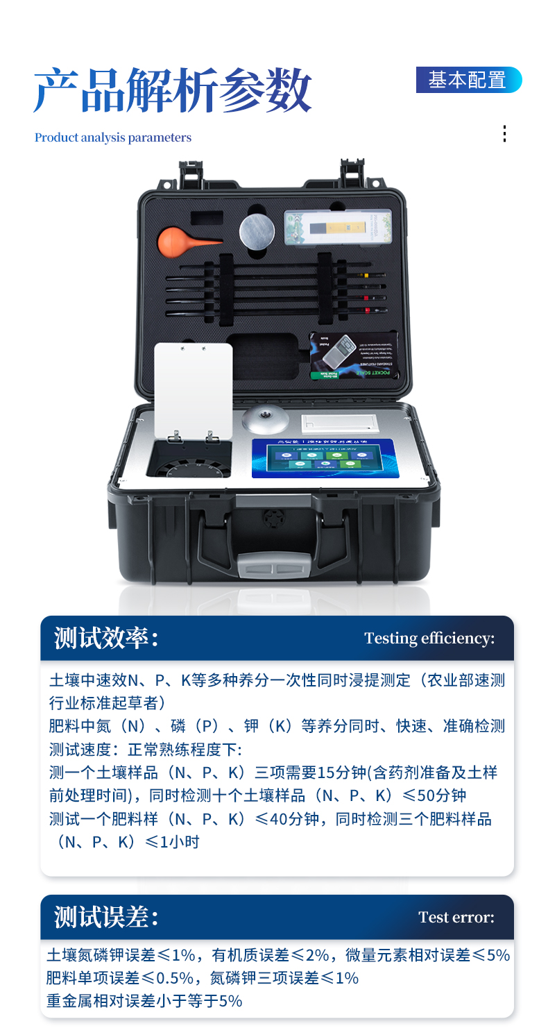 土壤中速效N、P、K等多種養(yǎng)分一次性同時浸提測定(農(nóng)業(yè)部速測行業(yè)標準起草者)。肥料中氮(N)、磷(P)、鉀(K)等養(yǎng)分同時、快速、準確檢測。測試速度:正常熟練程度下:測一個土壤樣品(N、P、K)三項需要15分鐘(含藥劑準備及土樣前處理時間),同時檢測十個土壤樣品(N、P、K)≤50分鐘。                測試一個肥料樣(N、P、K)≤40分鐘,同時檢測三個肥料樣品(N、P、K)≤1小時。