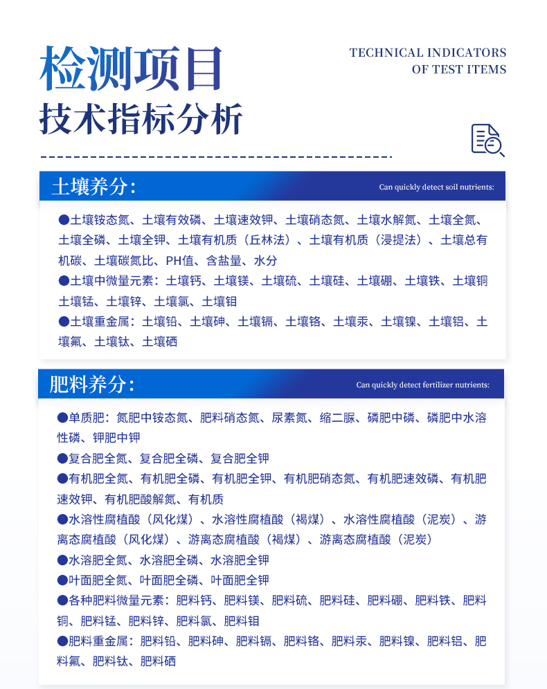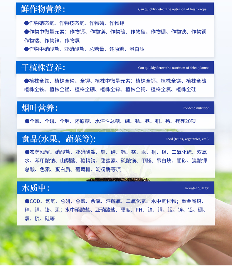 1、土壤養(yǎng)分:●土壤銨態(tài)氮、土壤有效磷、土壤速效鉀、土壤硝態(tài)氮、土壤堿解氮、土壤全氮、土壤全磷、土壤全鉀、土壤有機質(zhì)(丘林法)、土壤有機質(zhì)(浸提法)、土壤總有機碳、土壤碳氮比、PH值、含鹽量、水分?!裢寥乐形⒘吭兀和寥棱}、土壤鎂、土壤硫、土壤硅、土壤硼、土壤鐵、土壤銅、土壤錳、土壤鋅、土壤氯、土壤鉬;●土壤重金屬:土壤鉛、土壤砷、土壤鎘、土壤鉻、土壤汞、土壤鎳、土壤鋁、土壤氟、土壤鈦、土壤硒。2、肥料養(yǎng)分:●單質(zhì)肥:氮肥中銨態(tài)氮、肥料硝態(tài)氮、尿素氮、縮二脲、磷肥中磷、磷肥中水溶性磷、鉀肥中鉀;●復合肥全氮、復合肥全磷、復合肥全鉀;●有機肥全氮、有機肥全磷、有機肥全鉀、有機肥硝態(tài)氮、有機肥速效磷、有機肥速效鉀、有機肥酸解氮、有機質(zhì);●水溶性腐植酸(風化煤)、水溶性腐植酸(褐煤)、水溶性腐植酸(泥炭)、游離態(tài)腐植酸(風化煤)、游離態(tài)腐植酸(褐煤)、游離態(tài)腐植酸(泥炭);●水溶肥全氮、水溶肥全磷、水溶肥全鉀;●葉面肥全氮、葉面肥全磷、葉面肥全鉀;●各種肥料微量元素:肥料鈣、肥料鎂、肥料硫、肥料硅、肥料硼、肥料鐵、肥料銅、肥料錳、肥料鋅、肥料氯、肥料鉬;●肥料重金屬:肥料鉛、肥料砷、肥料鎘、肥料鉻、肥料汞、肥料鎳、肥料鋁、肥料氟、肥料鈦、肥料硒。3、鮮作物營養(yǎng):●作物硝態(tài)氮、作物銨態(tài)氮、作物磷、作物鉀;●作物中微量元素:作物鈣、作物鎂、作物硫、作物硅、作物硼、作物鐵、作物銅、作物錳、作物鋅、作物氯;●作物中硝酸鹽、亞硝酸鹽、總糖量、還原糖、蛋白質(zhì)。4、干植株營養(yǎng):●植株全氮、植株全磷、全鉀、植株中微量元素:植株全鈣、植株全鎂、植株全硫、植株全鐵、植株全錳、植株全硼、植株全鋅、植株全銅、植株全氯、植株全硅。5、煙葉營養(yǎng):●全氮、全磷、全鉀、還原糖、水溶性總糖、硼、錳、鐵、銅、鈣、鎂等20項。6、食品(水果、蔬菜等):●農(nóng)藥殘留、硝酸鹽、亞硝酸鹽、鉛、砷、鎘、鉻、汞、銅、鋁、二氧化硫、雙氧水、苯甲酸鈉、山梨酸、糖精鈉、甜蜜素、硫酸鎂、甲醛、吊白塊、硼砂、溴酸鉀、總酸、色素、蛋白質(zhì)、葡萄糖、淀粉酶等項。7、水質(zhì)中:COD、氨氮、總磷、總氮、余氯、溶解氧、二氧化氯、水中氰化物;重金屬鉛、砷、鎘、鉻、汞;水中硝酸鹽、亞硝酸鹽、硬度、PH、鐵、銅、錳、鋅、鋁、硼、氯、硫、硅等