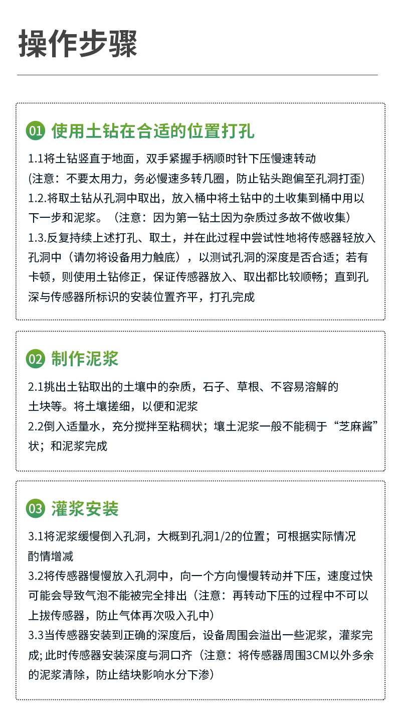 | 將土鉆豎直于地面,雙手緊握手柄順時(shí)針下壓慢速轉(zhuǎn)動(dòng)。(注意:不要太用力,務(wù)必慢速多轉(zhuǎn)幾圈,防止鉆頭跑偏至孔洞打歪) | 反復(fù)持續(xù)上述打孔、取土,并在此過程中嘗試性地將傳感器輕放入孔洞中(請(qǐng)勿將設(shè)備用力觸底),以測(cè)試孔洞的深度是否合適;若有卡頓,則使用土鉆修正,保證傳感器放入、取出都比較順暢;直到孔深與傳感器所標(biāo)識(shí)的安裝位置齊平,打孔完成 |