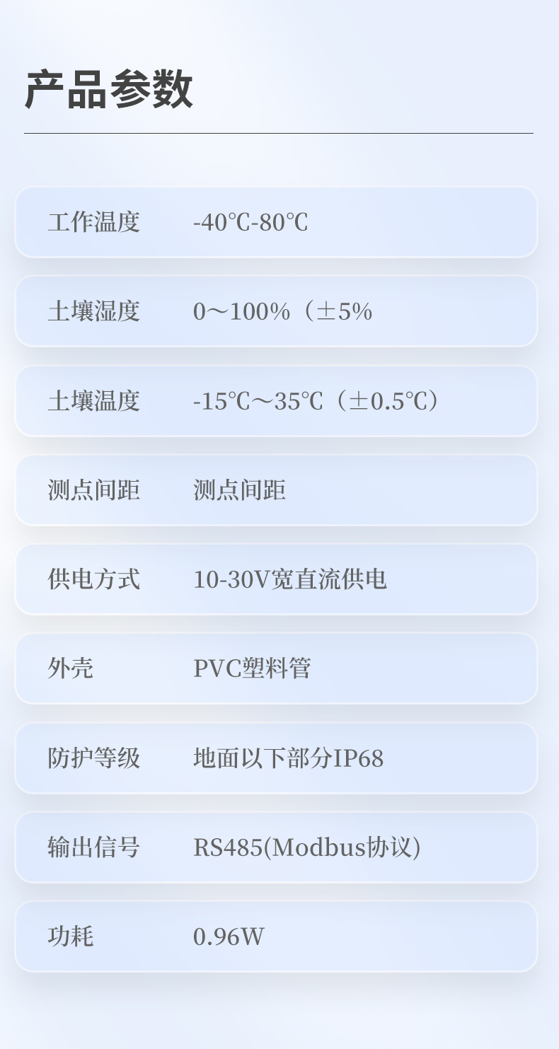 | 1、工作溫度:-40℃-80℃ | 2、土壤濕度:0~100%(±5%) | 3、土壤溫度:-15℃~35℃(±0.5℃) | 4、測(cè)點(diǎn)間距:10cm | 5、供電方式:10-30V寬直流供電 | 6、外殼:PVC塑料管 | 7、防護(hù)等級(jí):地面以下部分IP68 | 8、輸出信號(hào):RS485(Modbus協(xié)議) | 9、功耗:四層 0.9W |