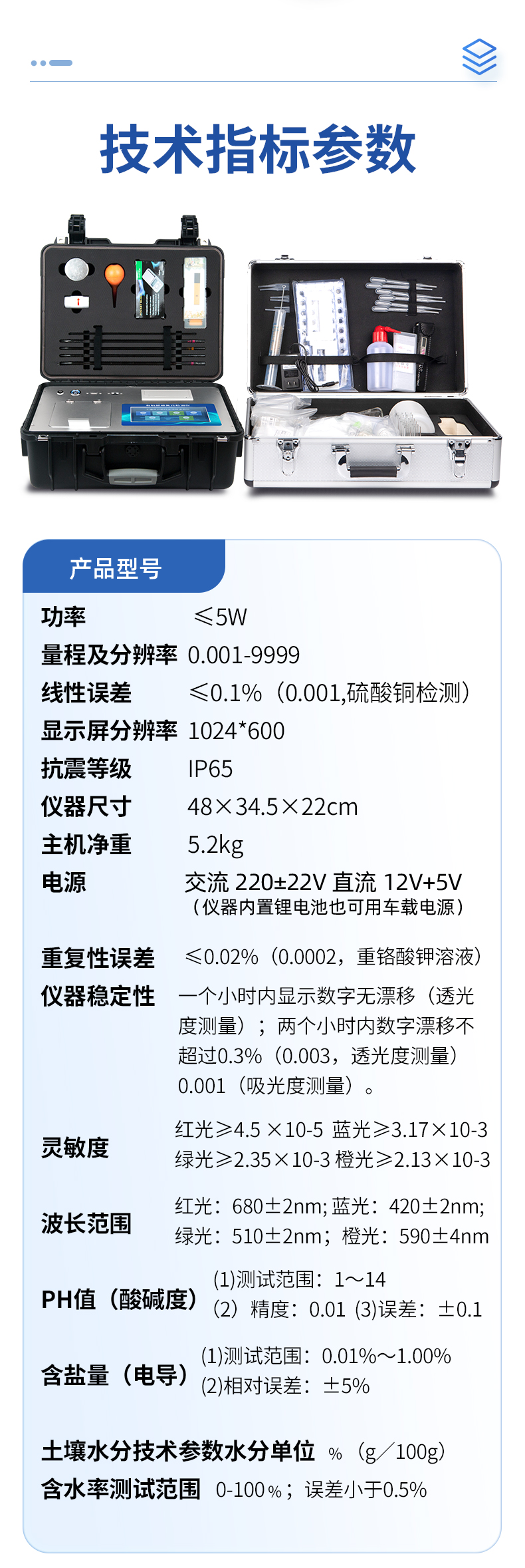 | 1、電源:交流 220±22V 直流 12V+5V(儀器內(nèi)置鋰電池也可用車載電源) | 2、功率: ≤5W | 3、量程及分辨率:0.001-9999 | 4、重復(fù)性誤差: ≤0.02%(0.0002,重鉻酸鉀溶液) | 5、儀器穩(wěn)定性:一個(gè)小時(shí)內(nèi)顯示數(shù)字無(wú)漂移(透光度測(cè)量);兩個(gè)小時(shí)內(nèi)數(shù)字漂移不超過(guò)0.3%(0.003,透光度測(cè)量)、0.001(吸光度測(cè)量)。 | 6、線性誤差: ≤0.1%(0.001,硫酸銅檢測(cè)) | 7、靈敏度:紅光≥4.5 ×10-5 藍(lán)光≥3.17×10-3 綠光≥2.35×10-3 橙光≥2.13×10-3 | 8、波長(zhǎng)范圍 :紅光:680±2nm; 藍(lán)光:420±2nm; 綠光:510±2nm;橙光:590±4nm | 9、PH值(酸堿度): (1)測(cè)試范圍:1~14 (2)精度:0.01 (3)誤差:±0.1 | 10、含鹽量(電導(dǎo)):(1)測(cè)試范圍:0.01%~1.00% (2)相對(duì)誤差:±5% | 11、土壤水分技術(shù)參數(shù)水分單位:﹪(g/100g);含水率測(cè)試范圍:0-100﹪;誤差小于0.5% | 12、顯示屏分辨率:1024*600 | 13、抗震等級(jí):IP65 | 14、儀器尺寸:48×34.5×22cm。 | 15、主機(jī)凈重:5.2kg | 16、包裝尺寸:510*390*375mm | 17、包裝重量:11.5kg |