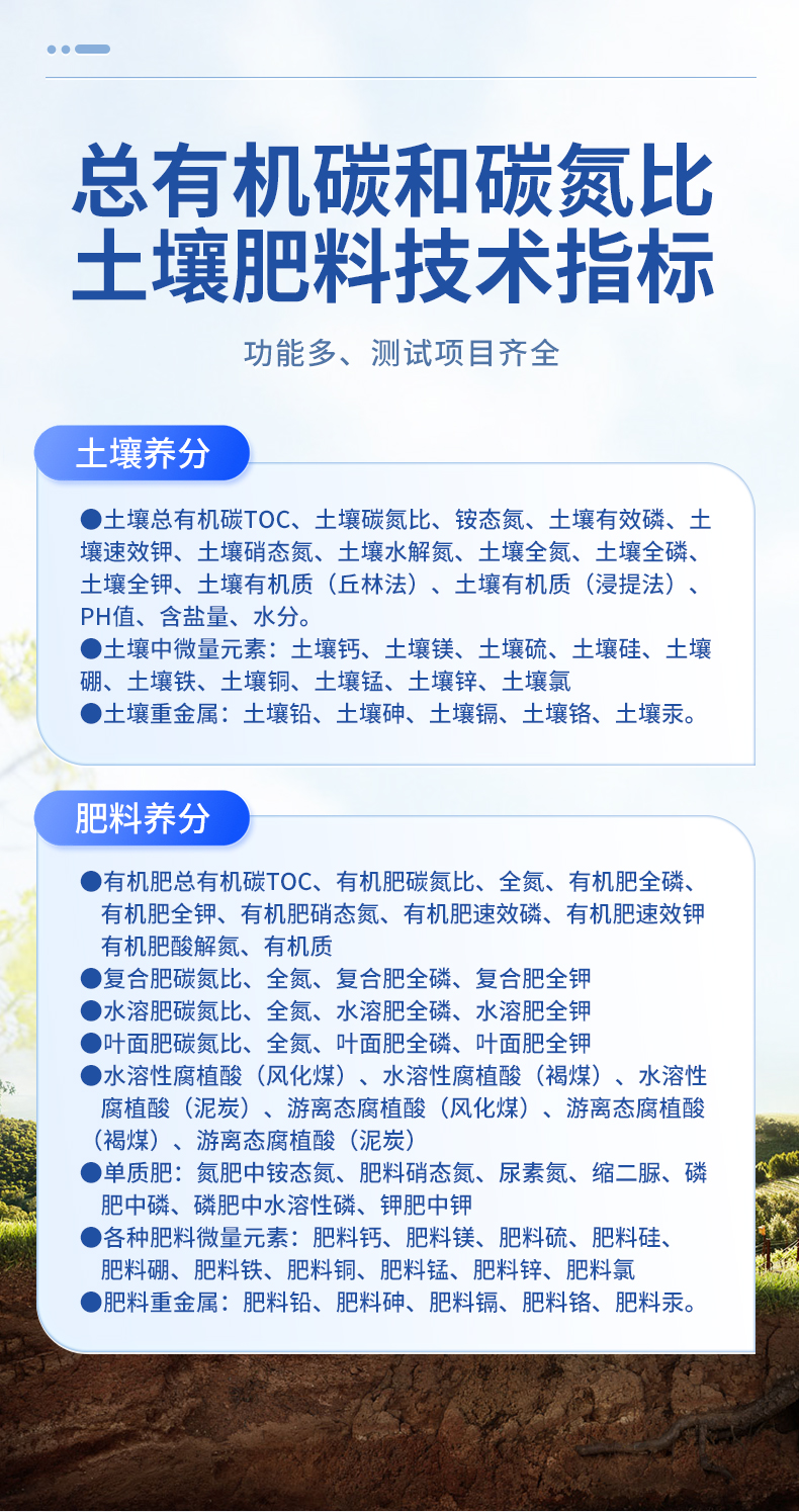 | 1、土壤養(yǎng)分:●土壤銨態(tài)氮、土壤有效磷、土壤速效鉀、土壤硝態(tài)氮、土壤水解氮、土壤全氮、土壤全磷、土壤全鉀、土壤有機(jī)質(zhì)(丘林法)、土壤有機(jī)質(zhì)(浸提法)、土壤總有機(jī)碳、土壤碳氮比、PH值、含鹽量、水分?!裢寥乐形⒘吭兀和寥棱}、土壤鎂、土壤硫、土壤硅、土壤硼、土壤鐵、土壤銅、土壤錳、土壤鋅、土壤氯、土壤鉬;●土壤重金屬:土壤鉛、土壤砷、土壤鎘、土壤鉻、土壤汞、土壤鎳、土壤鋁、土壤氟、土壤鈦、土壤硒。 | 2、肥料養(yǎng)分:●單質(zhì)肥:氮肥中銨態(tài)氮、肥料硝態(tài)氮、尿素氮、縮二脲、磷肥中磷、磷肥中水溶性磷、鉀肥中鉀;●復(fù)合肥全氮、復(fù)合肥全磷、復(fù)合肥全鉀;●有機(jī)肥全氮、有機(jī)肥全磷、有機(jī)肥全鉀、有機(jī)肥硝態(tài)氮、有機(jī)肥速效磷、有機(jī)肥速效鉀、有機(jī)肥酸解氮、有機(jī)質(zhì);●水溶性腐植酸(風(fēng)化煤)、水溶性腐植酸(褐煤)、水溶性腐植酸(泥炭)、游離態(tài)腐植酸(風(fēng)化煤)、游離態(tài)腐植酸(褐煤)、游離態(tài)腐植酸(泥炭);●水溶肥全氮、水溶肥全磷、水溶肥全鉀;●葉面肥全氮、葉面肥全磷、葉面肥全鉀;●各種肥料微量元素:肥料鈣、肥料鎂、肥料硫、肥料硅、肥料硼、肥料鐵、肥料銅、肥料錳、肥料鋅、肥料氯、肥料鉬;●肥料重金屬:肥料鉛、肥料砷、肥料鎘、肥料鉻、肥料汞、肥料鎳、肥料鋁、肥料氟、肥料鈦、肥料硒。 | 3、鮮作物營(yíng)養(yǎng):●作物硝態(tài)氮、作物銨態(tài)氮、作物磷、作物鉀;●作物中微量元素:作物鈣、作物鎂、作物硫、作物硅、作物硼、作物鐵、作物銅、作物錳、作物鋅、作物氯、作物鉬;●作物中硝酸鹽、亞硝酸鹽。 | 4、干植株?duì)I養(yǎng):●植株全氮、植株全磷、植株全鉀 | 5、煙葉營(yíng)養(yǎng):●全氮、全磷、全鉀、還原糖、水溶性總糖、硼、錳、鐵、銅、鈣、鎂等20項(xiàng)。 | 6、食品(水果、蔬菜等):●硝酸鹽、亞硝酸鹽、重金屬(鉛、鉻、鎘、砷、汞)等項(xiàng)。 | 7、水質(zhì)中:●銨態(tài)氮、水中磷、水中鉀、硝酸鹽、亞硝酸鹽、硬度、PH、鐵、銅、錳、鋅、硼、氯、硫、硅、鉬等 |