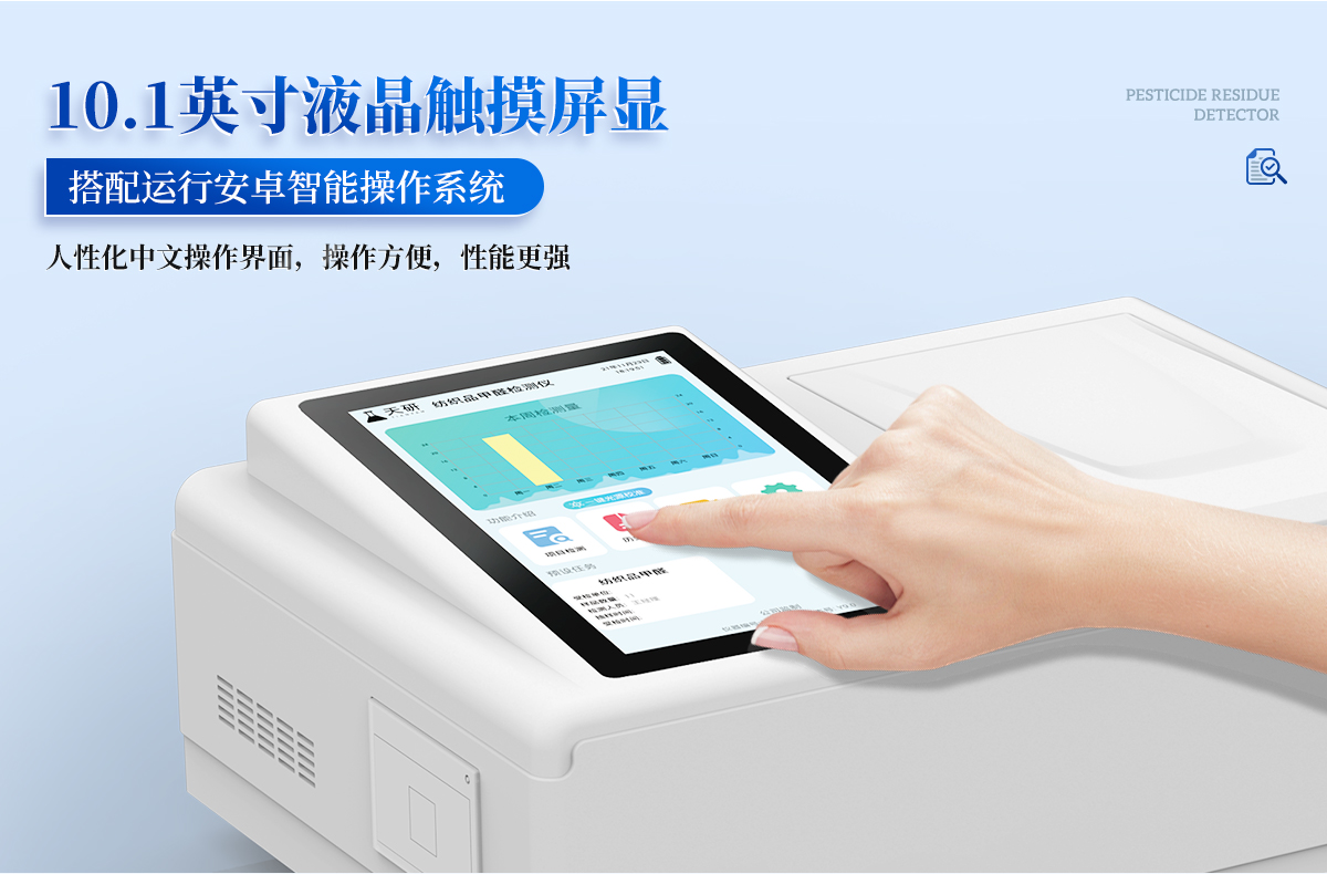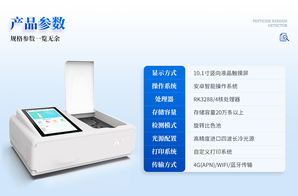 | 1. 儀器采用臺式一體化系統(tǒng)檢測技術(shù),新型農(nóng)殘檢測模塊、數(shù)字化管理模塊、無線通訊模塊高度集成于一體,同時預(yù)留升級檢測方法。 | 2. 儀器檢測模塊標準化、智能化,可隨意自由組合。檢測箱體內(nèi)置多個標準檢測單元,檢測模塊可以調(diào)整配置。 | 3. 儀器采用全新安卓智能系統(tǒng),主控芯片采用 ARM Cortex-A7,RK3288/4核處理器,10.1寸高清液晶觸摸豎屏,更加流暢的UI交互界面,運轉(zhuǎn)快捷;儀器配備無線通信模塊: 4G(APN)通訊模塊、Wifi模塊,藍牙傳輸,同時具有雙USB接口以及RJ45接口能以多種方式實現(xiàn)數(shù)據(jù)保存和數(shù)據(jù)傳輸功能。 | 4. 創(chuàng)新檢測模式: 檢測通道:≥24通道;采用精密旋轉(zhuǎn)比色池設(shè)計,使用同芯片同光源校準精度,解決不同光源之間的誤差值。1-12通道間誤差0.1%。(**號:ZL202022821055.2) 儀器具有自動識別比色皿檢測功能,即:將樣品比色皿放入儀器后,點擊樣品檢測,儀器自動識別比色皿進行通道檢測。 | 5. 進口高精光源: 高精度進口四波長冷光源,通道配置 410、520、590、630nm 波長光源,一個光源芯片驅(qū)動一個光源,誤差極小,每臺設(shè)備單獨校準光源,準確比對,同時參照四種不同波段光源全方位覆蓋市面上99%的農(nóng)殘食品項目檢測,可按照實際需求進行食品項目檢測升級。 |